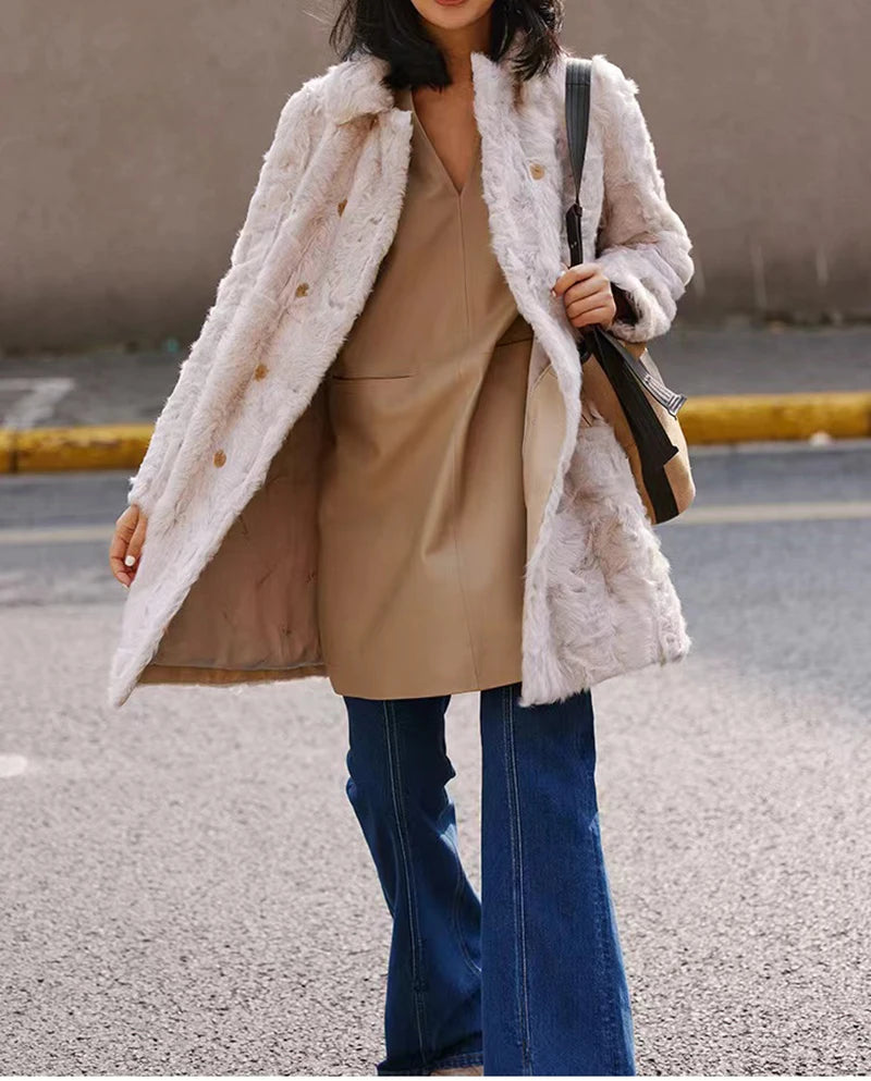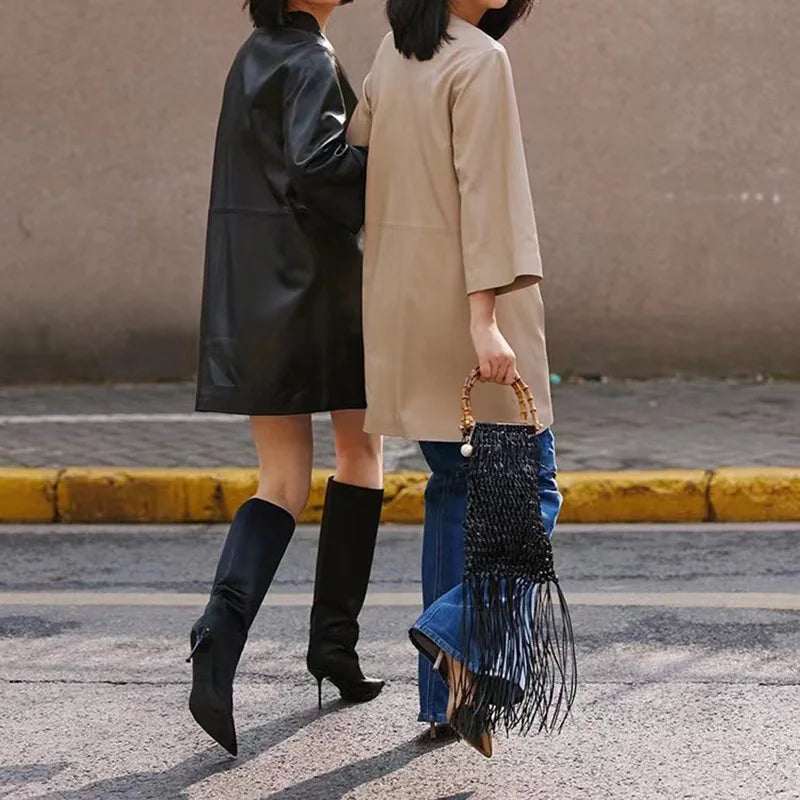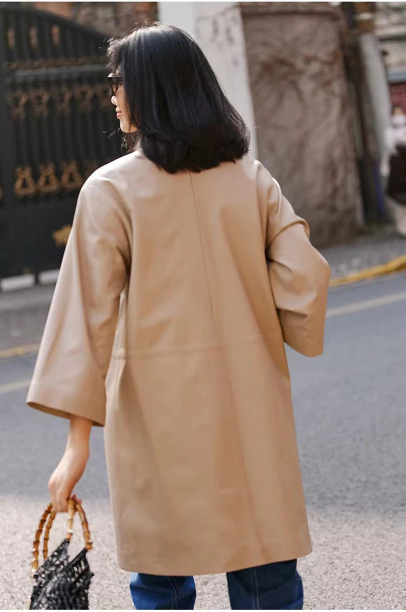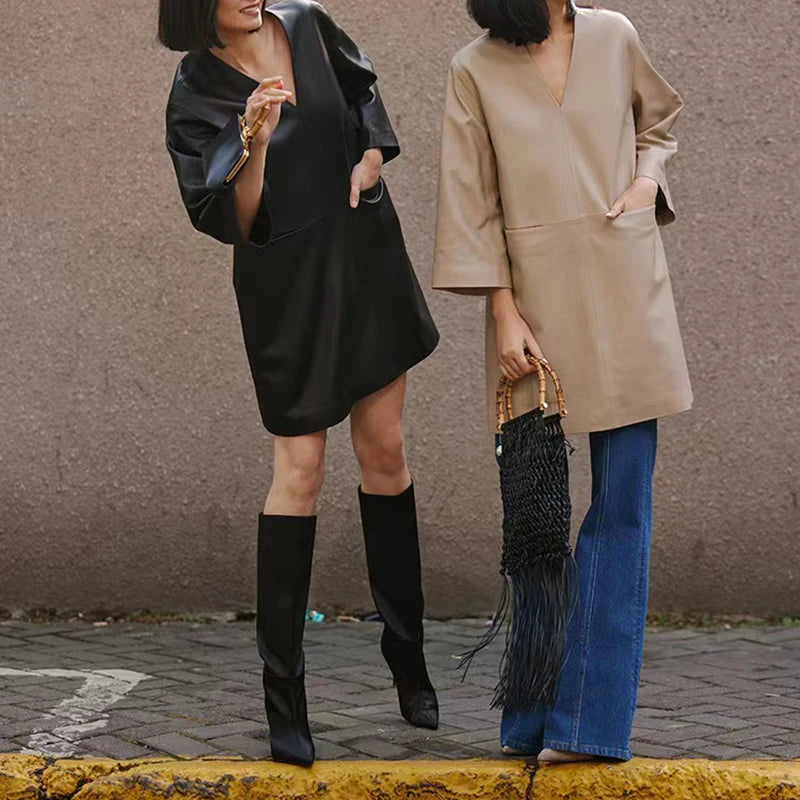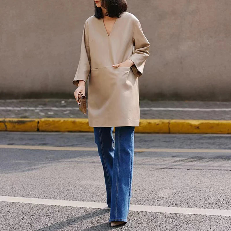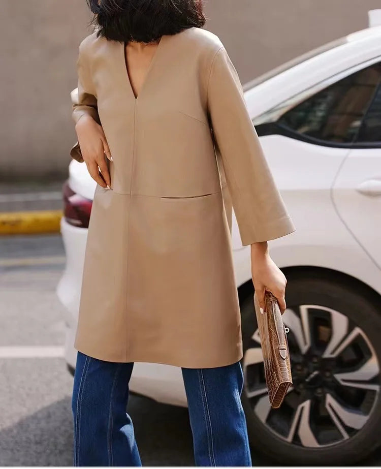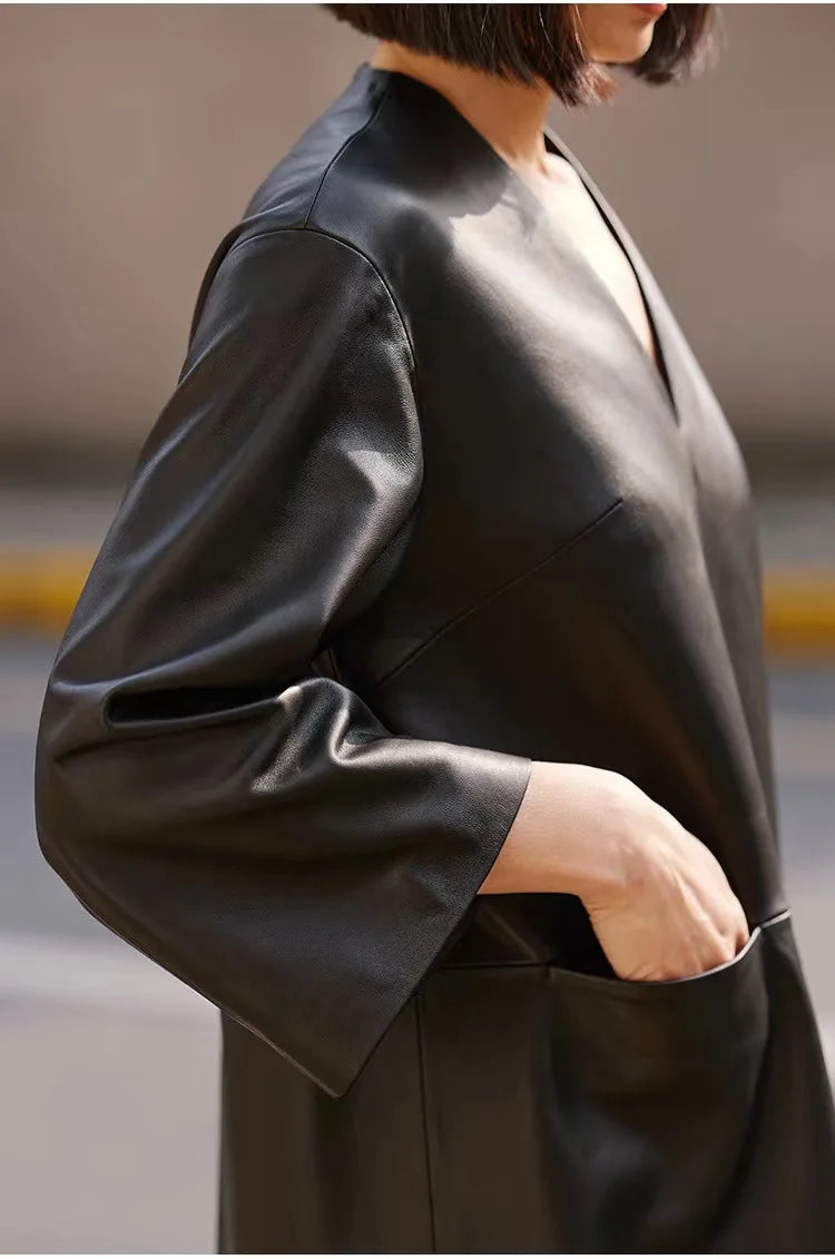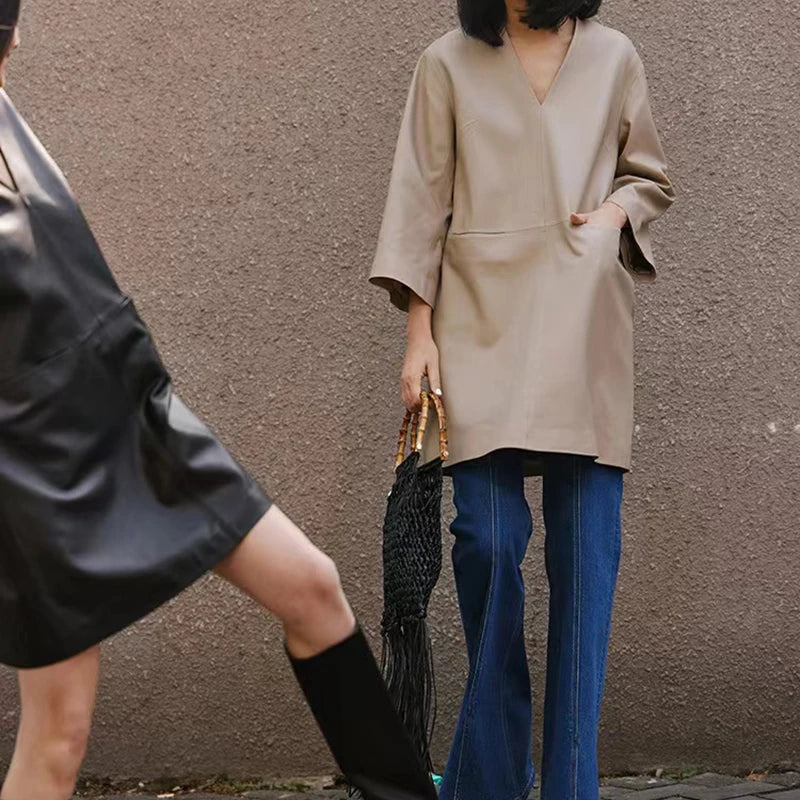 Spring Autumn V-Neck 8-Point Sleeve Loose Real Leather Jacket Dress for Women