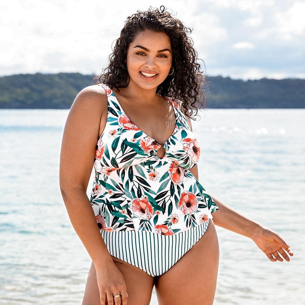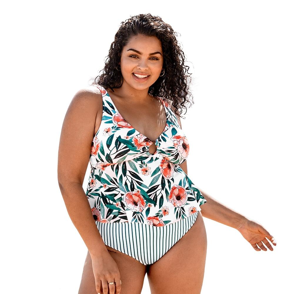 Traje de baño de dos piezas de bikini de cintura alta con rayas florales de talla grande para mujer sexy