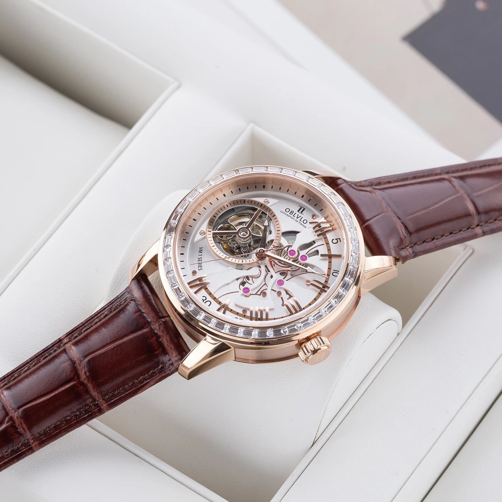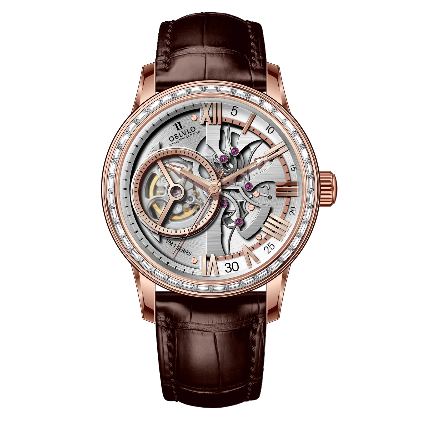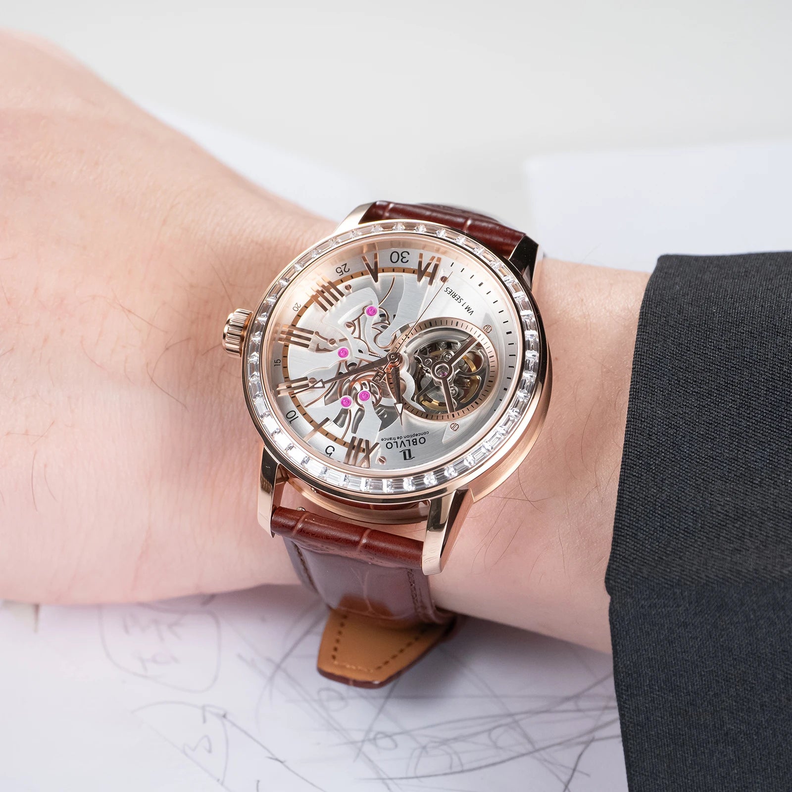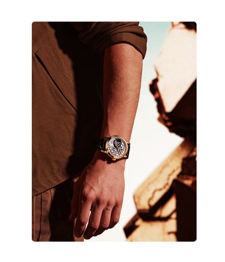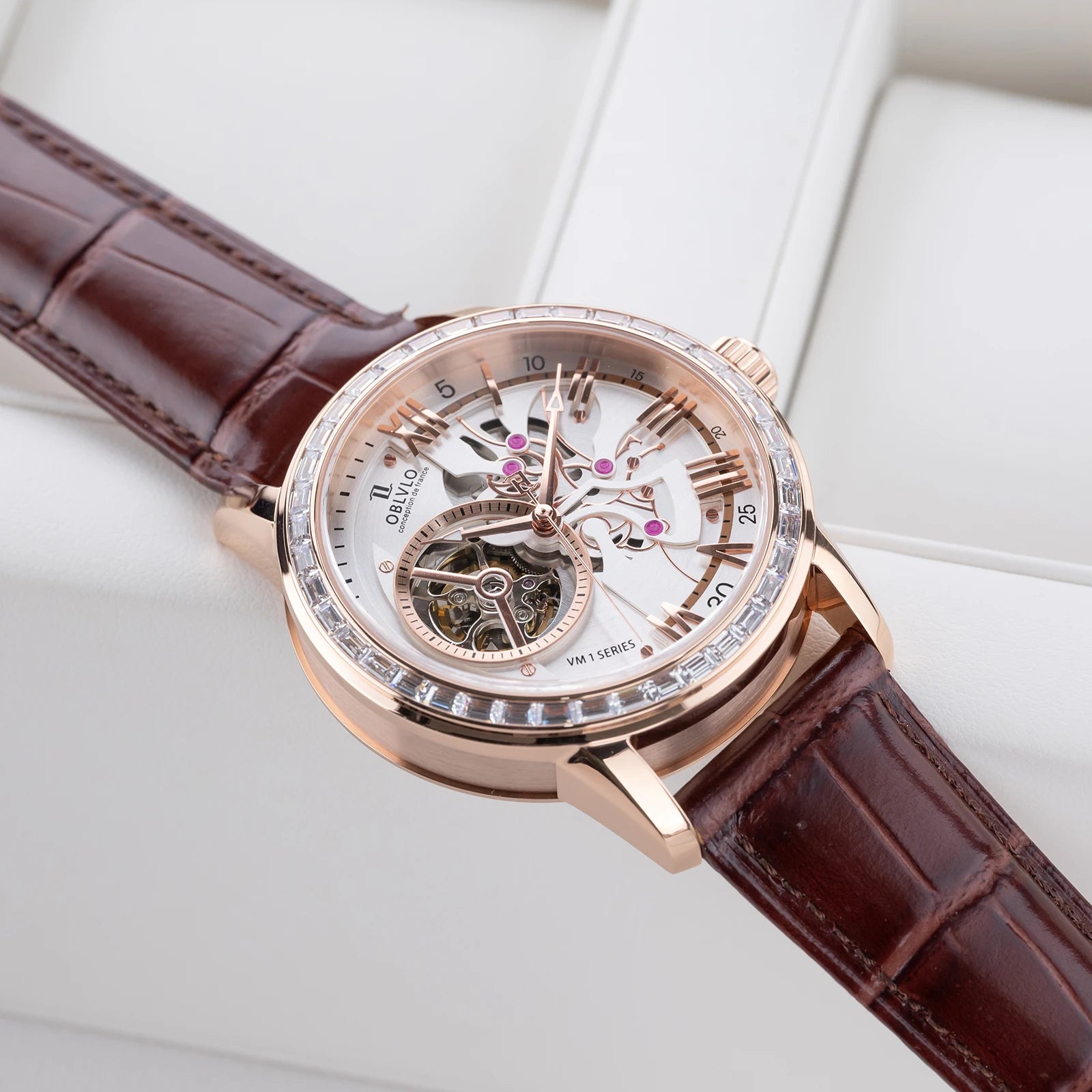 Men's Retro Fashion Tourbillon Diamonds Decor Automatic Genuine Leather Mechanical Watch