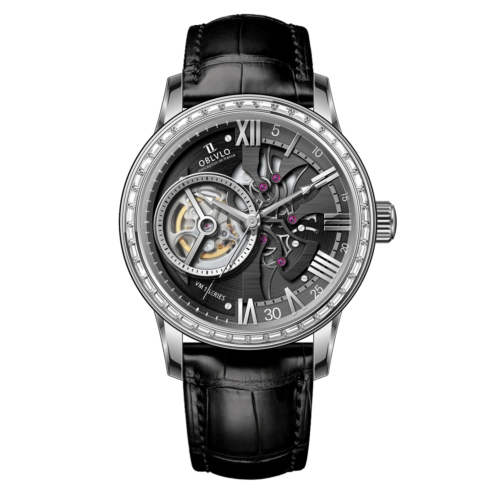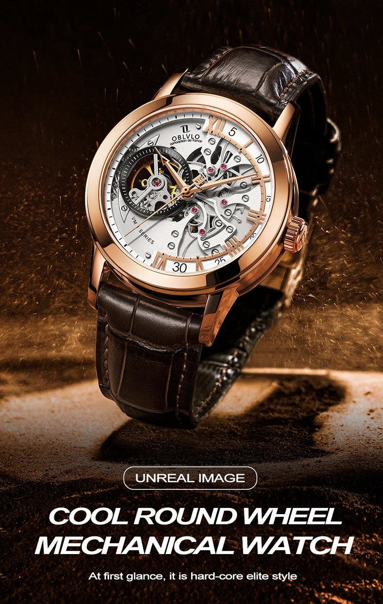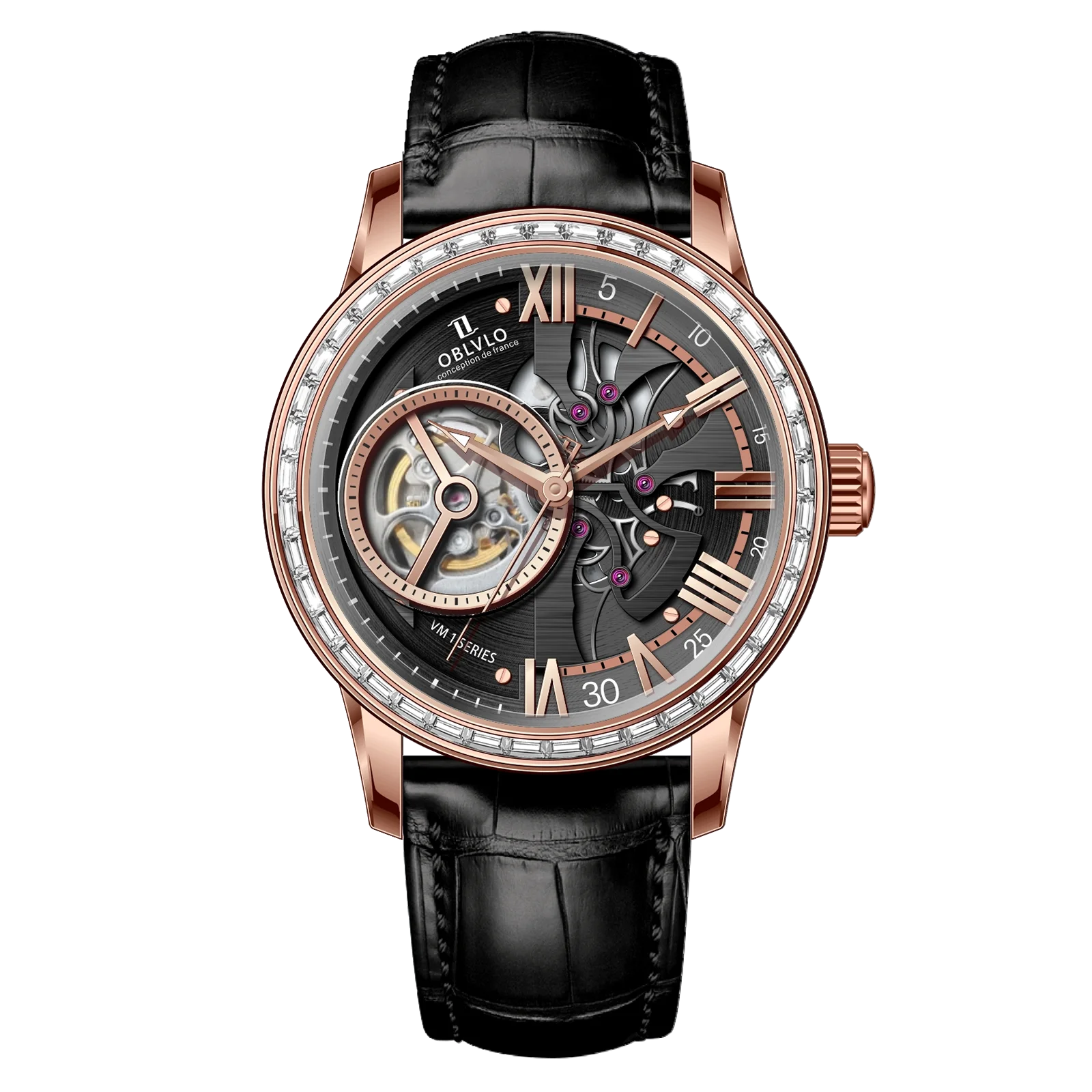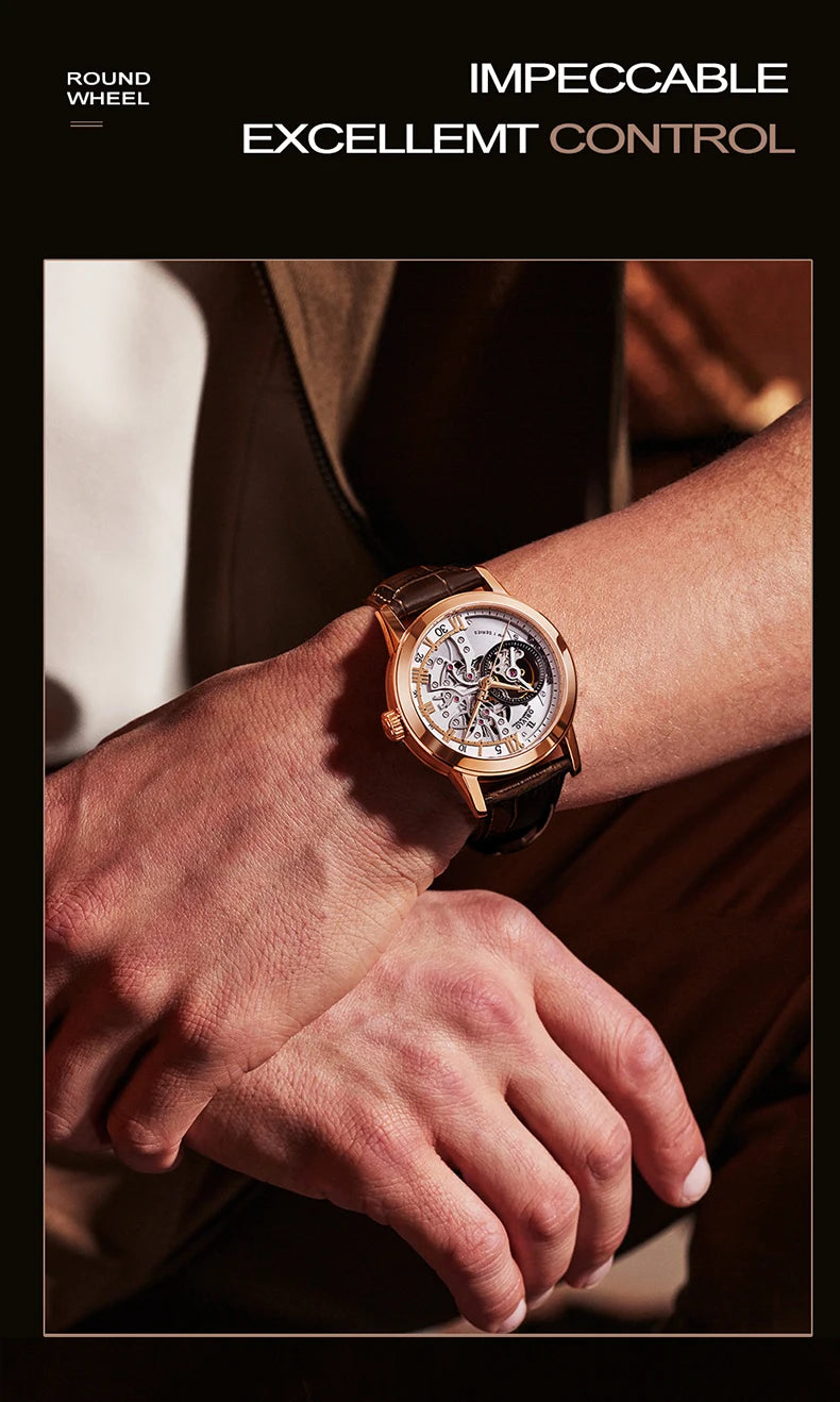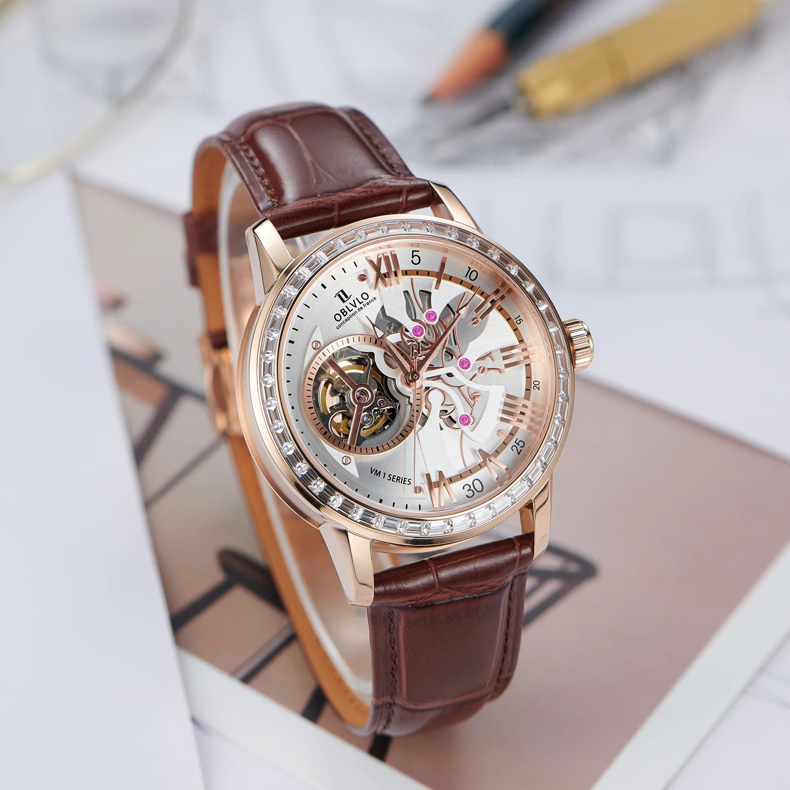 Men's Retro Fashion Tourbillon Diamonds Decor Automatic Genuine Leather Mechanical Watch