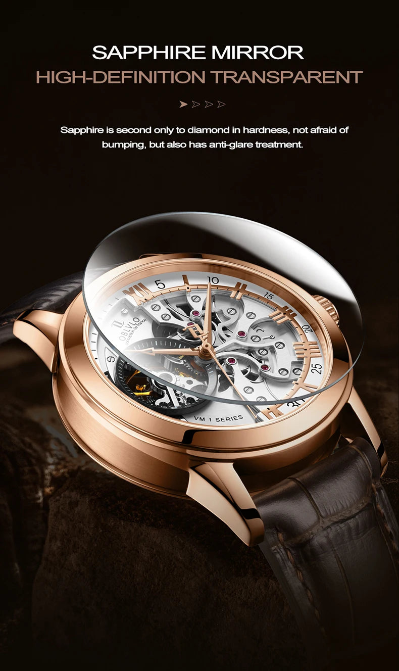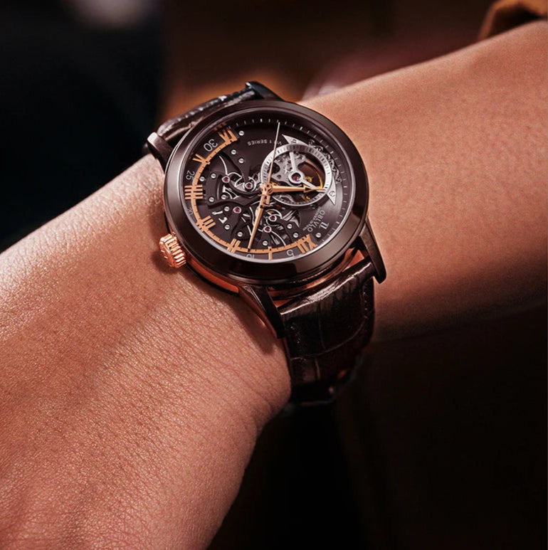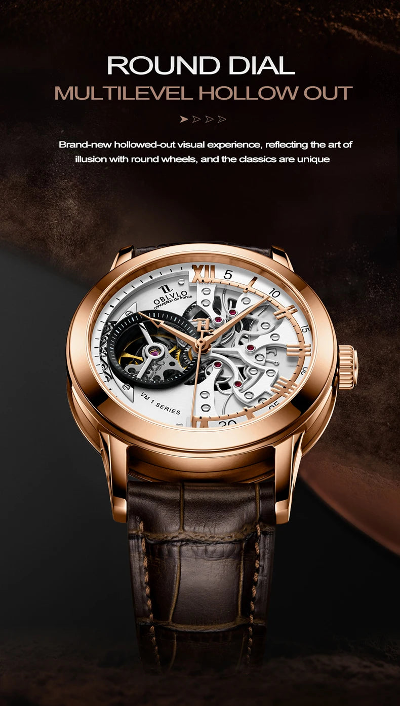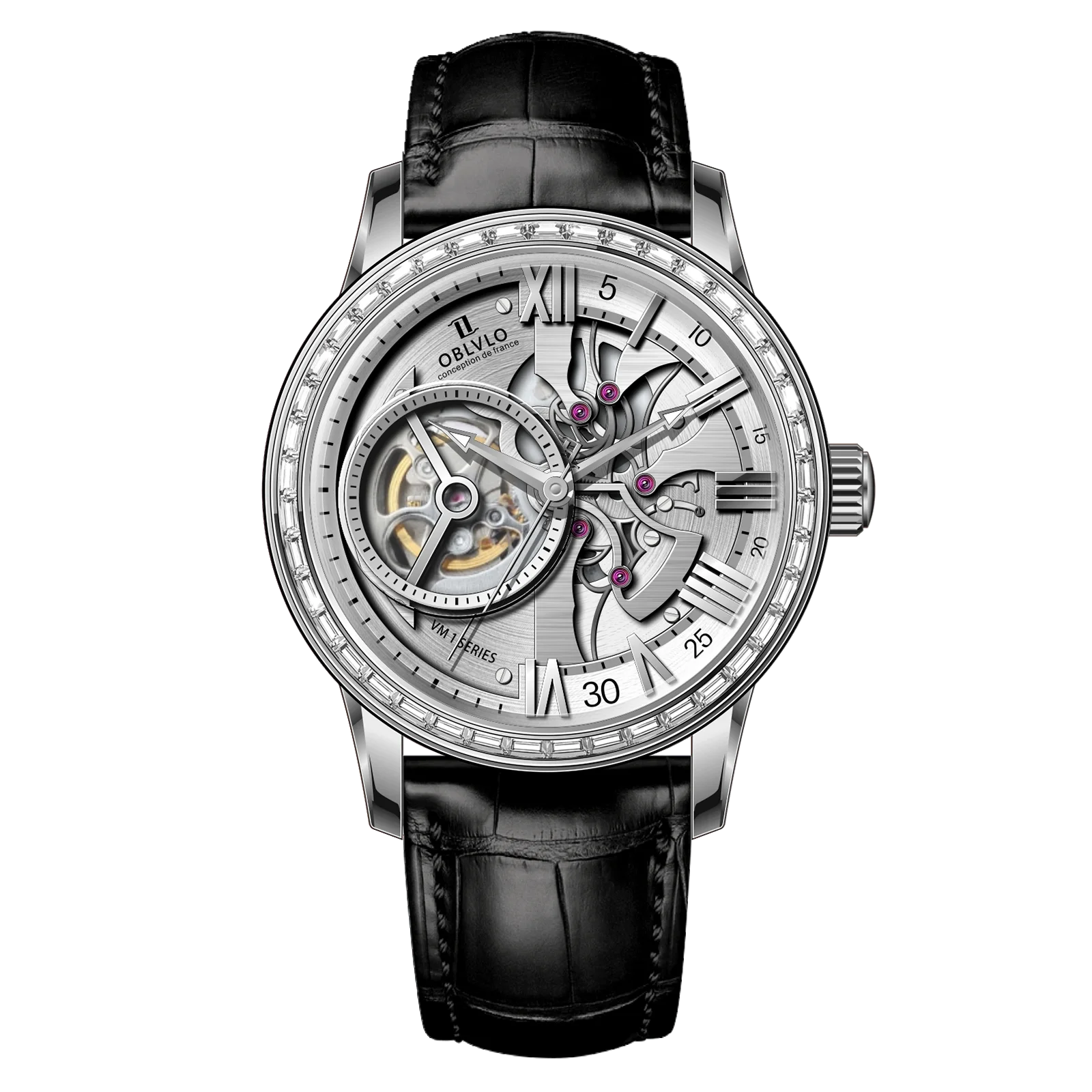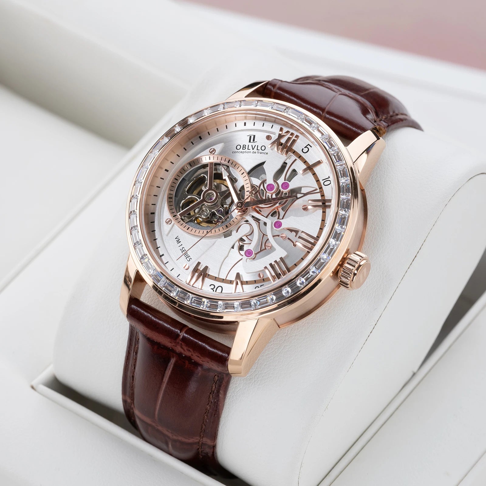 Men's Retro Fashion Tourbillon Diamonds Decor Automatic Genuine Leather Mechanical Watch