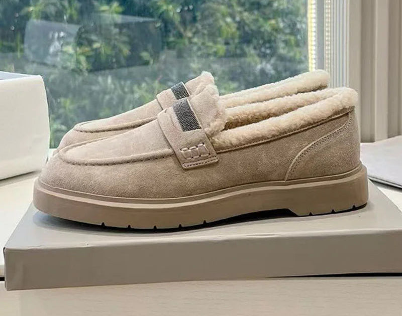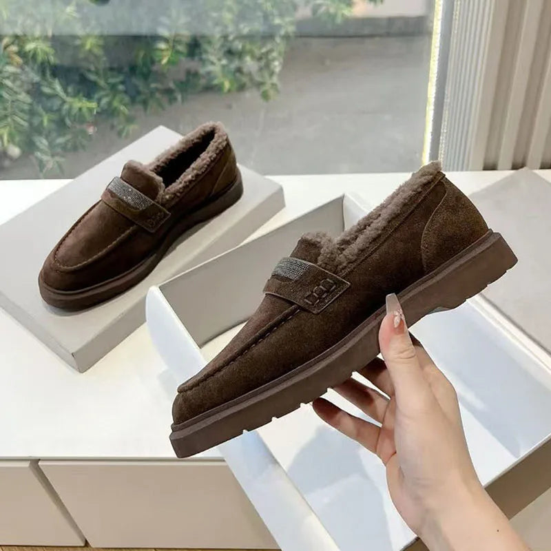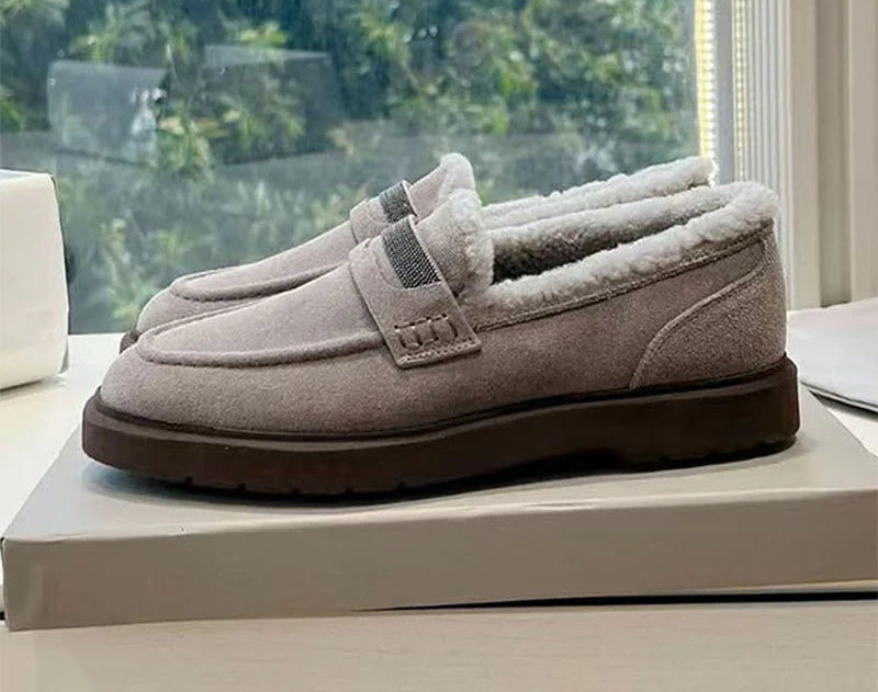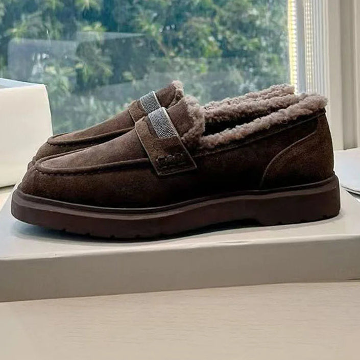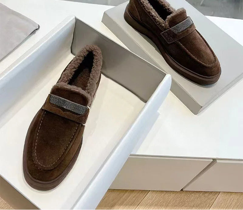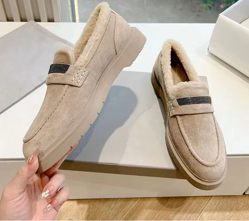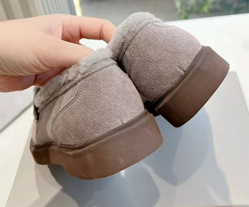 Women's Winter Casual Style Round Toe Warm Wool Cow Suede Loafers