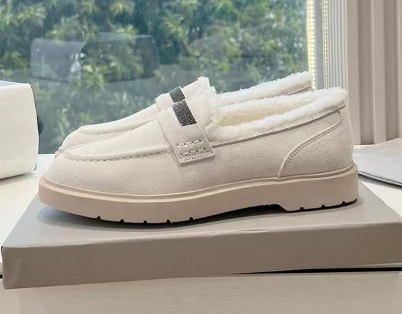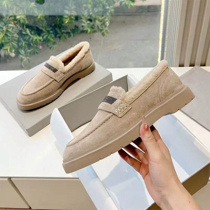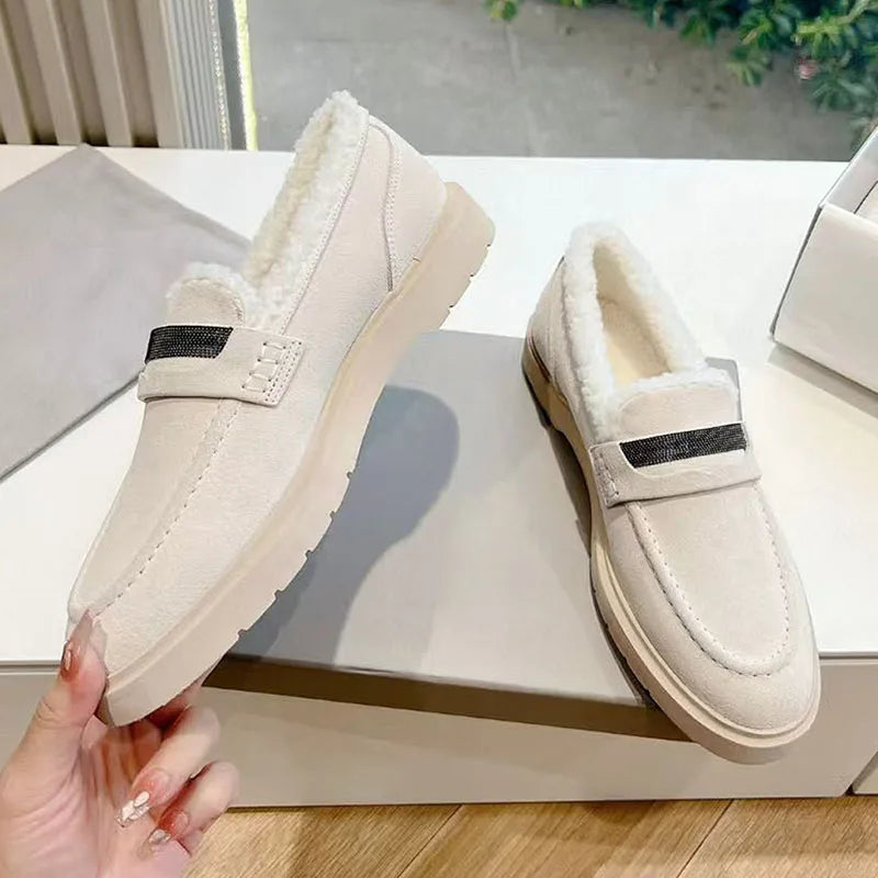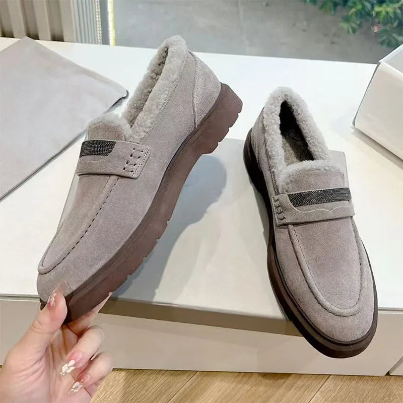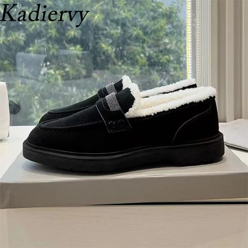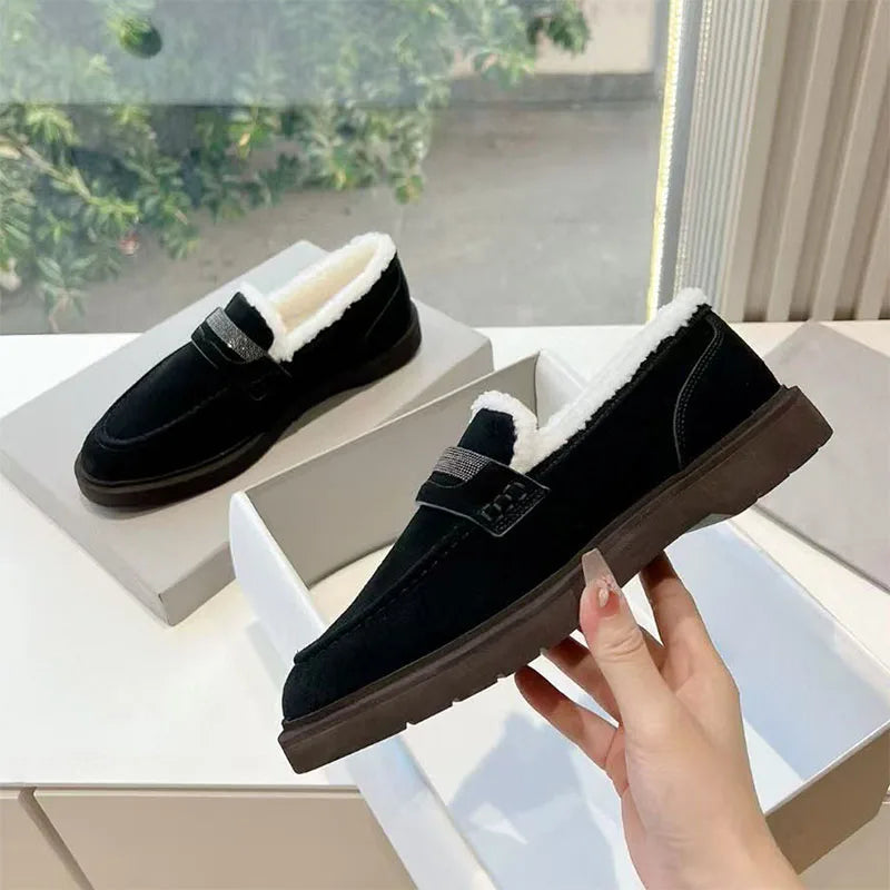 Women's Winter Casual Style Round Toe Warm Wool Cow Suede Loafers