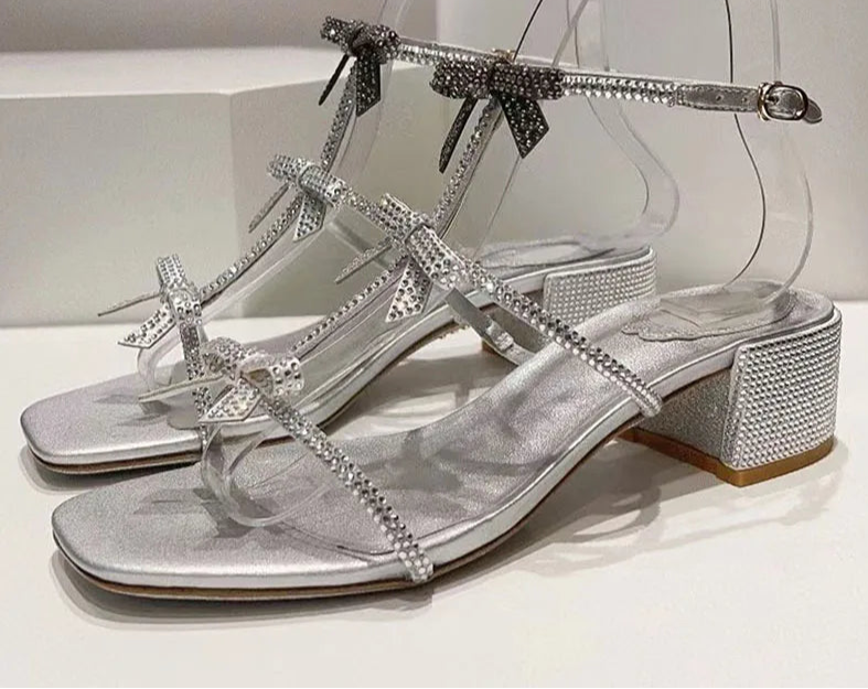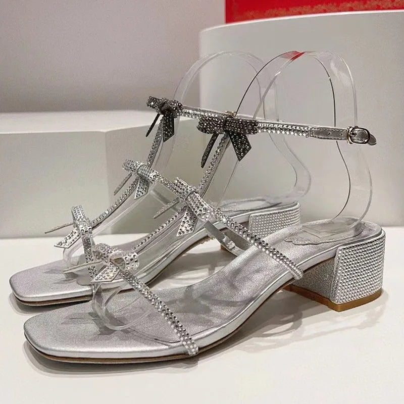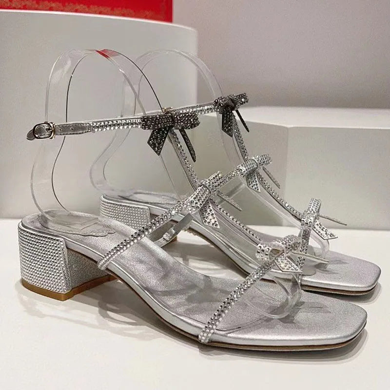 Silver Chunky Square Heels Rhinestone Ankle Buckle Strap Sandals for Women