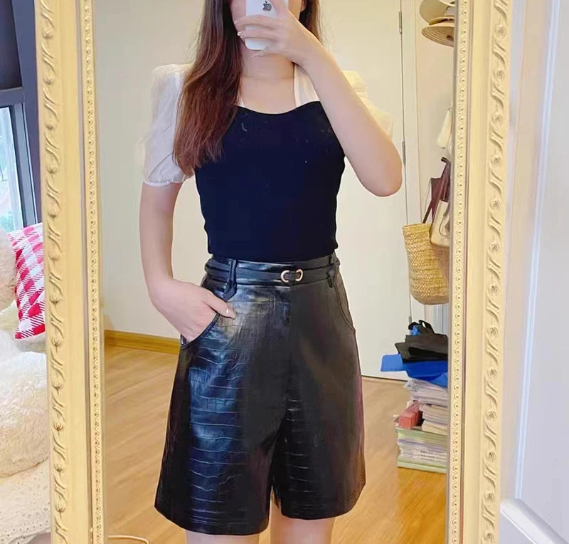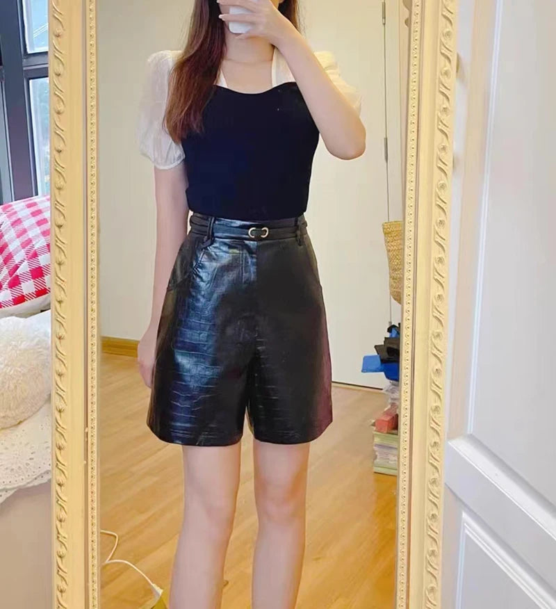 If you are looking for an aesthetic and classy women's shorts, then this is for you. Designed with sheepskin leather featuring a bold alligator pattern, these black shorts are durable and pair well with every style of top to make a style statement. Order now!