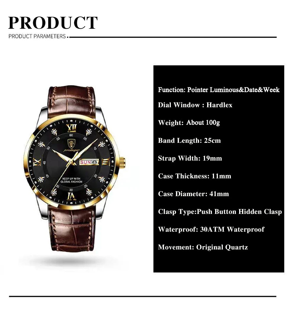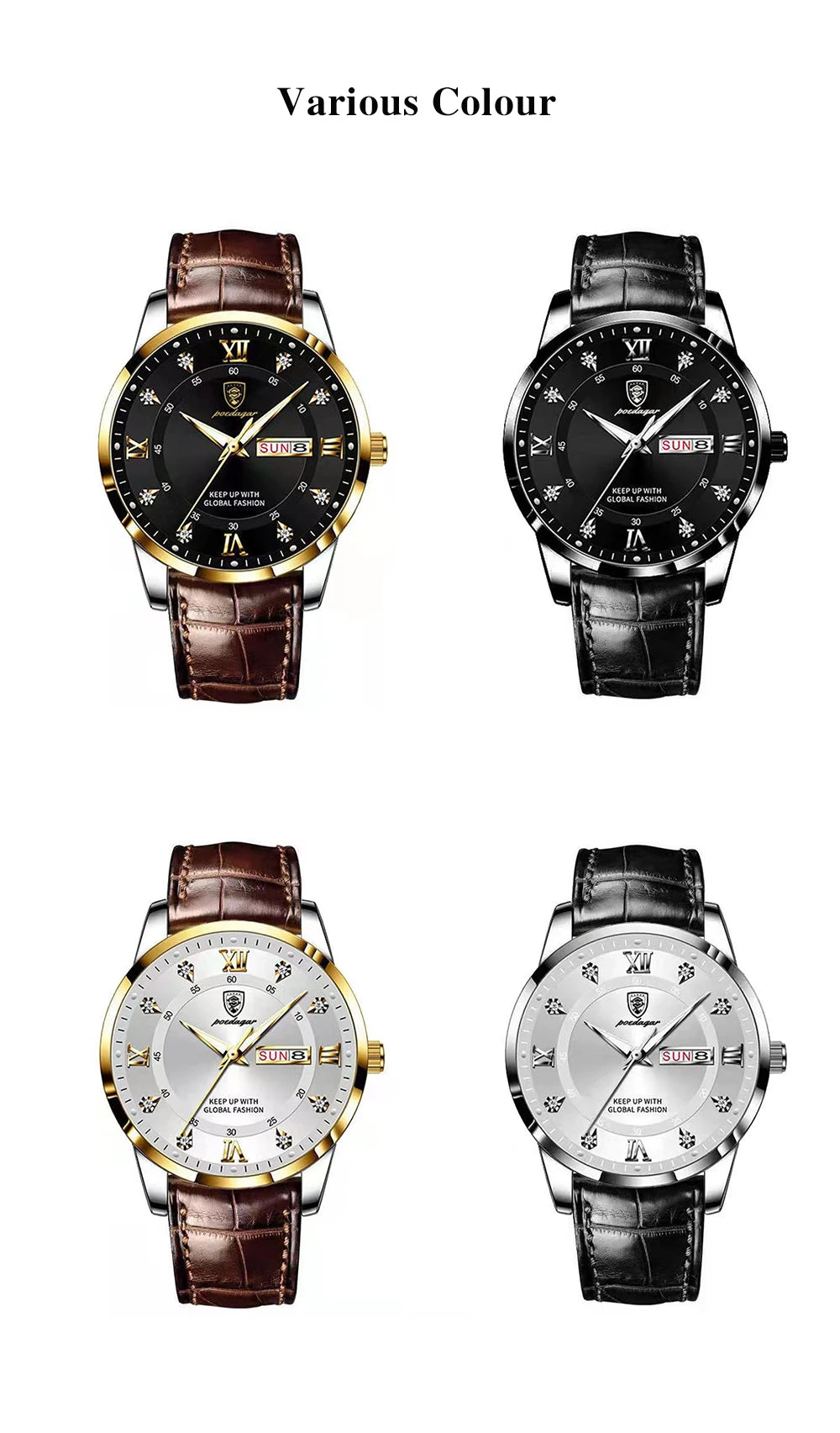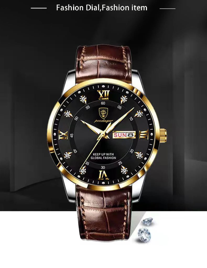 Men's Luxury Fashion Leather Waterproof Luminous Week Date Quartz Wristwatch