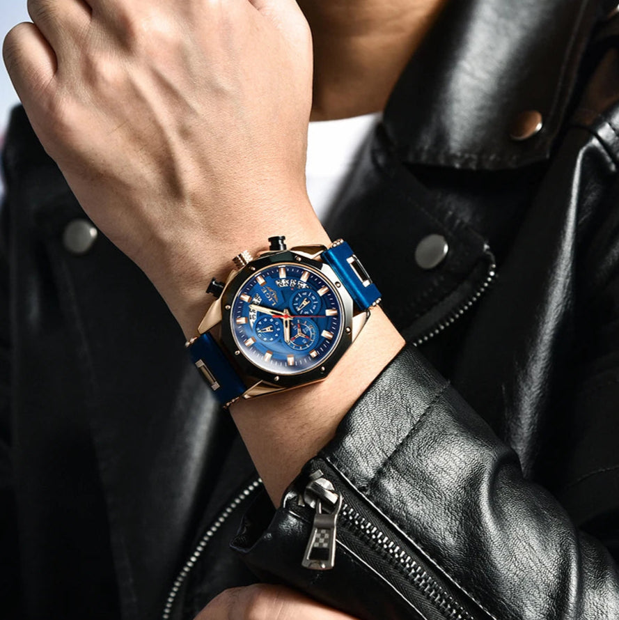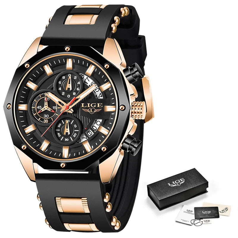 Complementing any outfit effortlessly, this exceptional men's quartz watch will add a finishing touch to your look. Made with a silicone strap and stainless steel casing, this watch sits comfortably on your wrist. An exceptional waterproof watch with stopwatch, auto date and complete calendar. Buy now!
