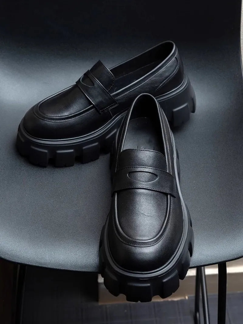 Men's Genuine Leather Slip-On Round Toe British Style Platform Dress Loafers