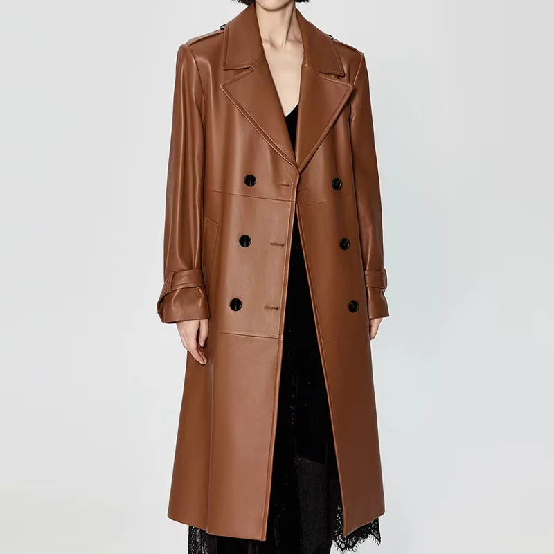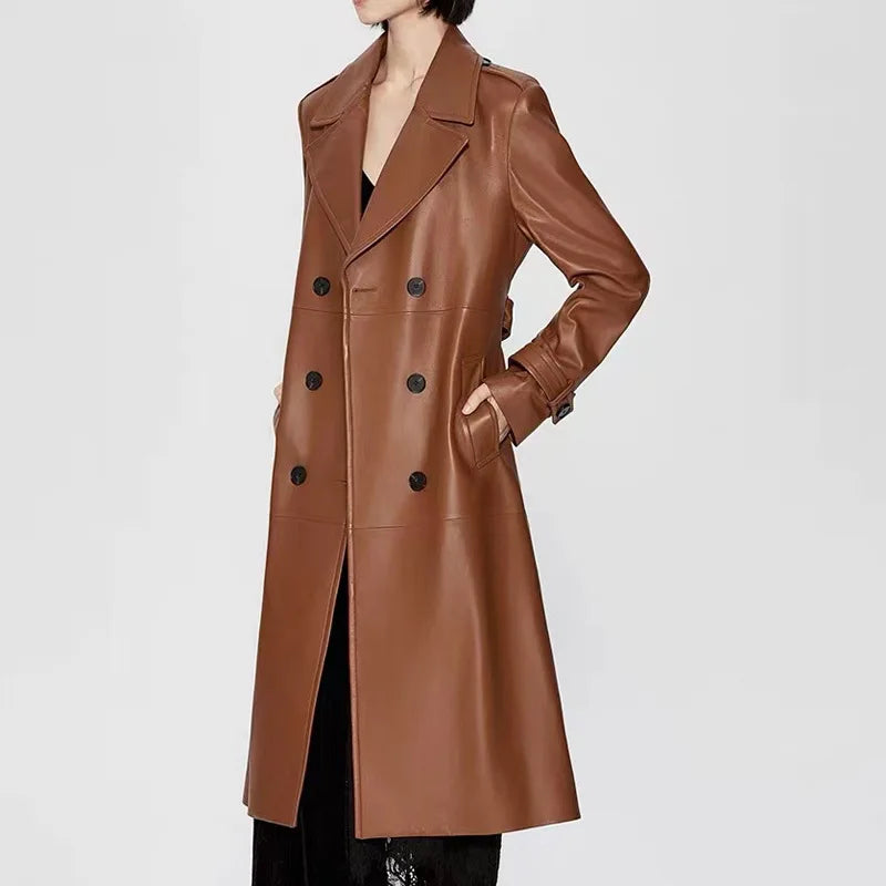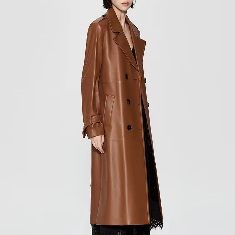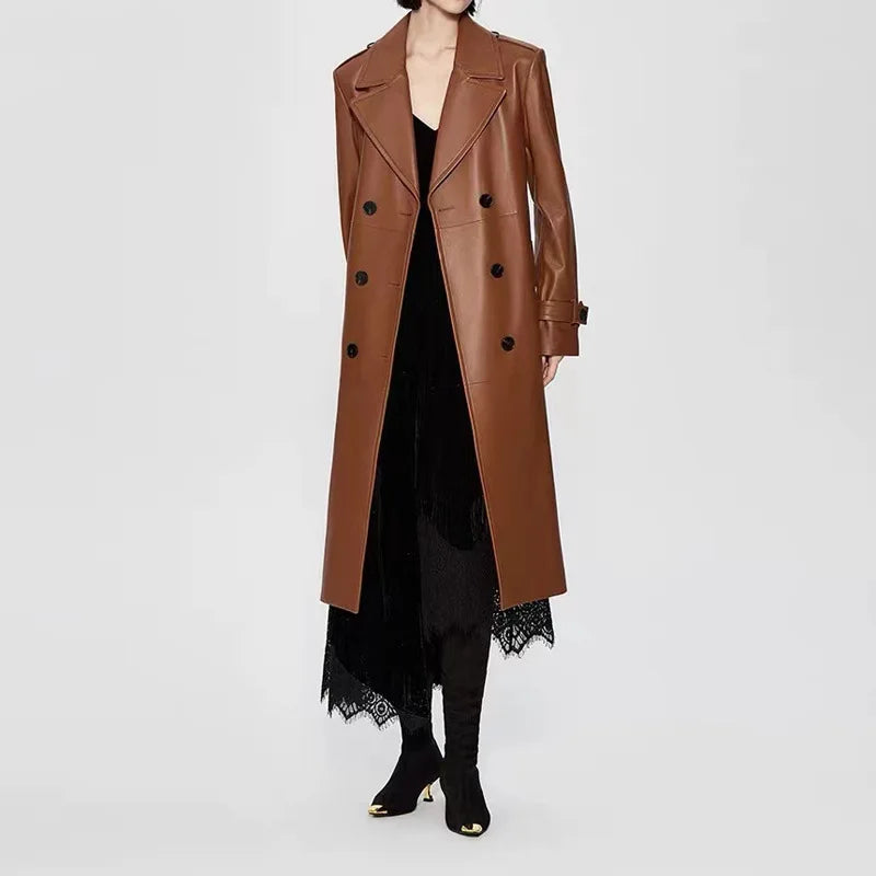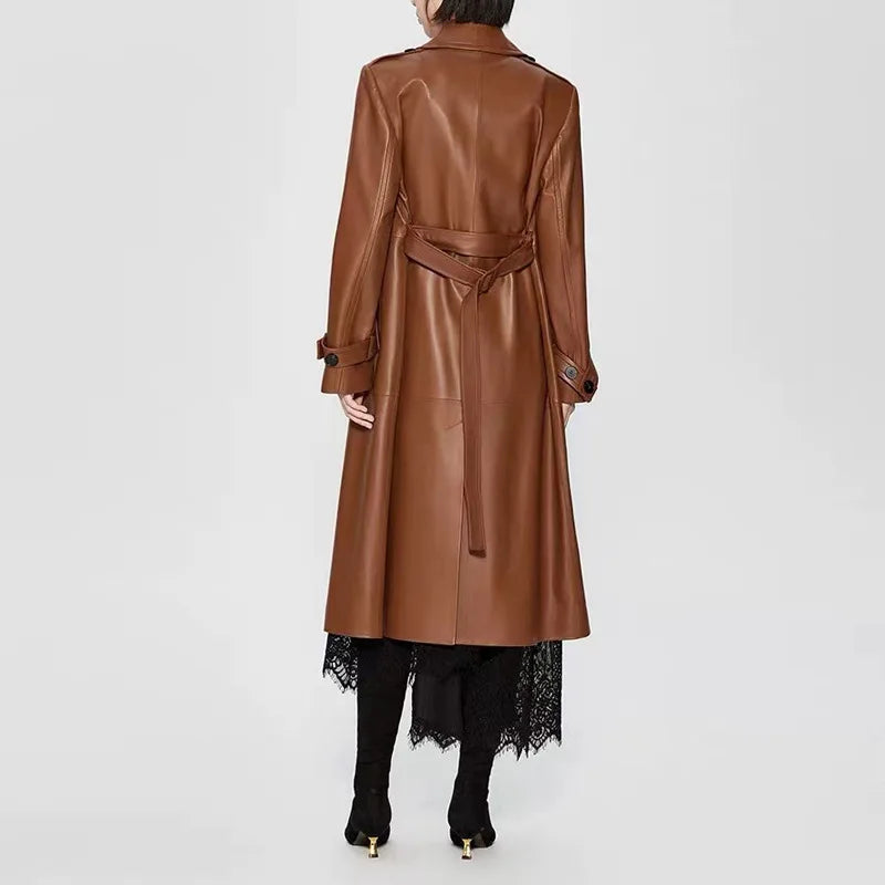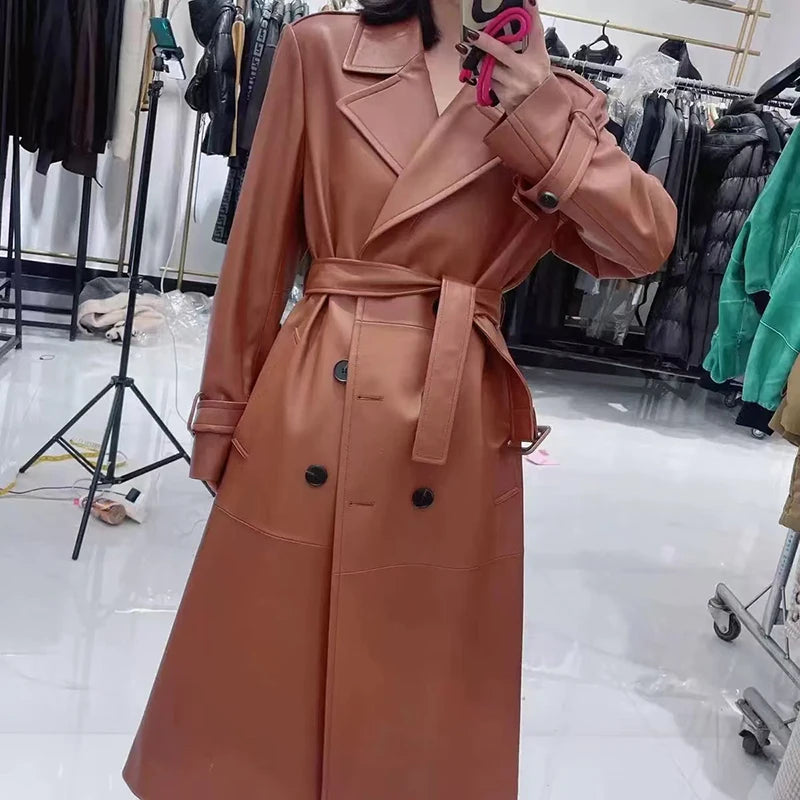 Retro British Style Lapel Double Breasted Belt Loose Leather Trench Coat for Women