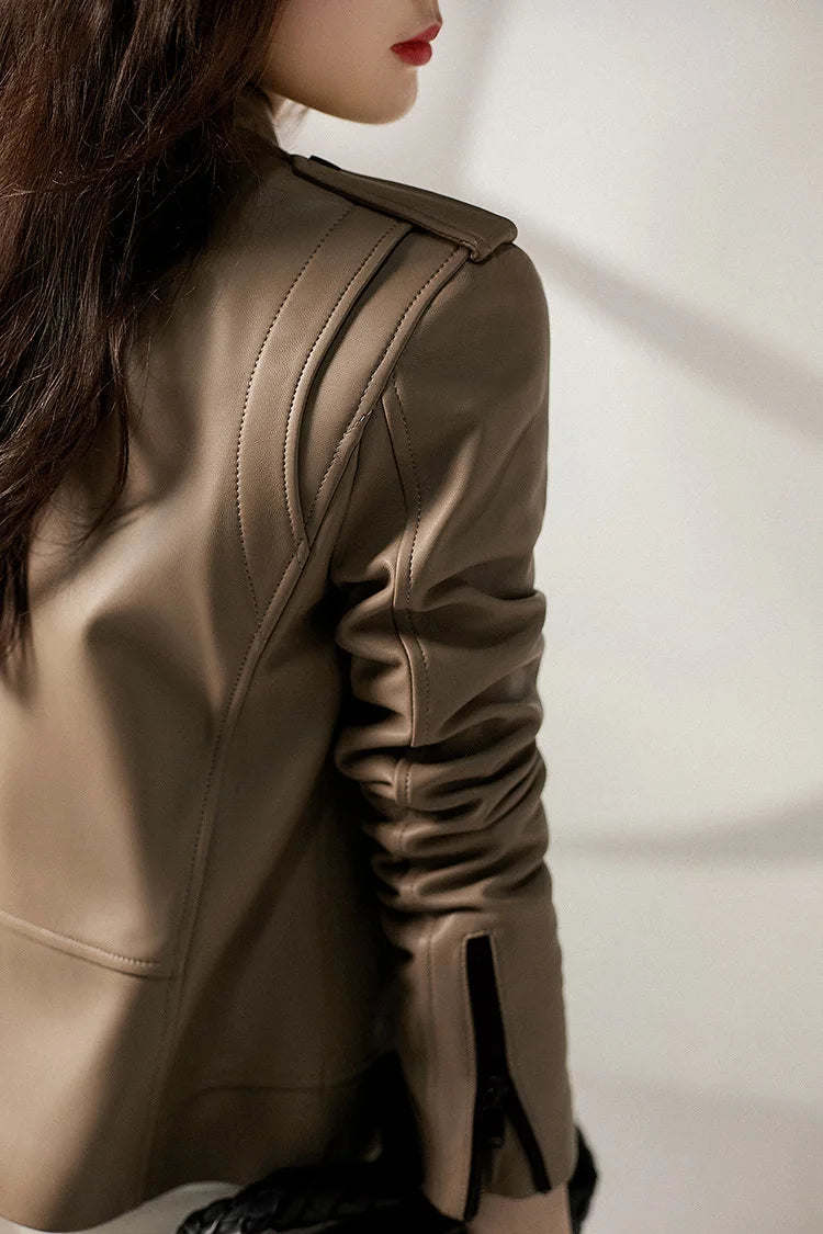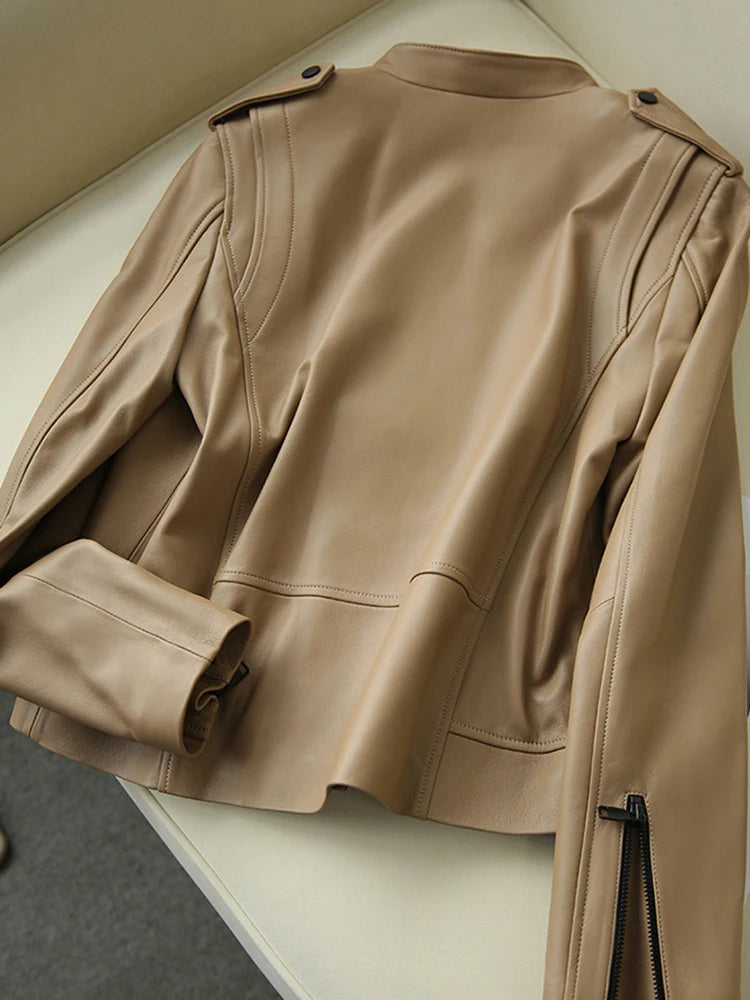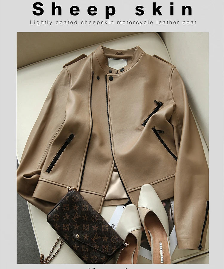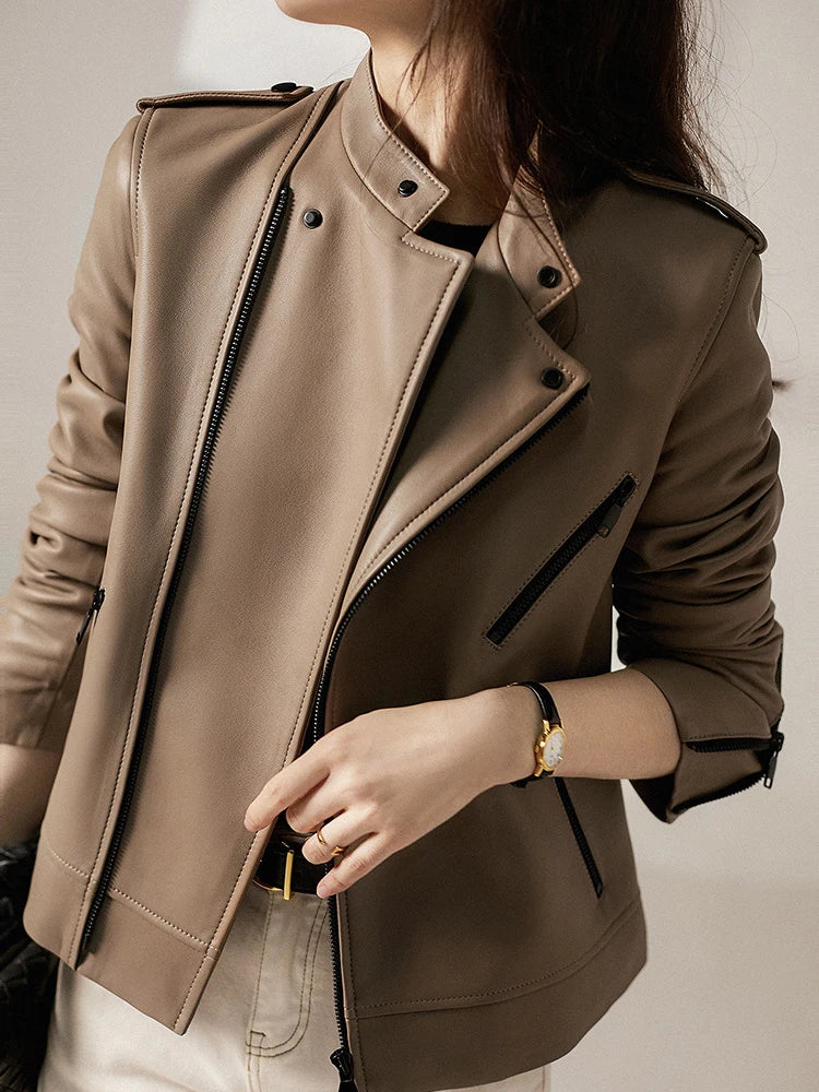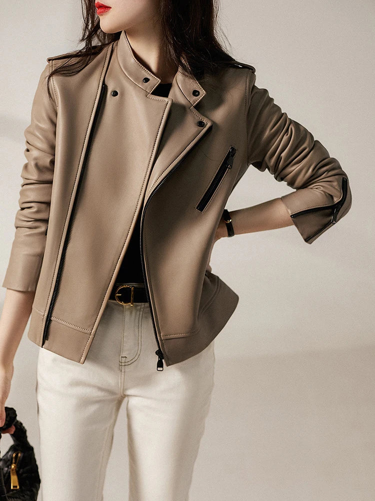 Women's Short Simple Stand Collar Sheepskin Zipper Locomotive Jacket