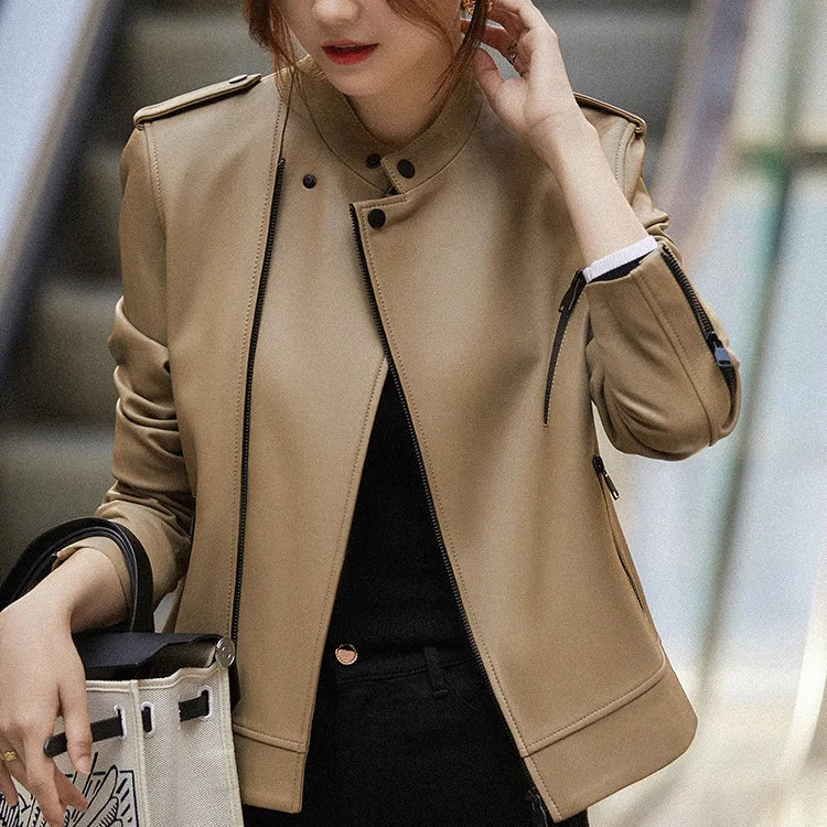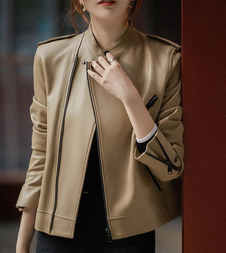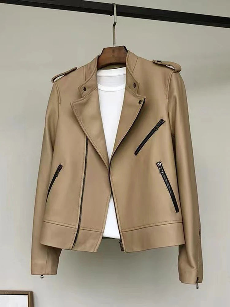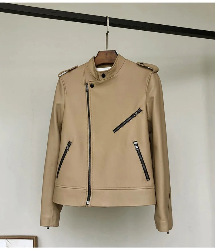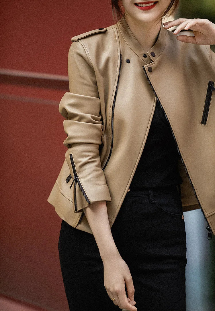 Perfect for fashion-conscious women, this functional jacket is available in a khaki shade and features black zipper details for elegance. The sheepskin leather gives it a luxurious look and makes it perfect for long-time wear. The stand collar and button details add a finishing touch to your look. Buy now!