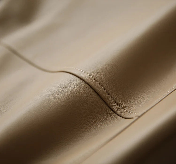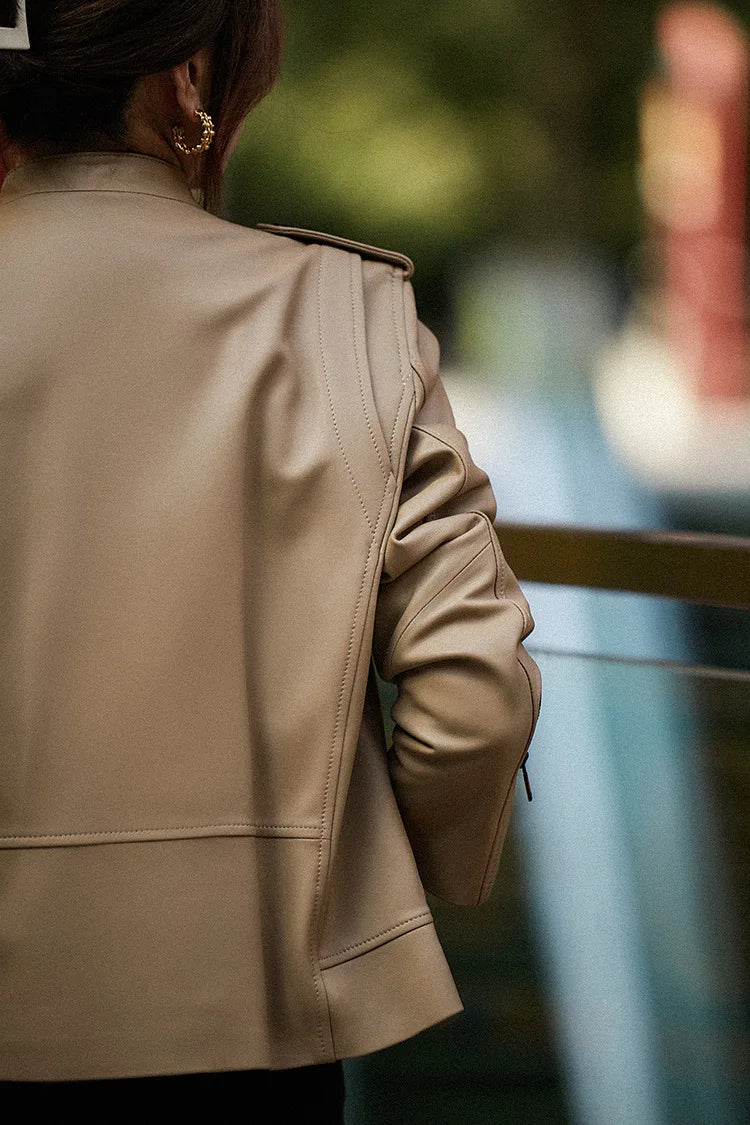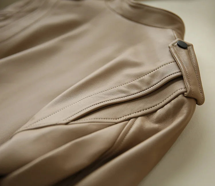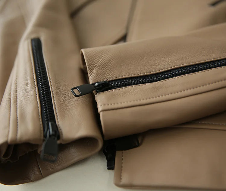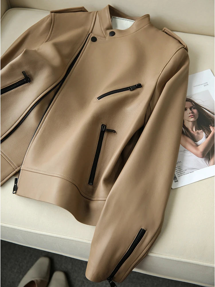 Perfect for fashion-conscious women, this functional jacket is available in a khaki shade and features black zipper details for elegance. The sheepskin leather gives it a luxurious look and makes it perfect for long-time wear. The stand collar and button details add a finishing touch to your look. Buy now!