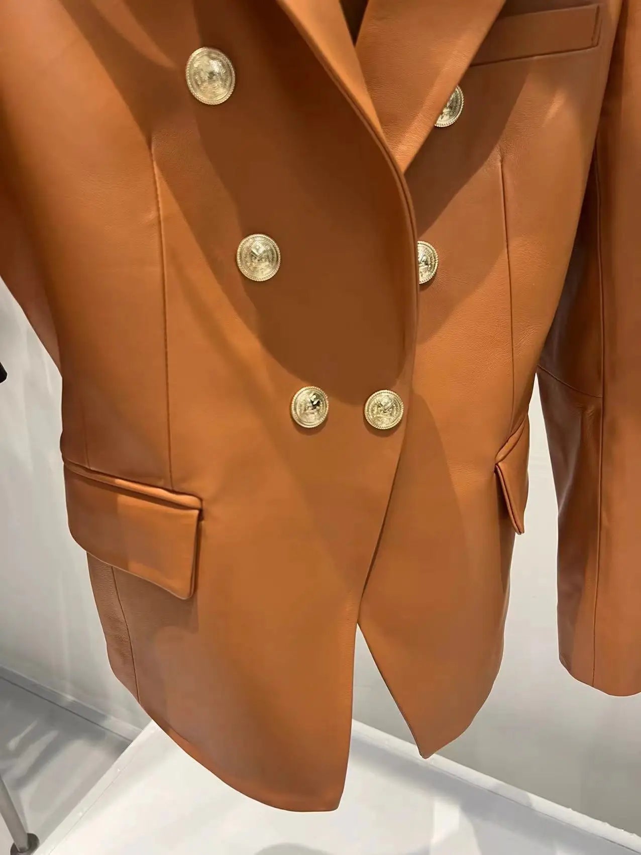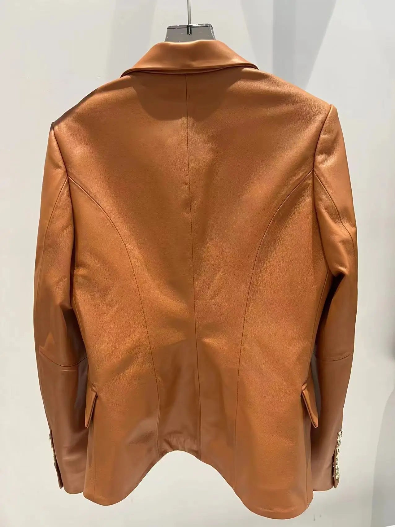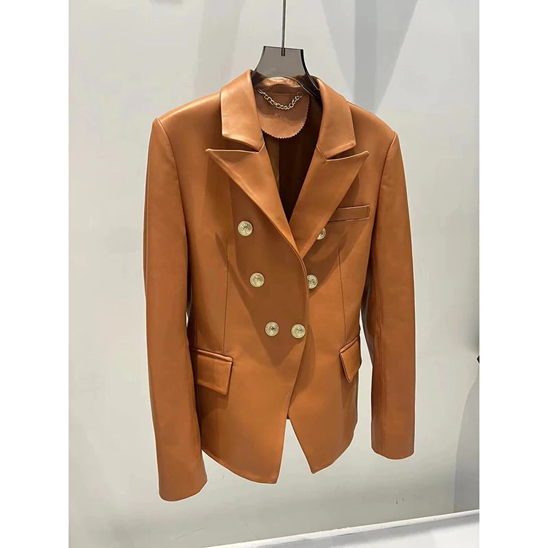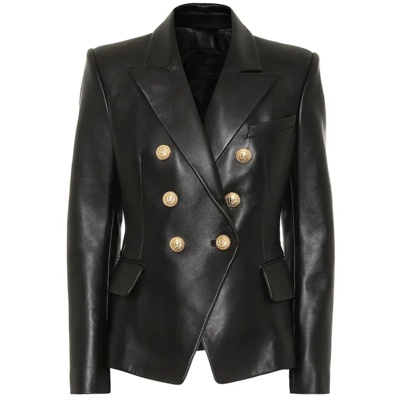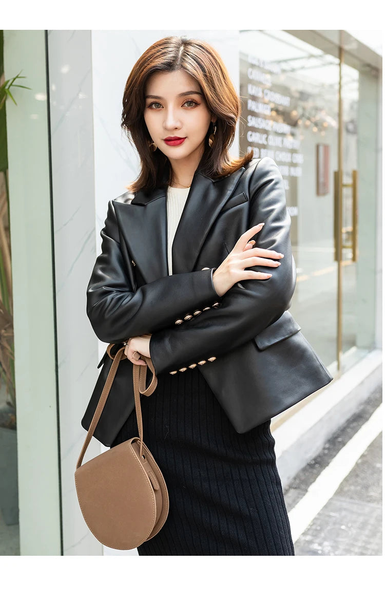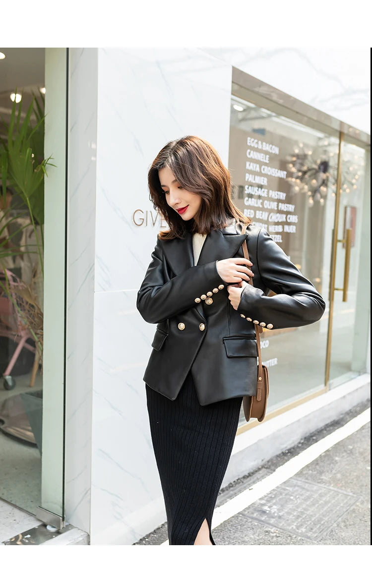 Perfect for fashion-conscious women, this stunning blazer is a stylish piece to pair with their favorite outfit. The sheepskin leather is durable and gives a luxurious look. The golden button details and the flap pockets give you a much more chic look. Get your's now!