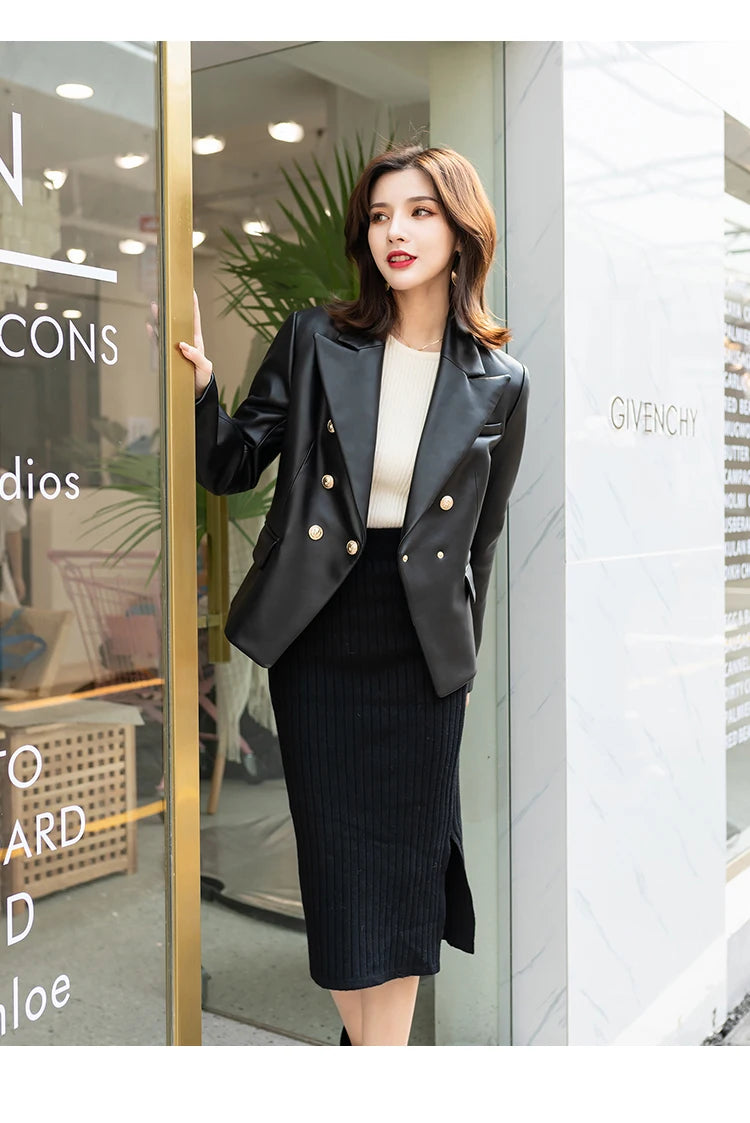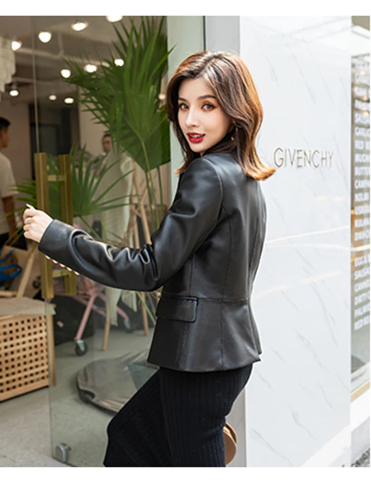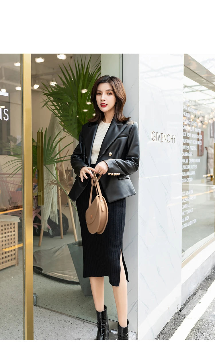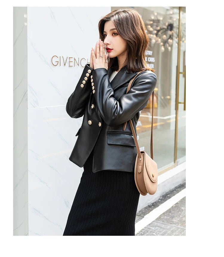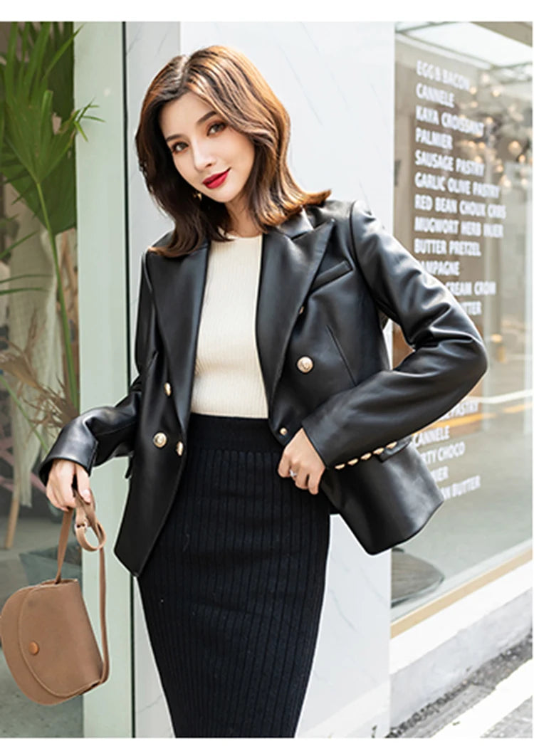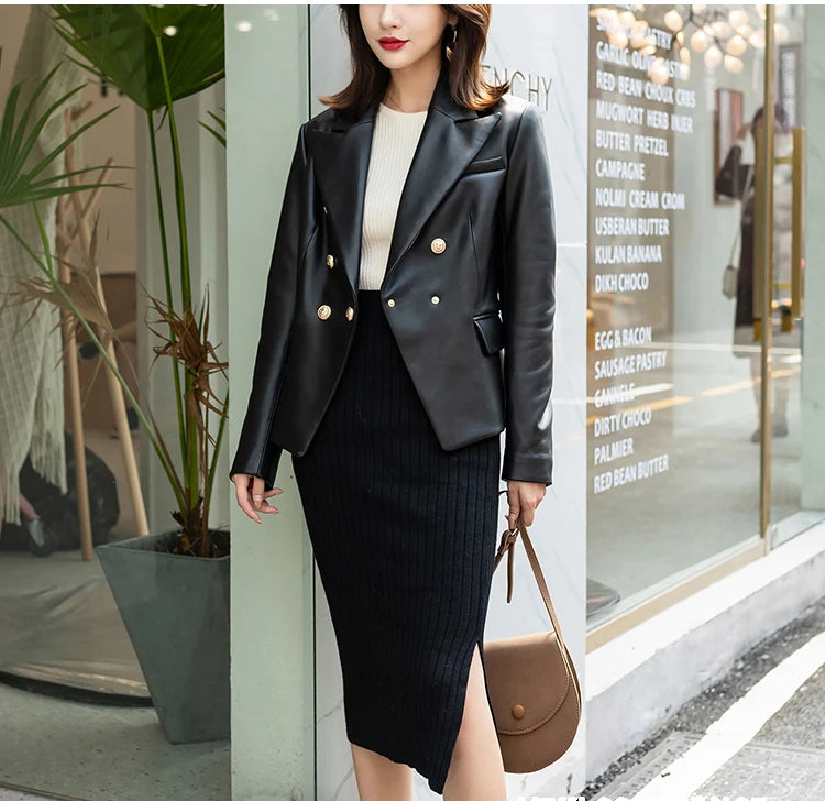 Women's Slim Double Breasted Lapel Sheepskin Korean Style Short Blazer