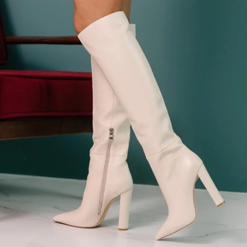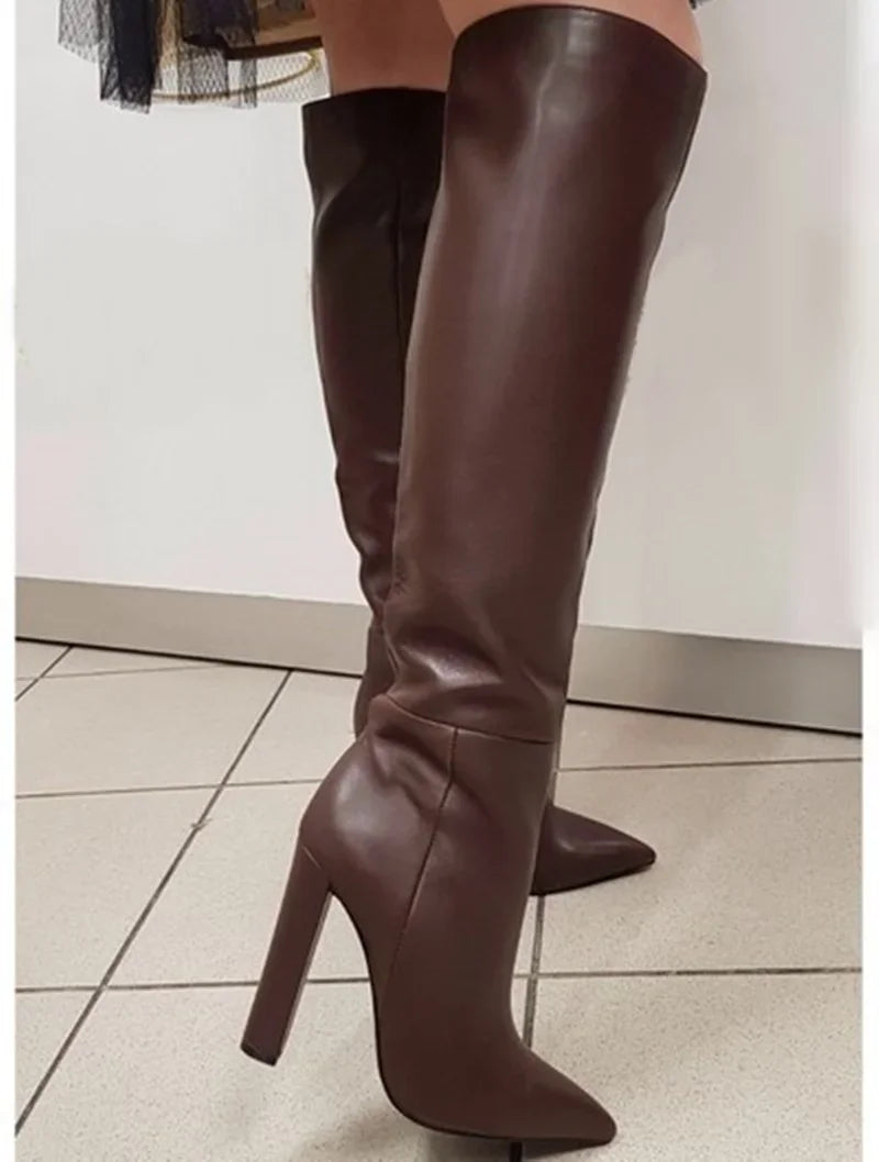 Women's Matte Leather Chunky Block Heel Pointed Toe Knee High Boots