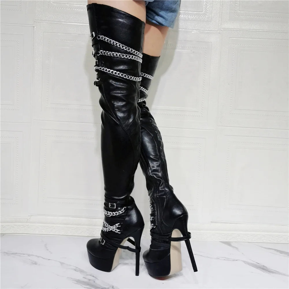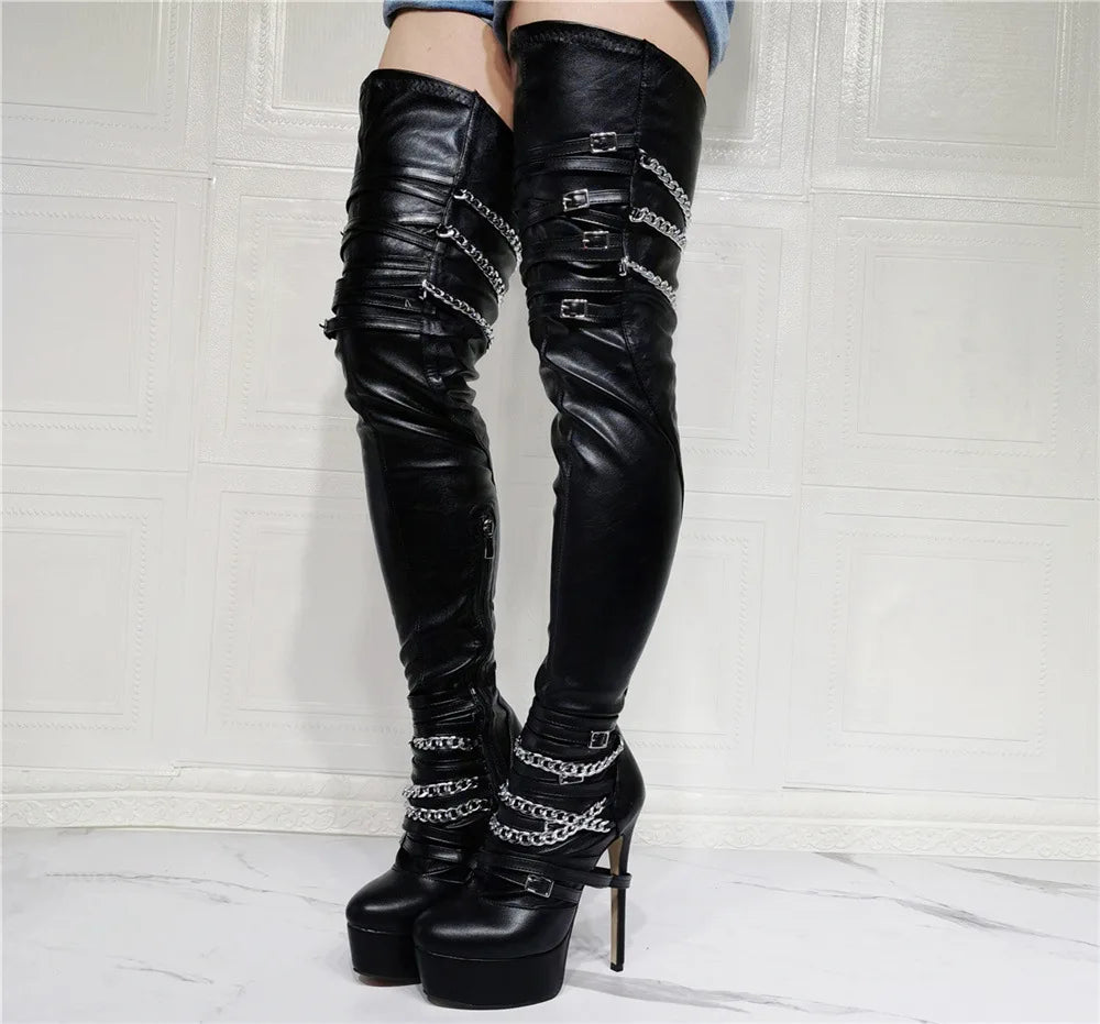 Women's Sexy High Heel Platform Round Toe Chains Thigh High Boots