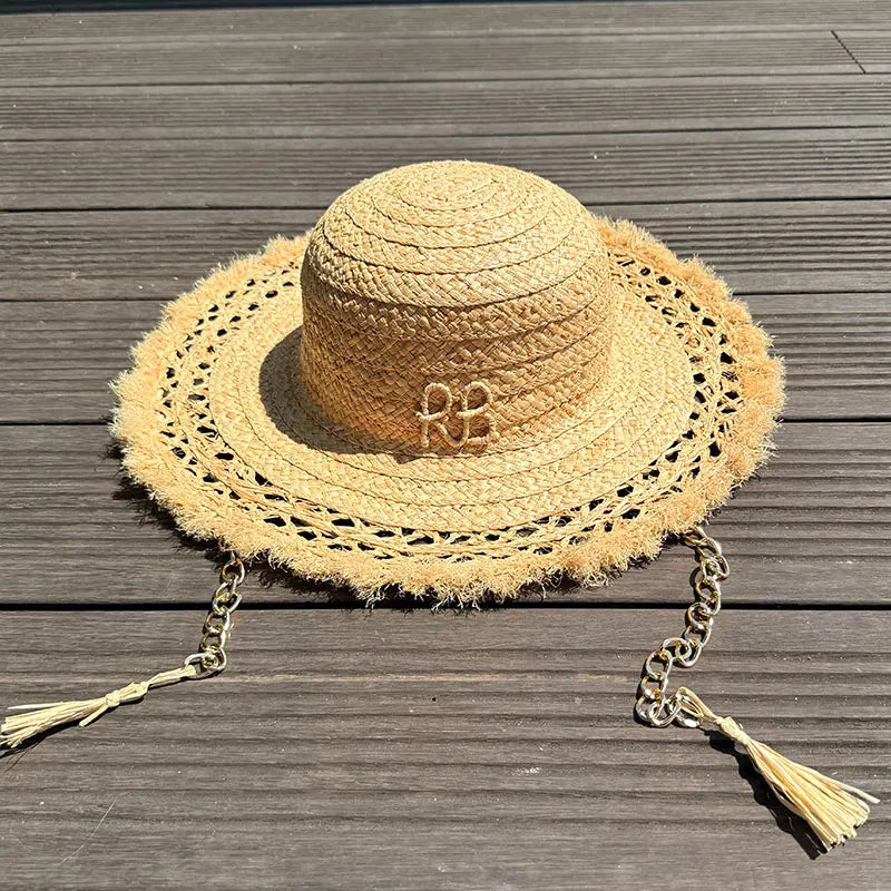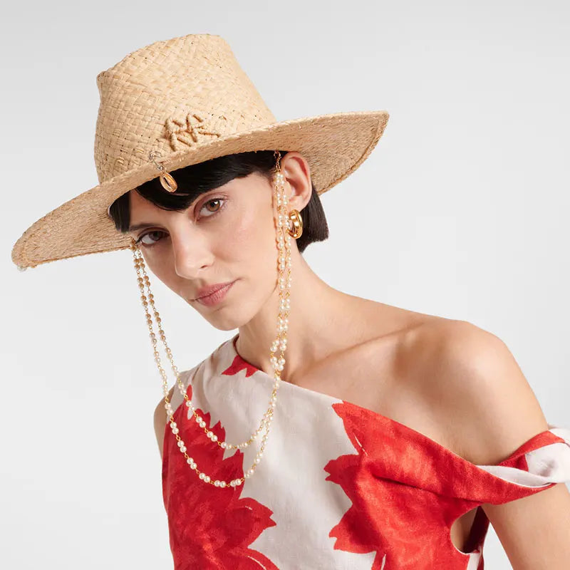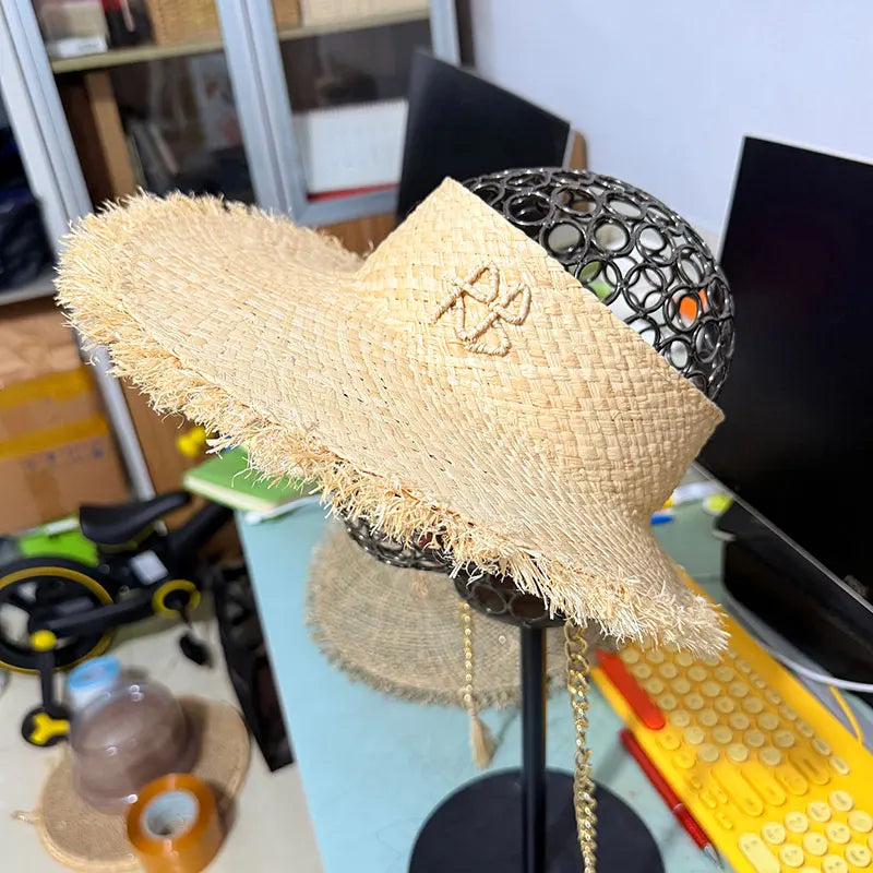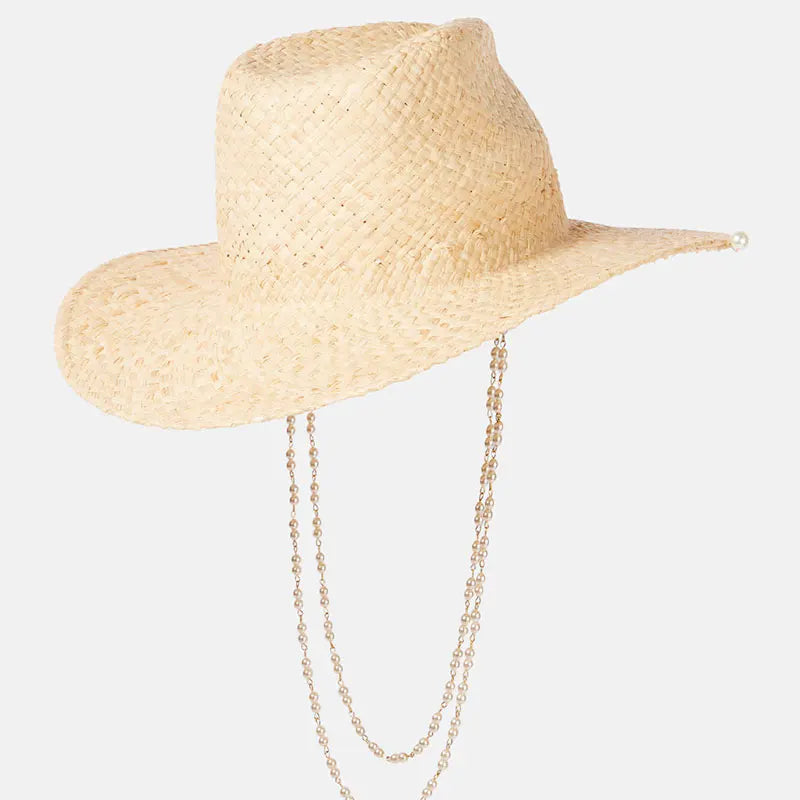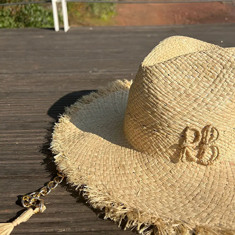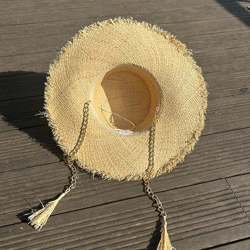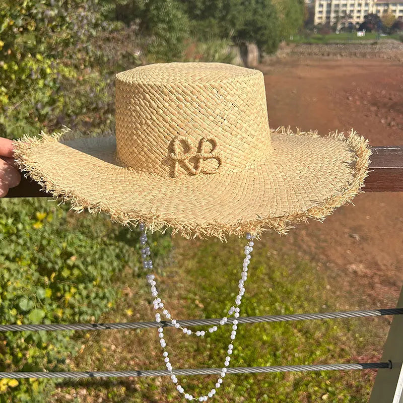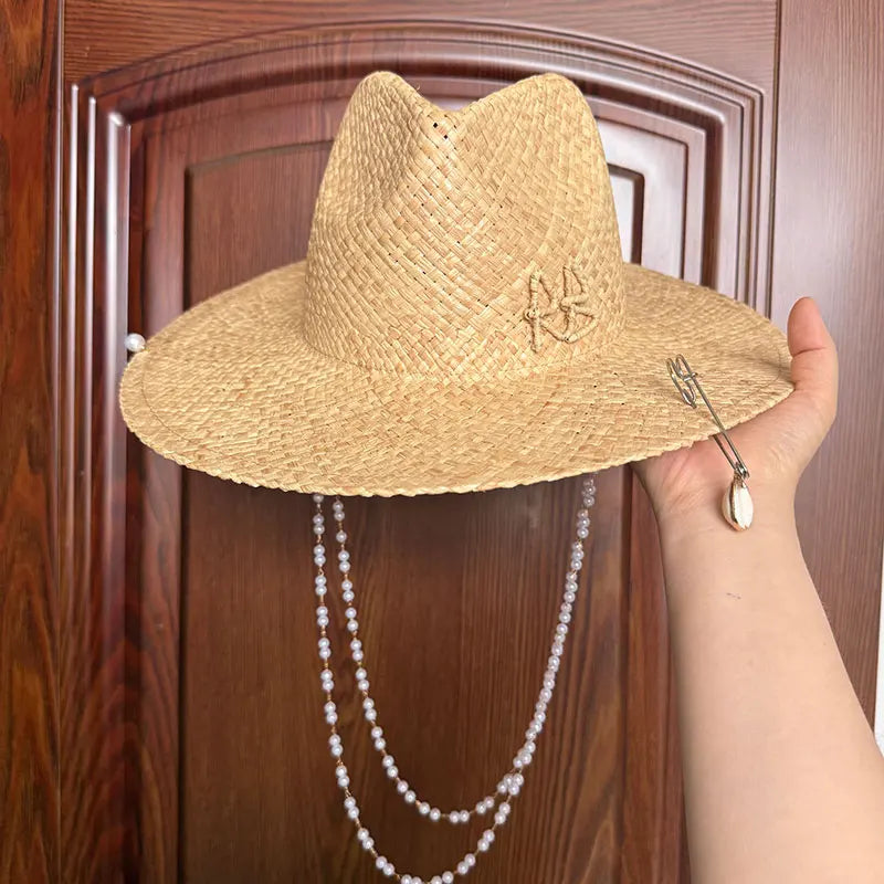 Women's Summer Raffia Straw Pearl Chain Big Brim Sun Hat for Beach Vacation