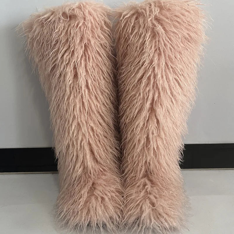 Women's Pink Warm Plush Faux Fur 60cm Long Over Knee Snow Boots