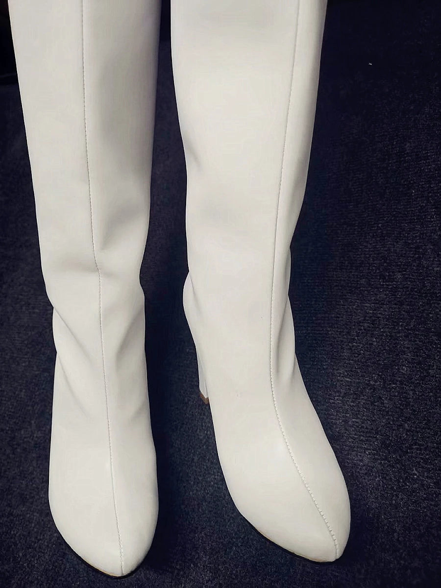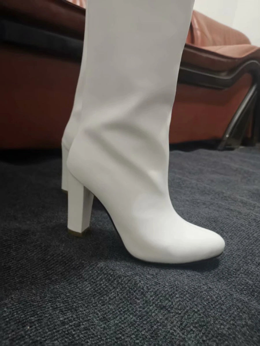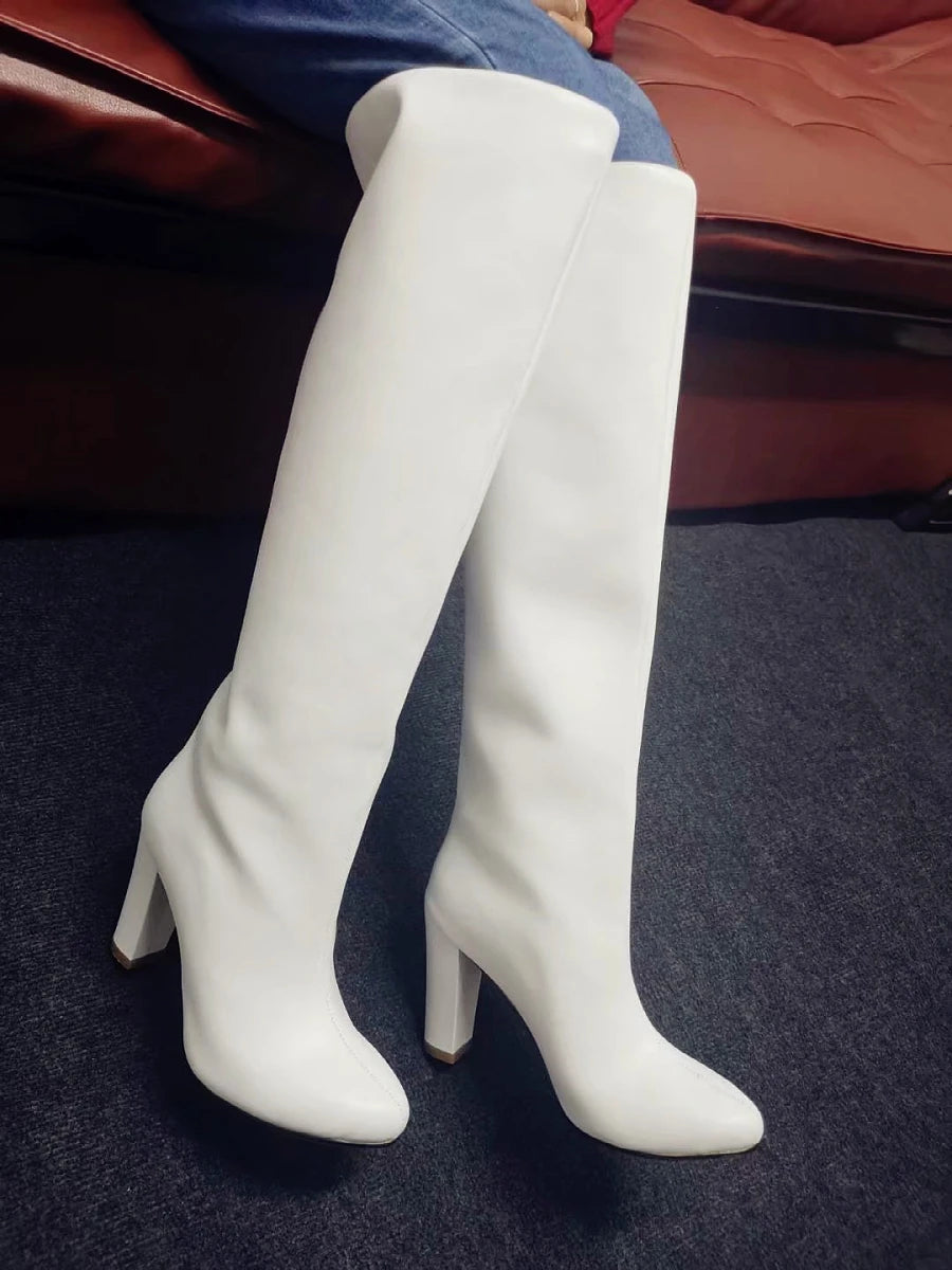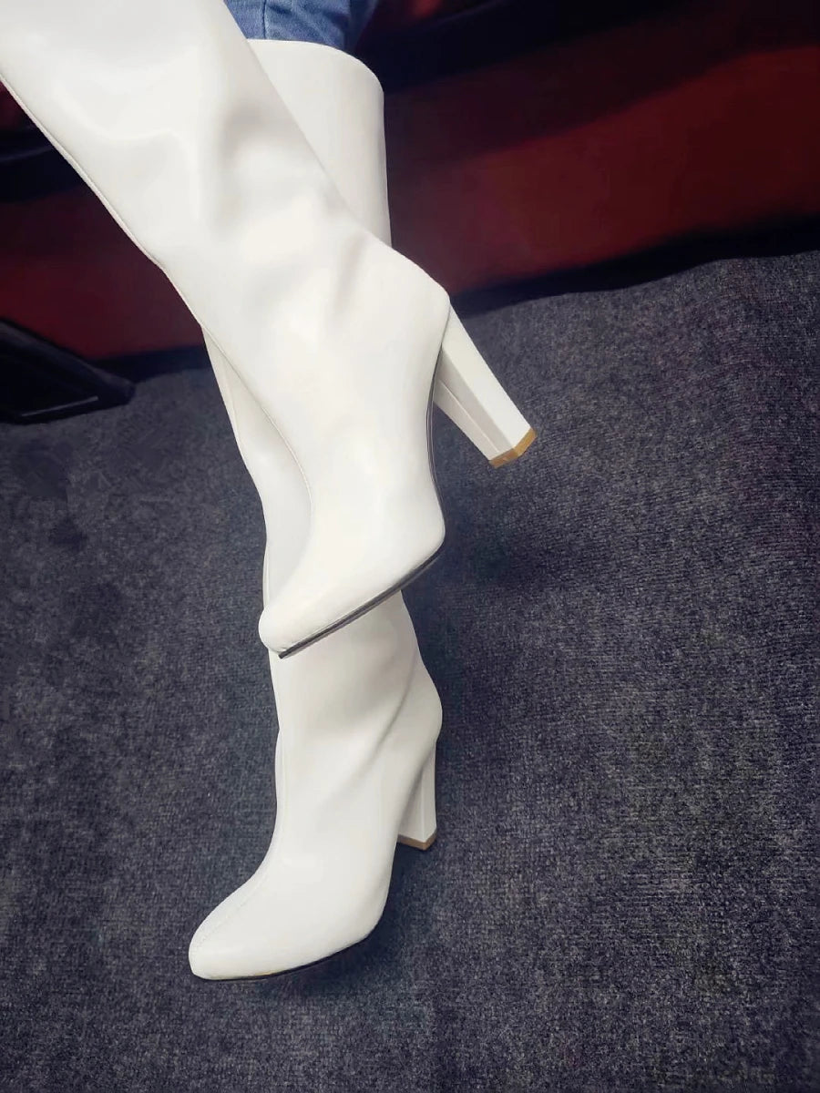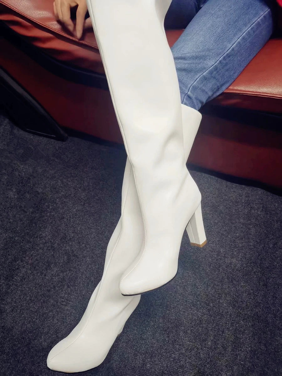 Matte Leather Thick Chunky Heels Zipper Knee High Boots for Women