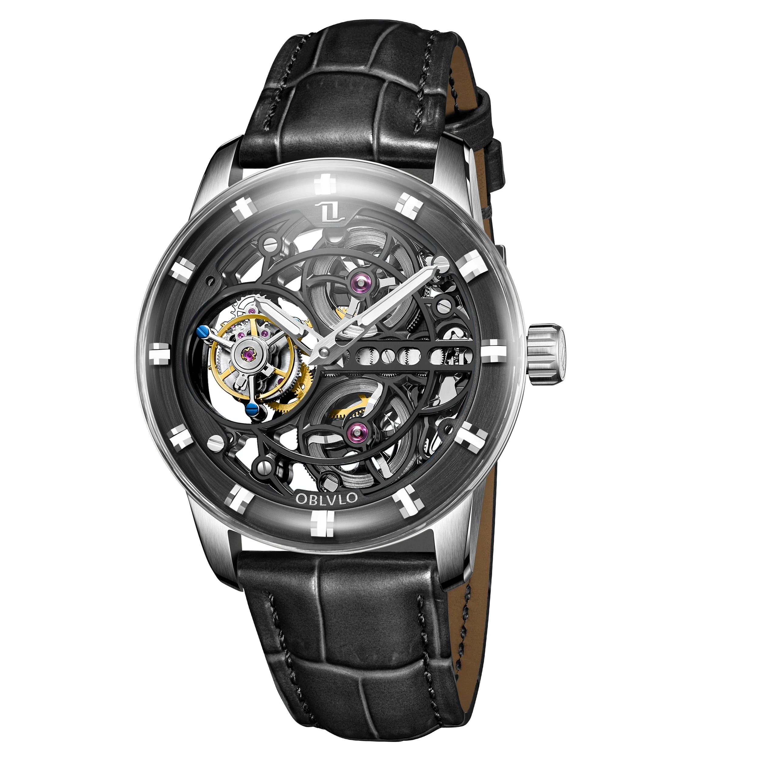 Men's Stainless Steel Mechanical Hollow Dial Leather Strap Tourbillon Sapphire Crystal Watch