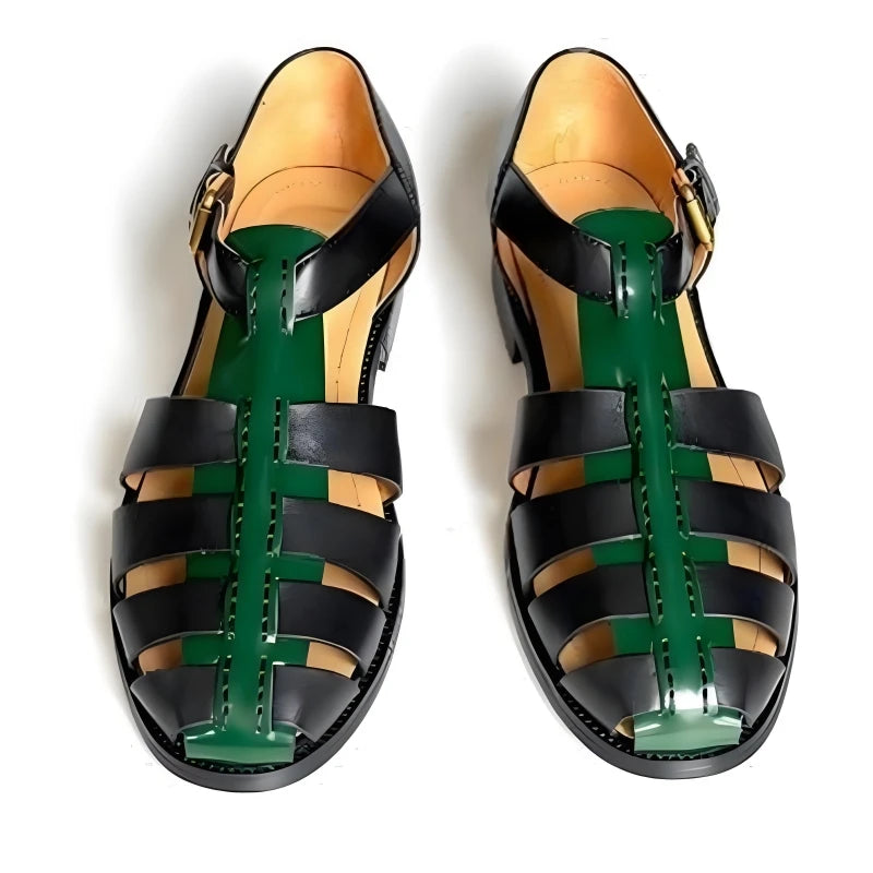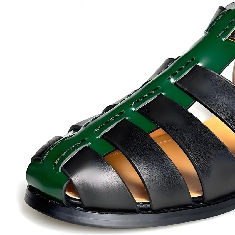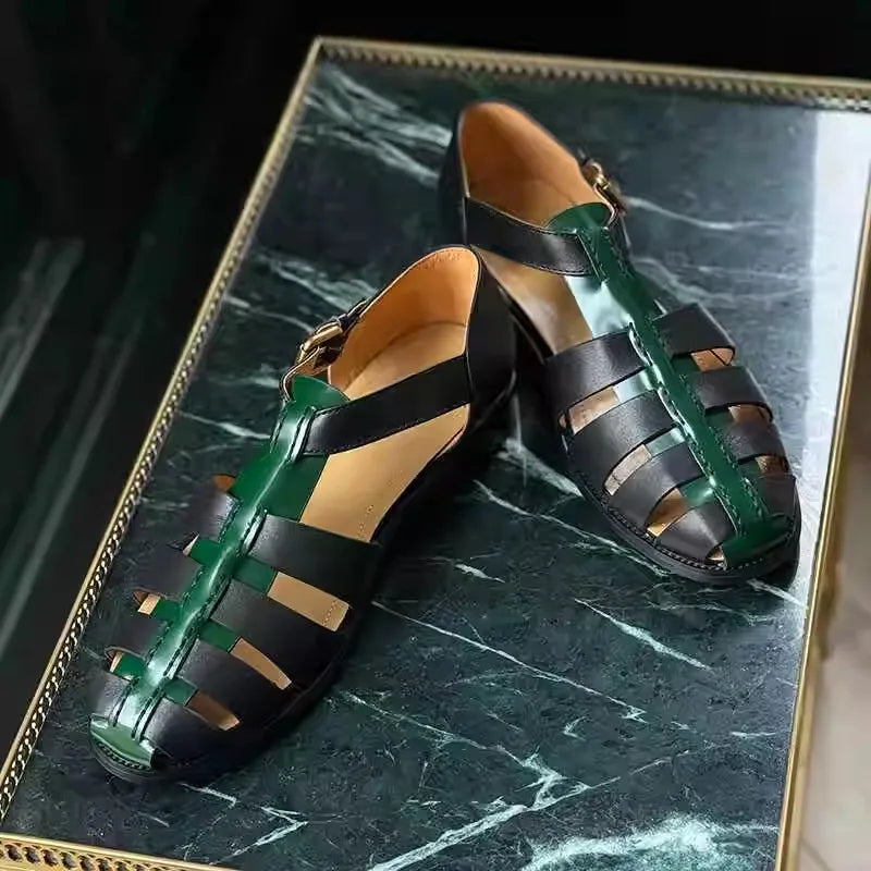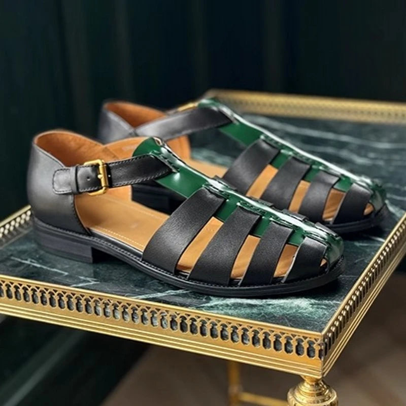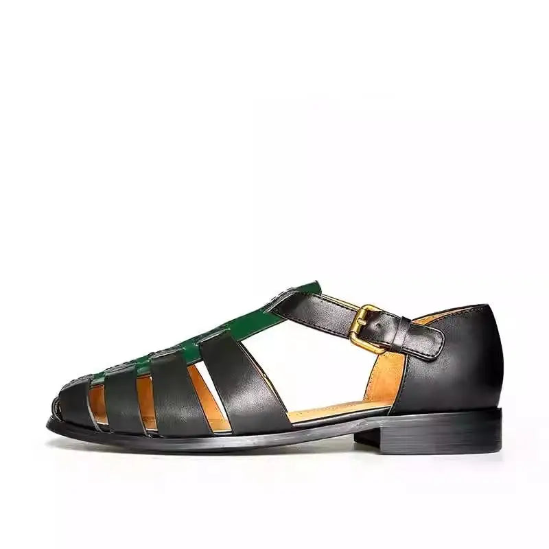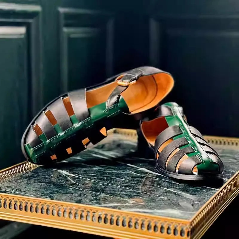 Featuring a genuine leather upper in a lovely black and green color combo, these men's sandals offer both durability and style. The design features a hollow-out pattern and buckle strap for a comfortable fit. Wear it with your favorite summer outfit to make yourself look great and stylish.