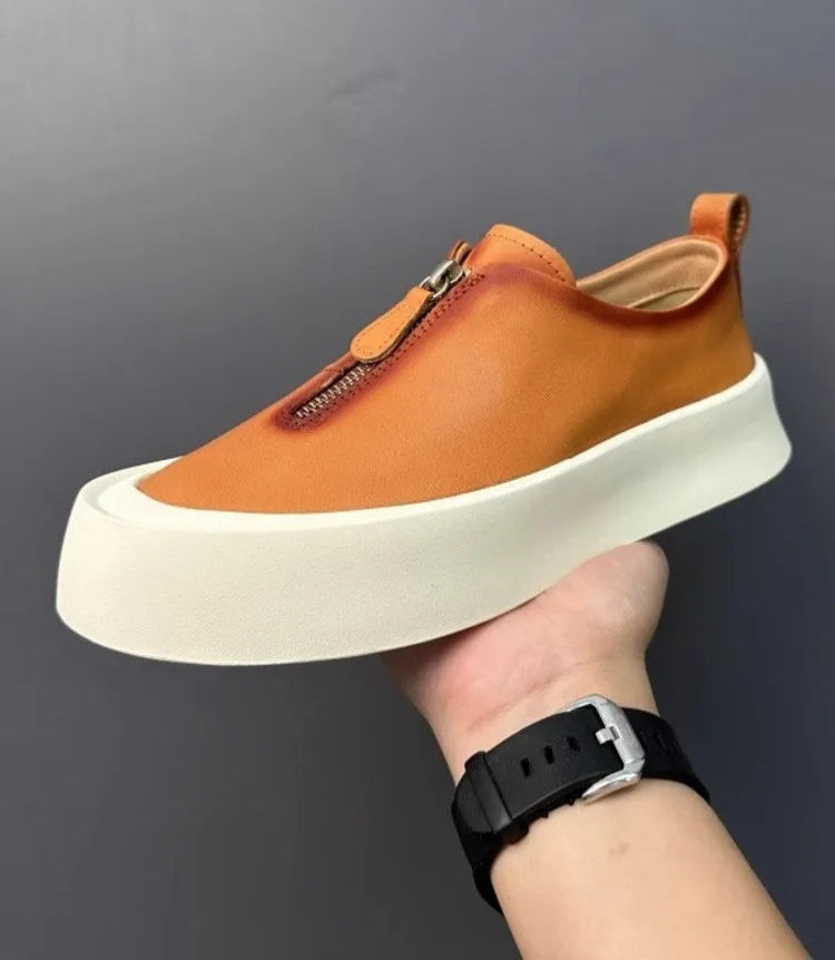 Men's Casual Cowhide Genuine Leather Thick Platform Zipper Jogger Skateboard Sneakers