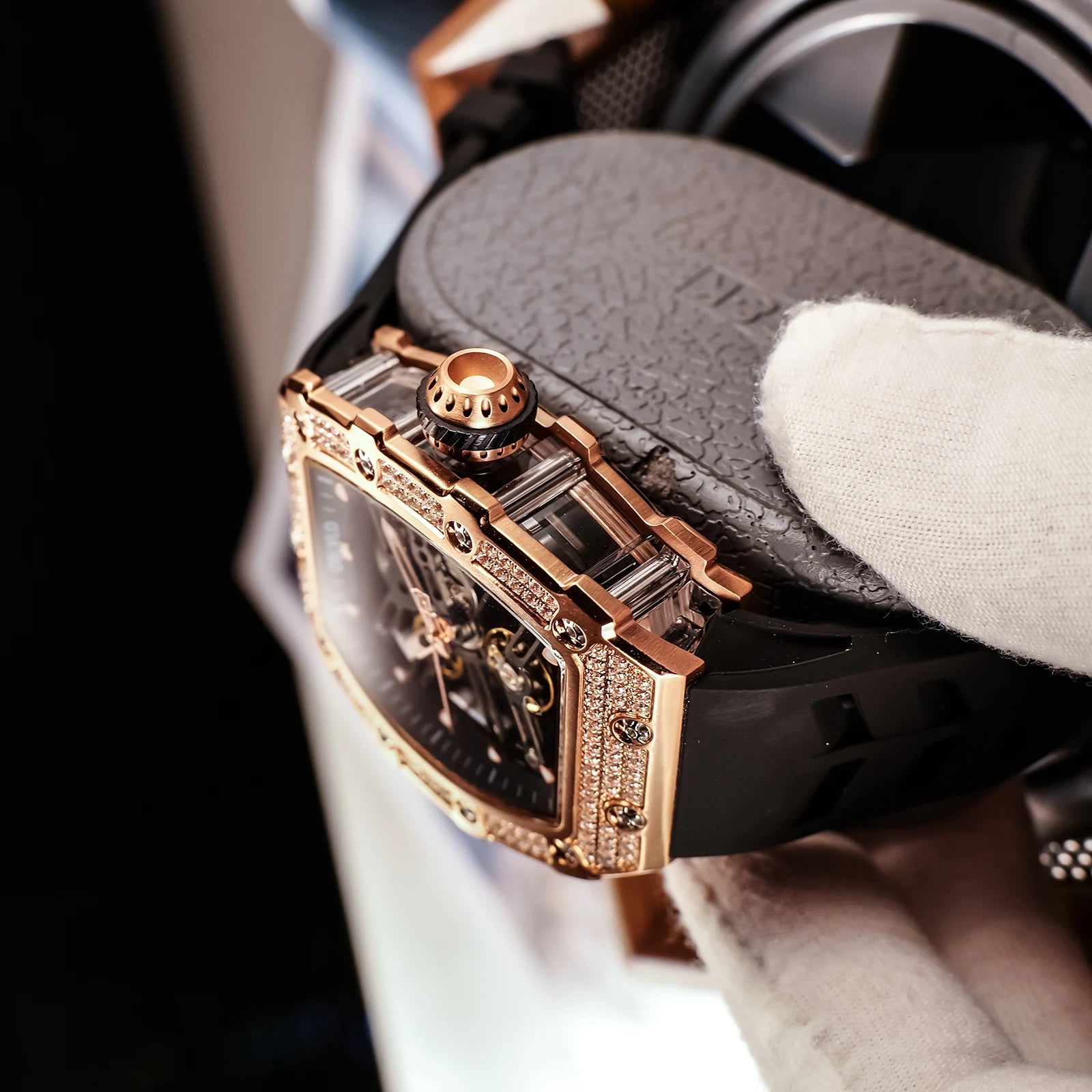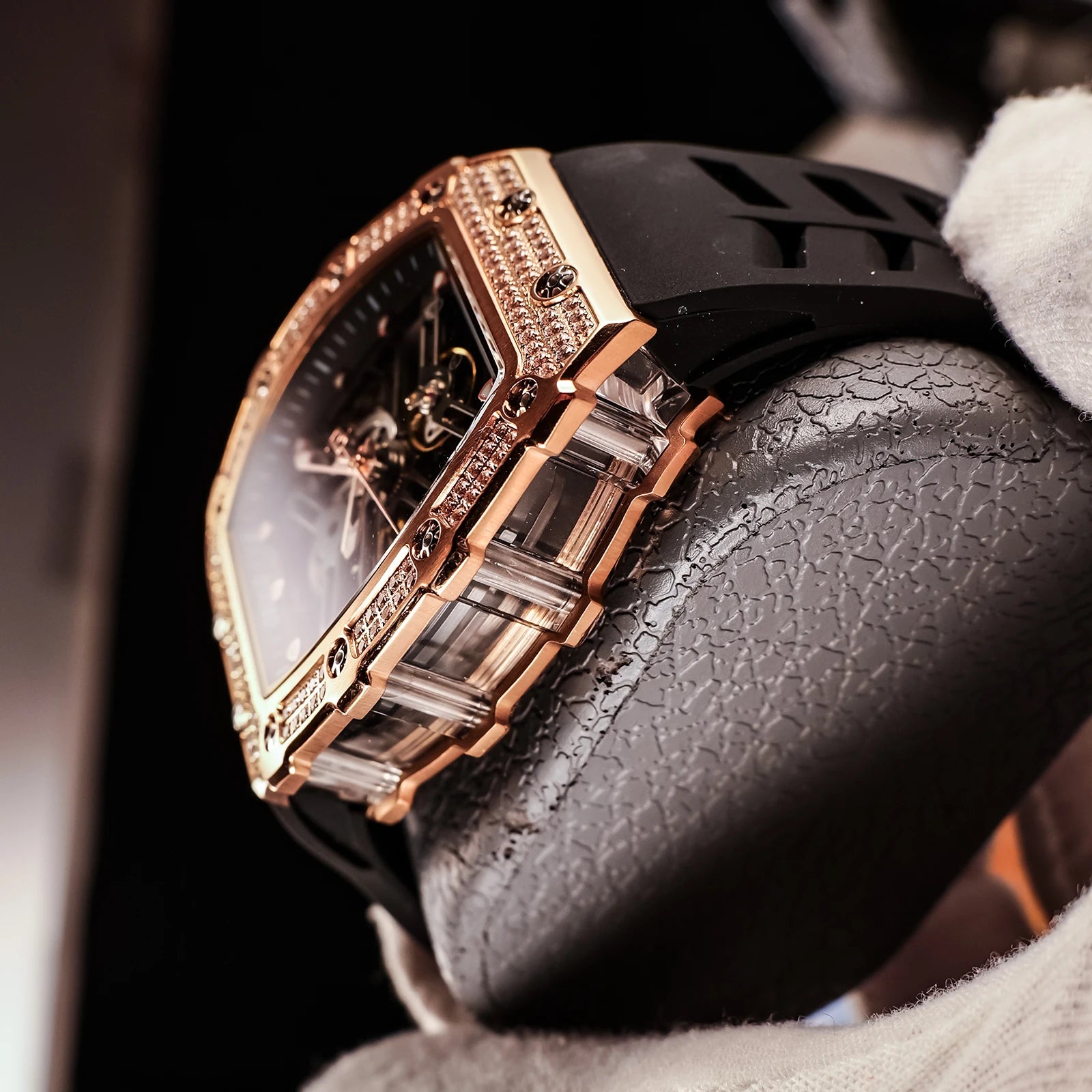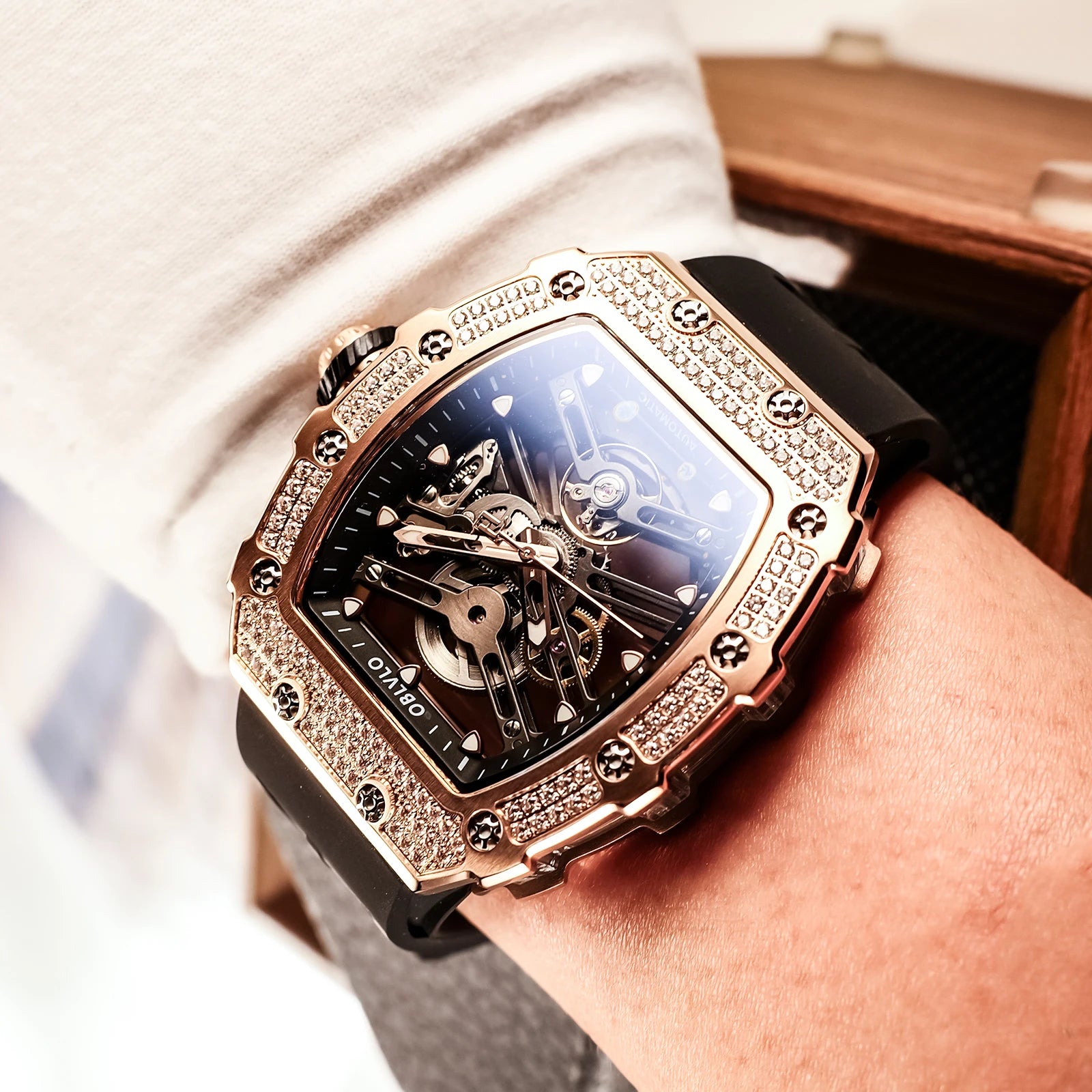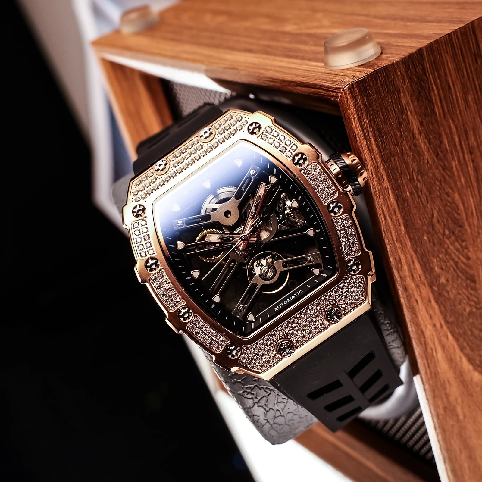 Trendy Style Diamonds Bezel Skeleton Tonneau Analog Mechanical Watch For Men
