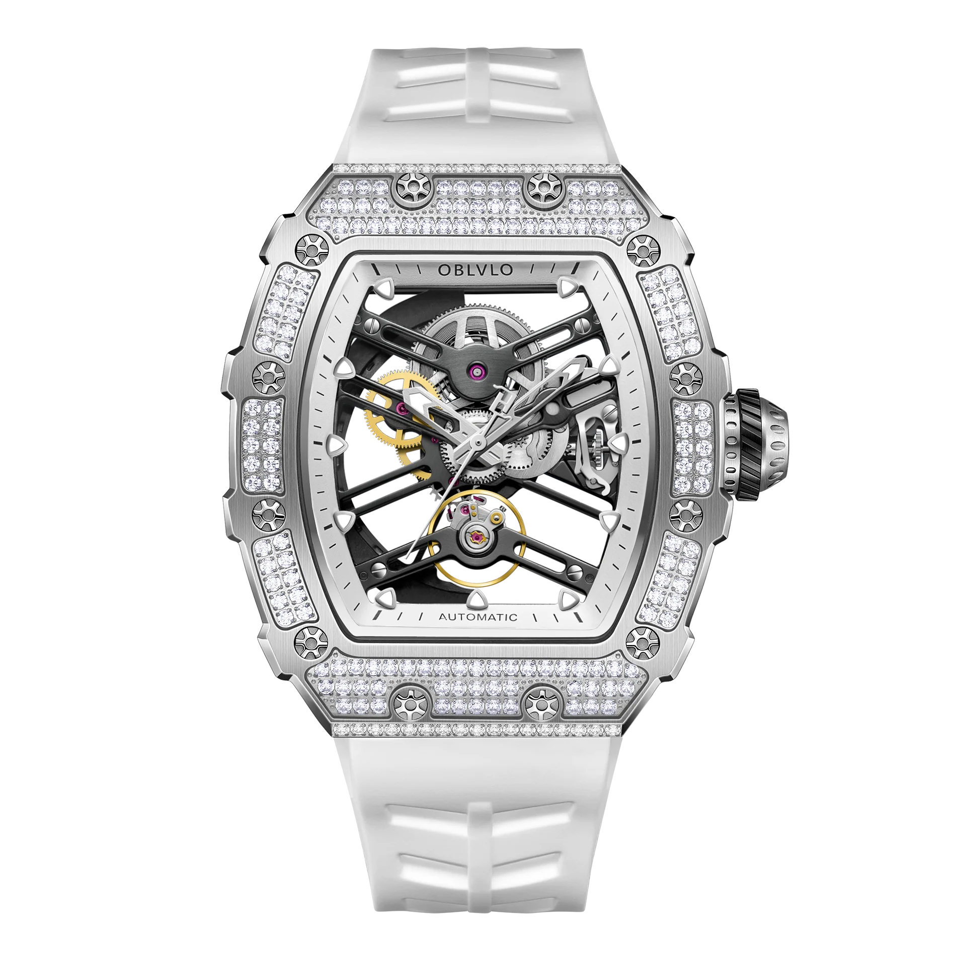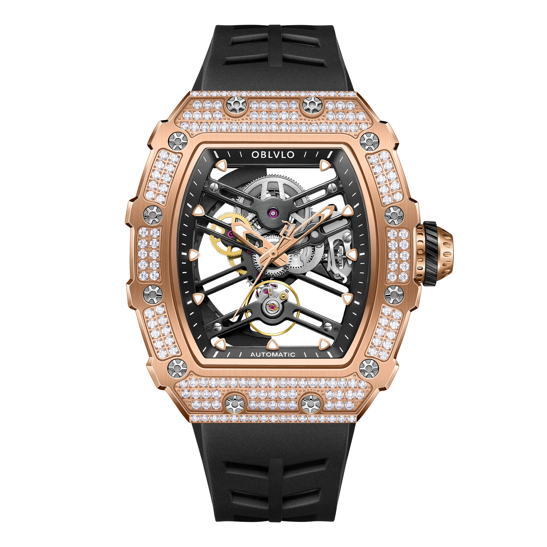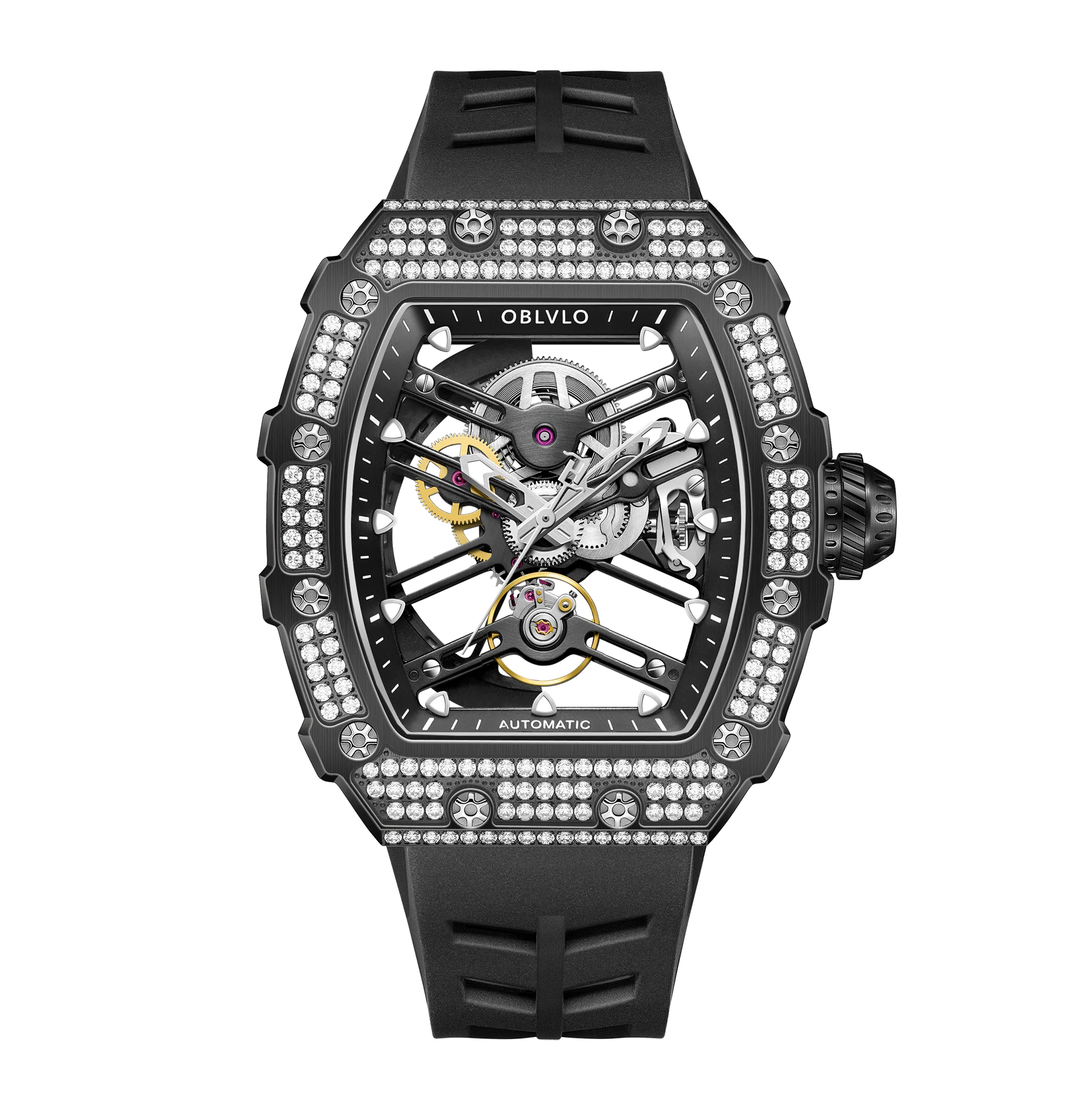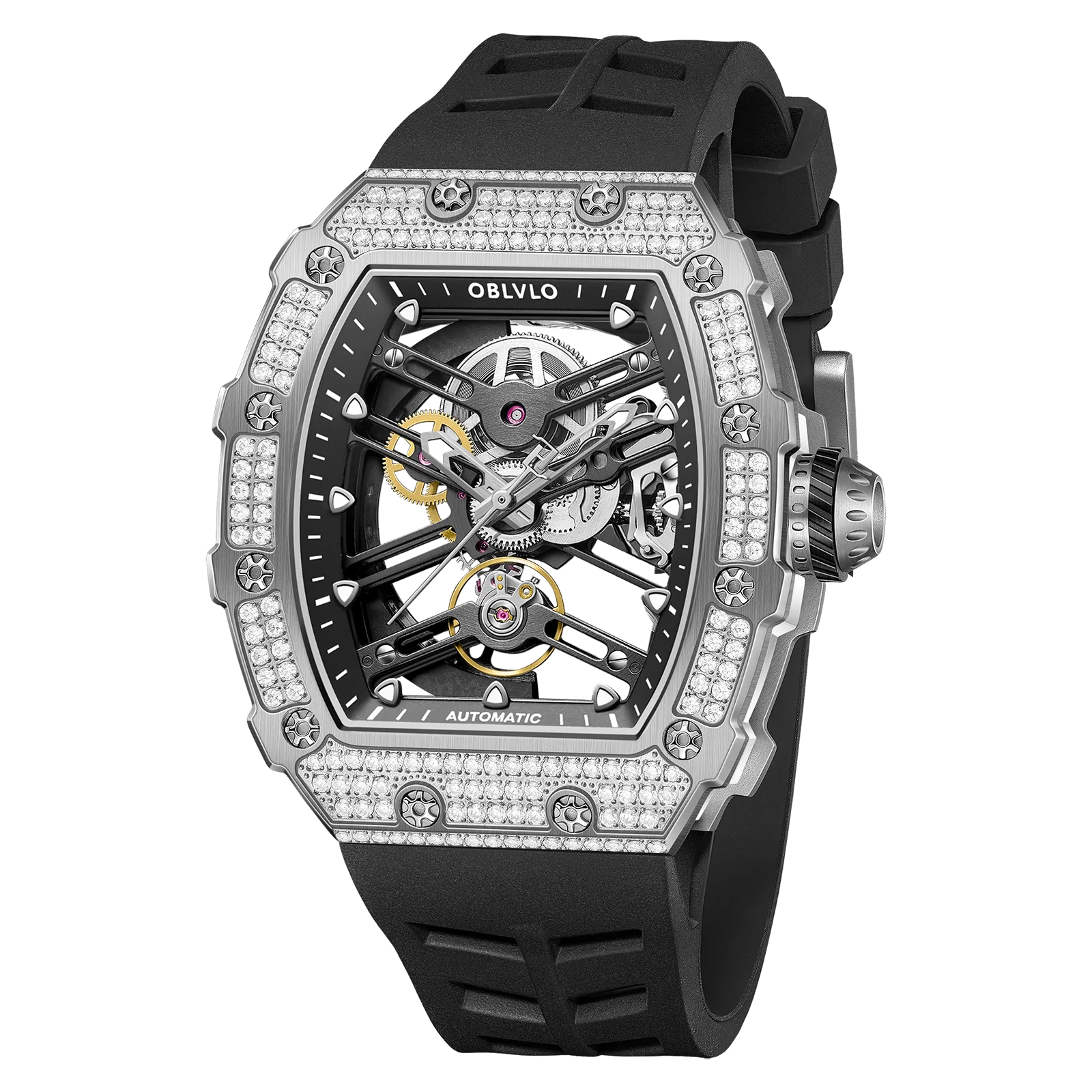 Trendy Style Diamonds Bezel Skeleton Tonneau Analog Mechanical Watch For Men