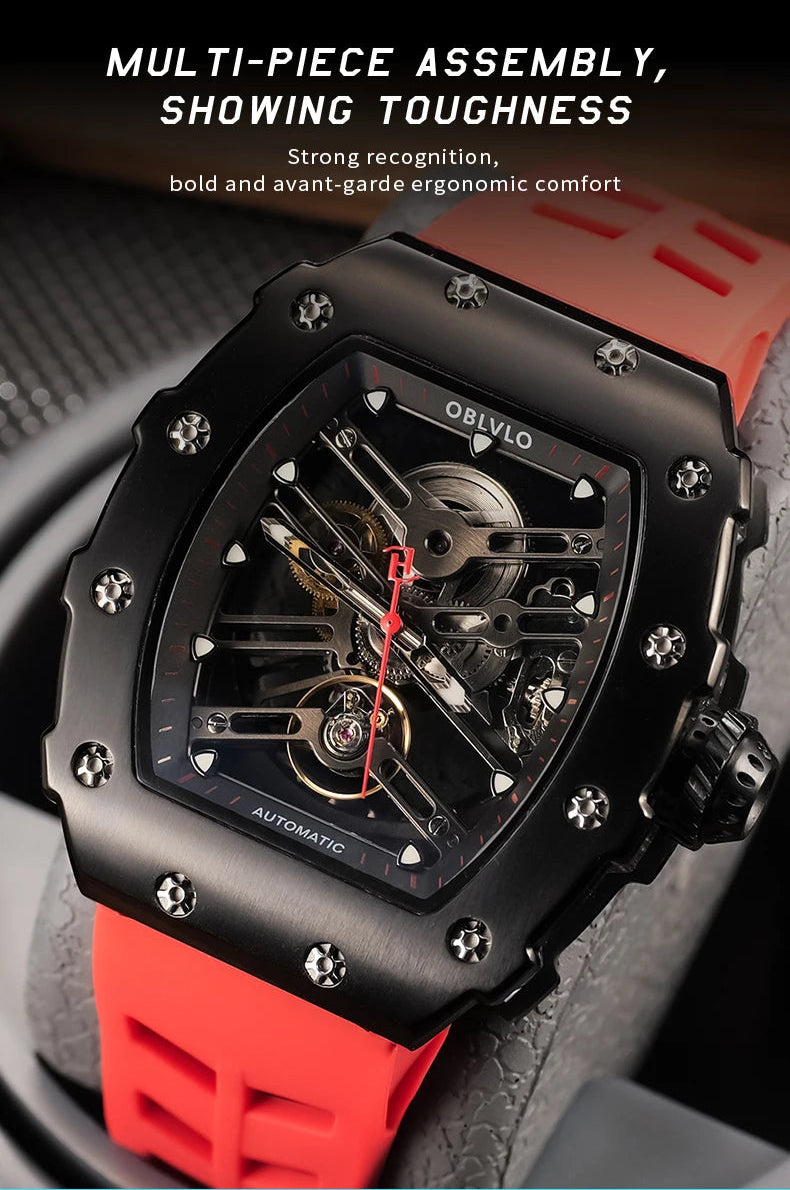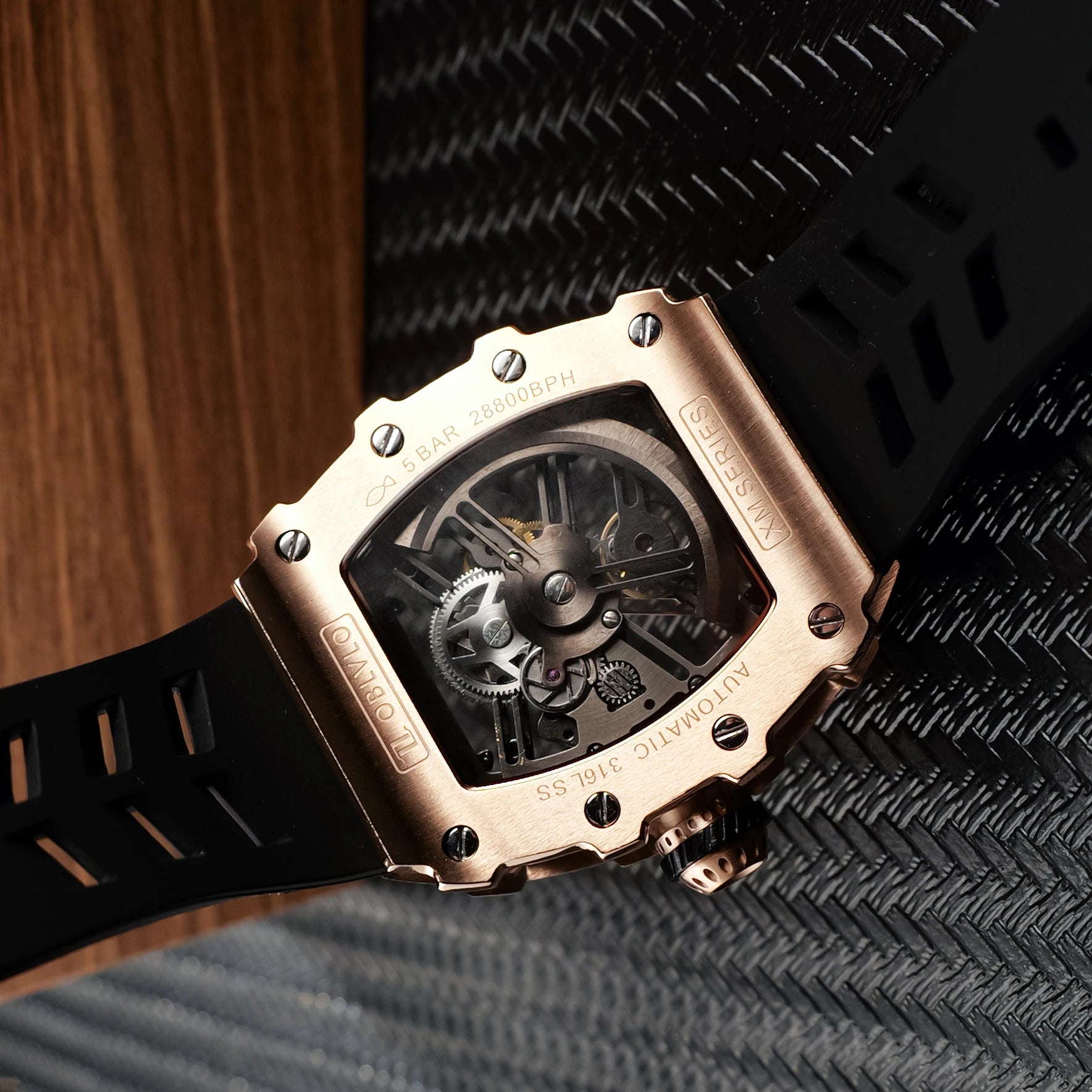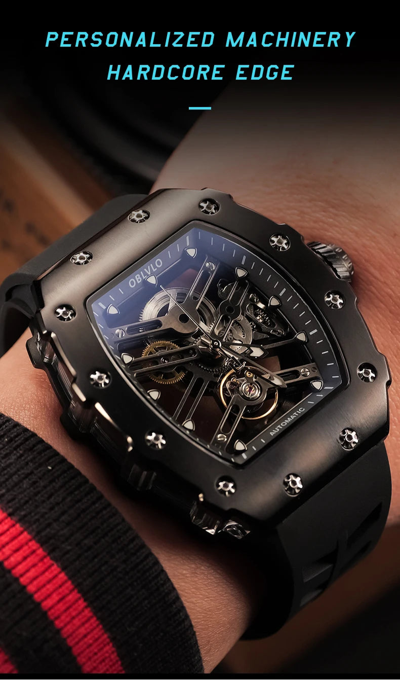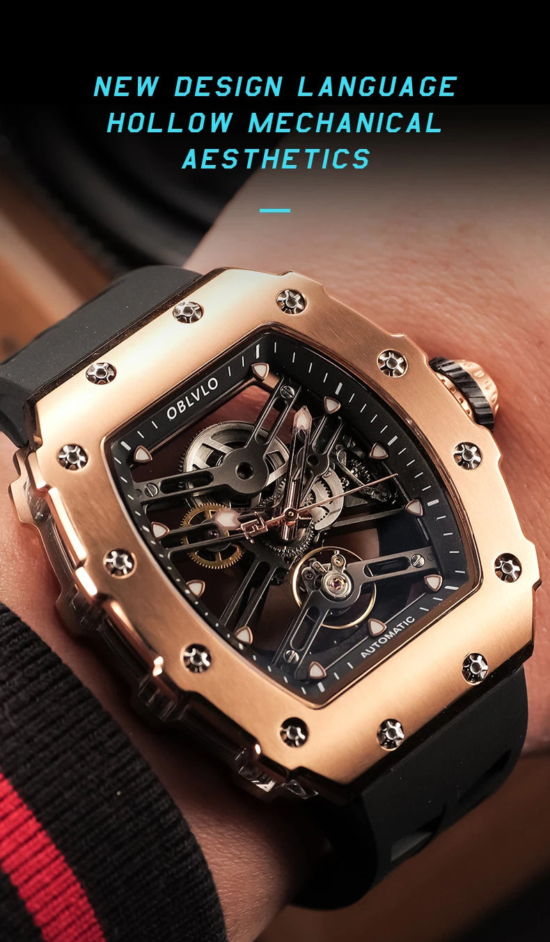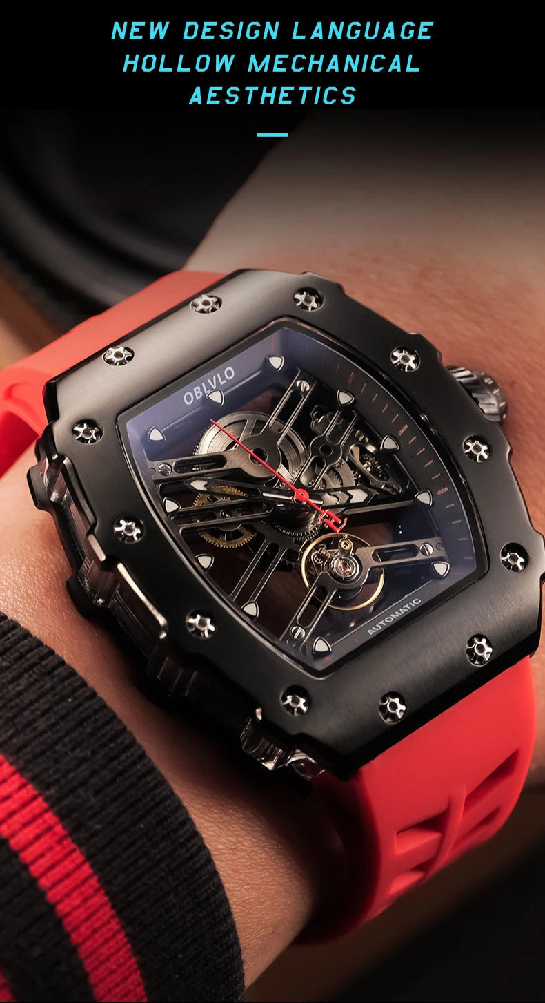 Trendy Style Diamonds Bezel Skeleton Tonneau Analog Mechanical Watch For Men