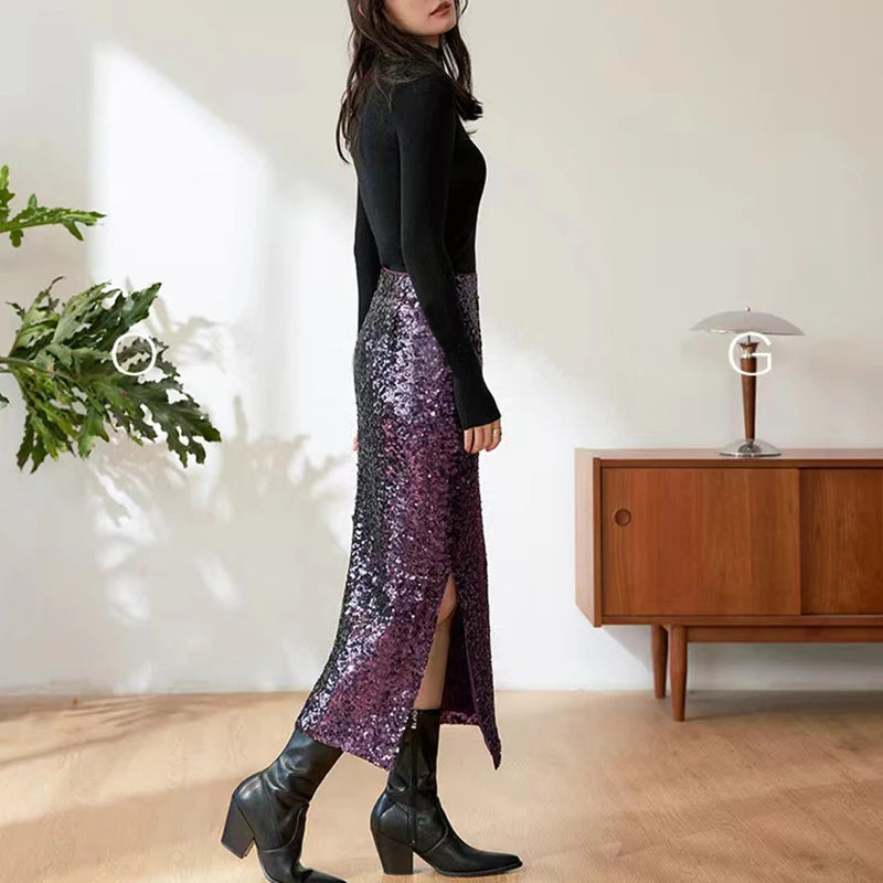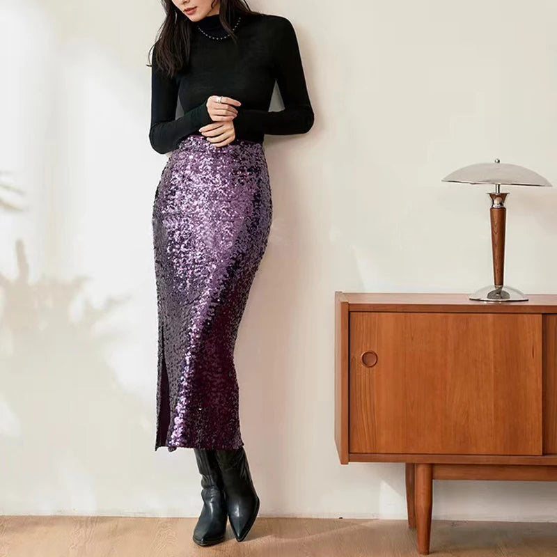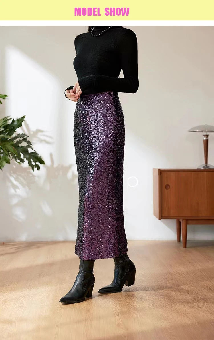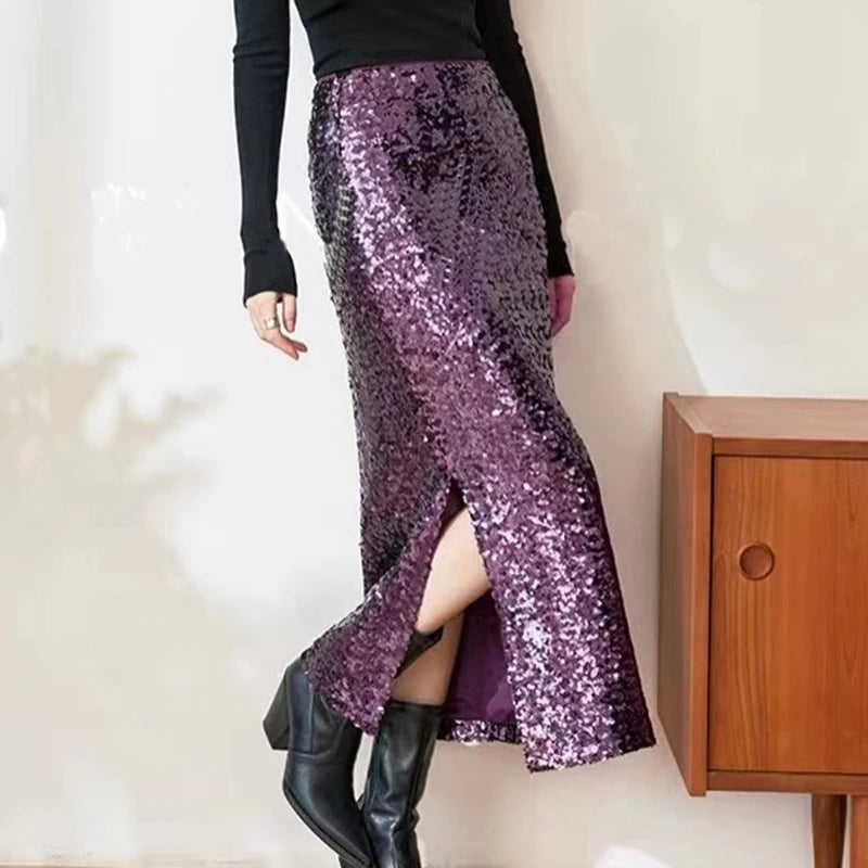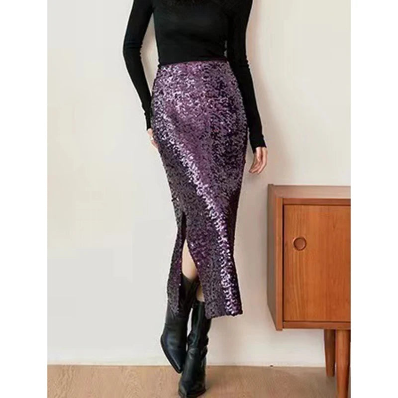 Women's Spring Autumn Korean Fashion Shiny Sequined Wrap Hip Long Skirt with Side Slit