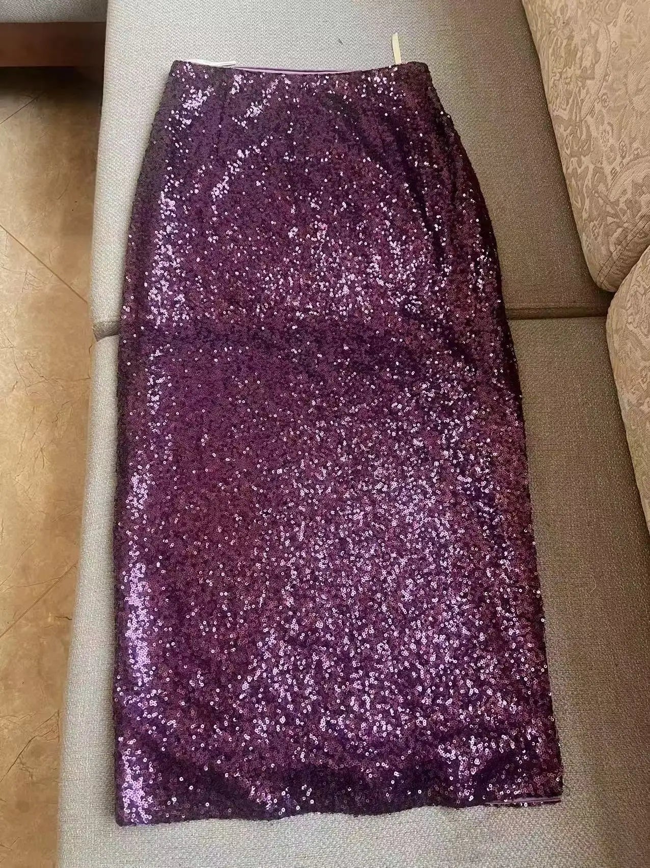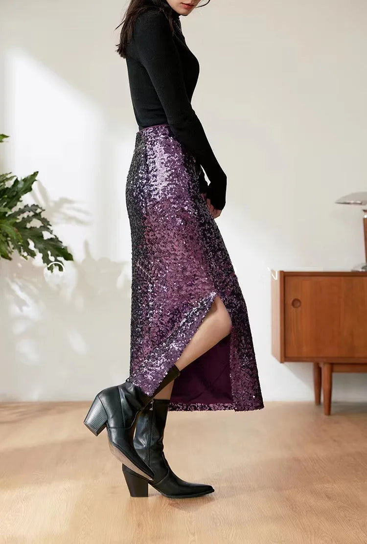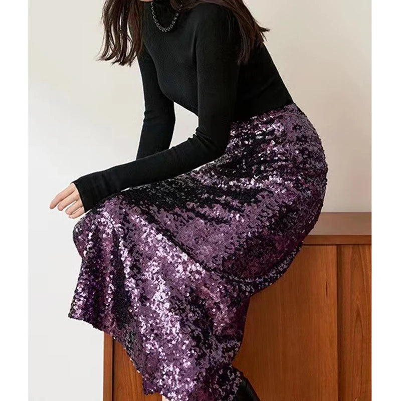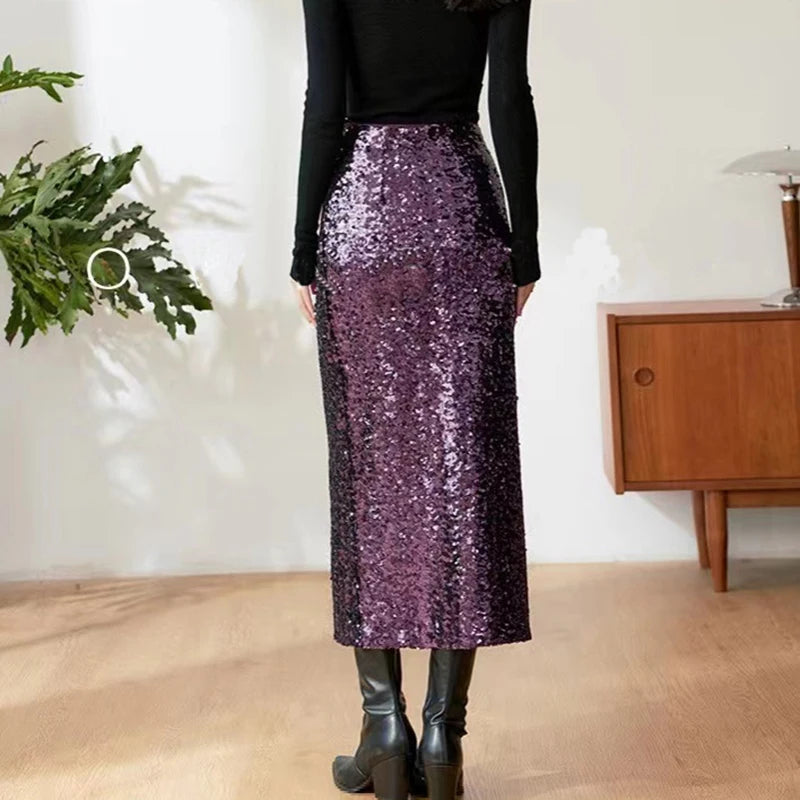 Women's Spring Autumn Korean Fashion Shiny Sequined Wrap Hip Long Skirt with Side Slit