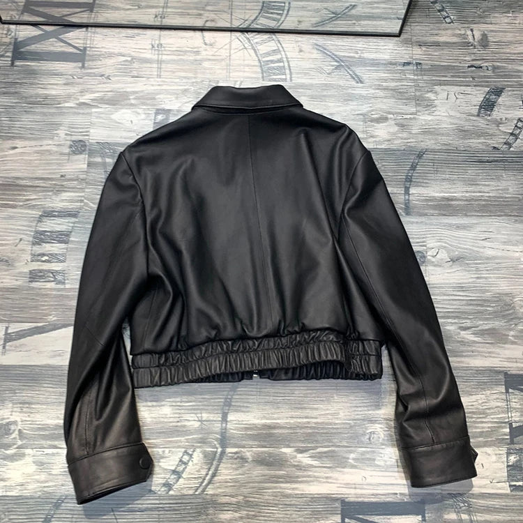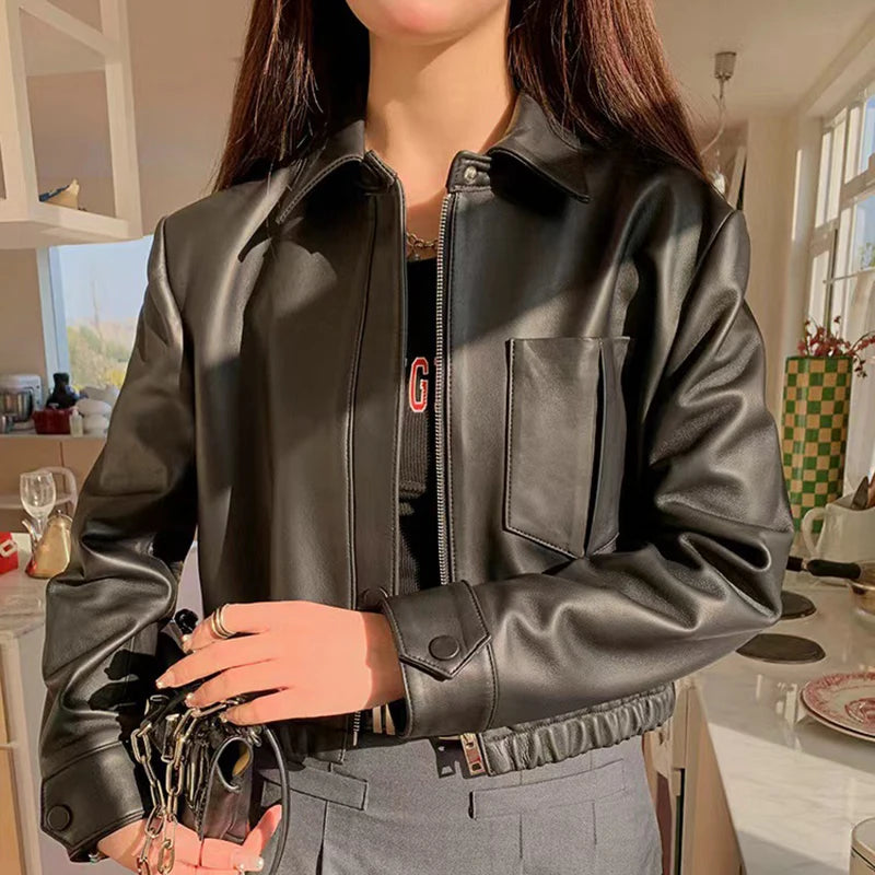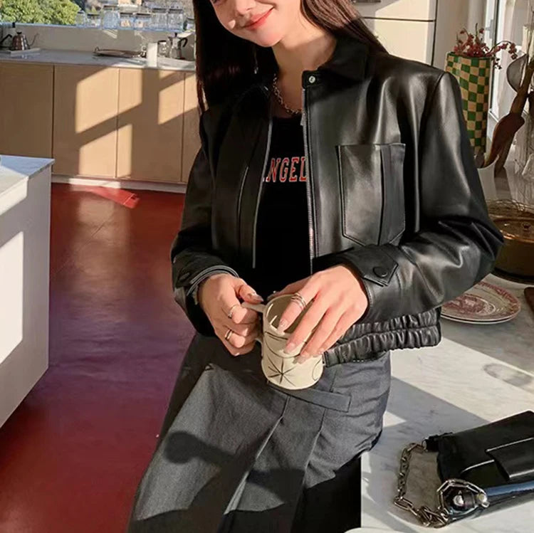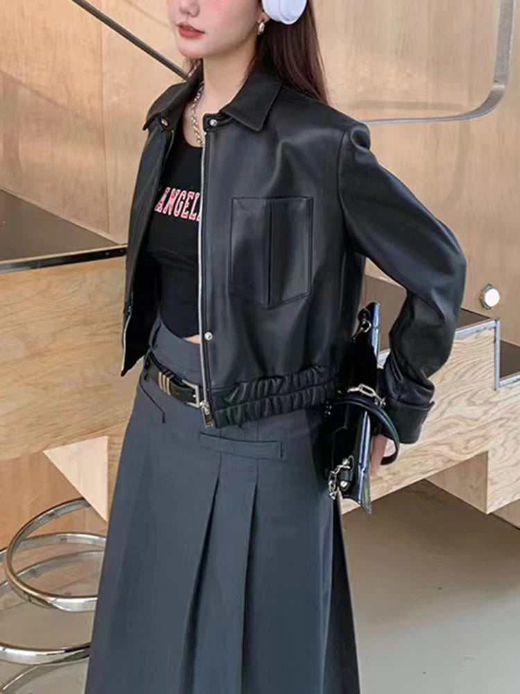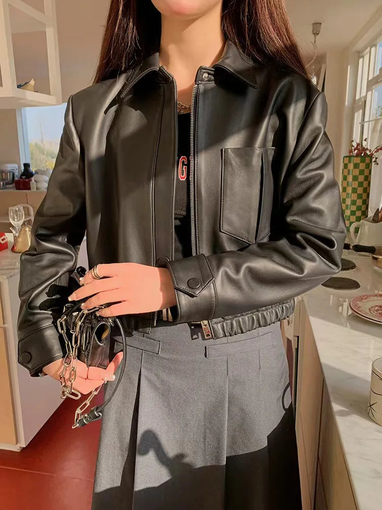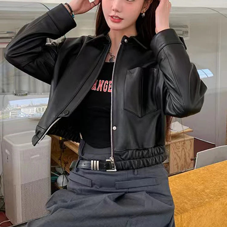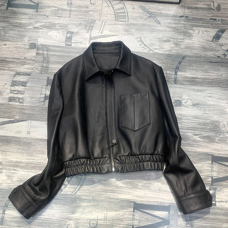 Women's Spring Real Sheepskin Street Style Lapel Zipper Elastic Hem Short Jacket