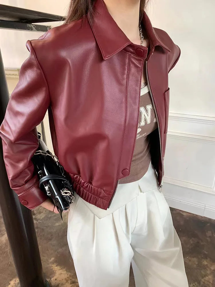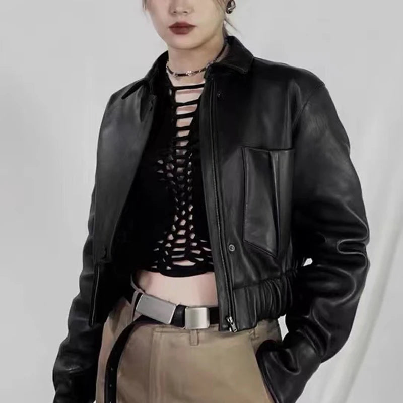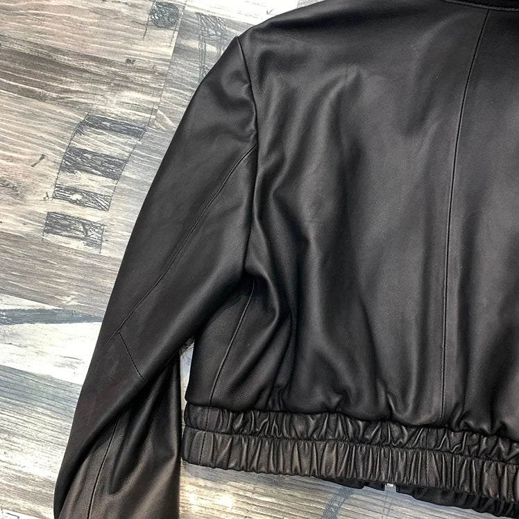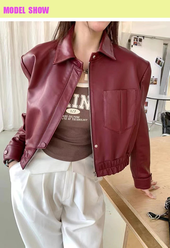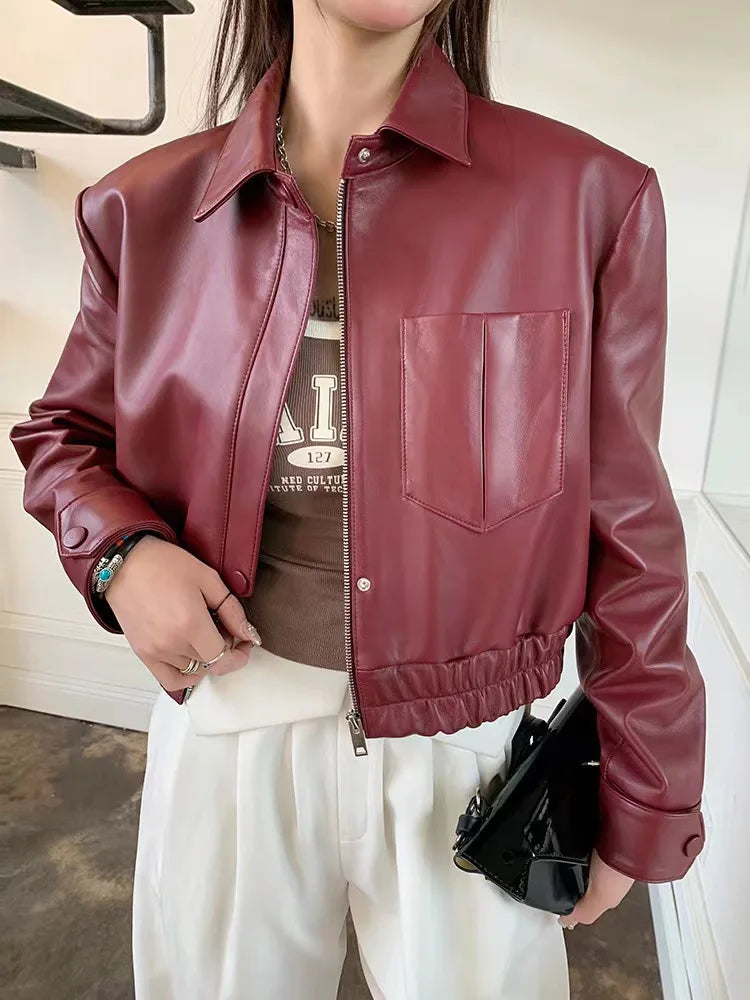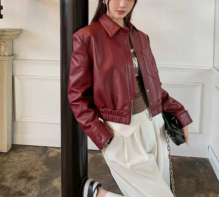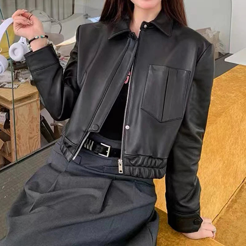Women's Spring Real Sheepskin Street Style Lapel Zipper Elastic Hem Short Jacket
