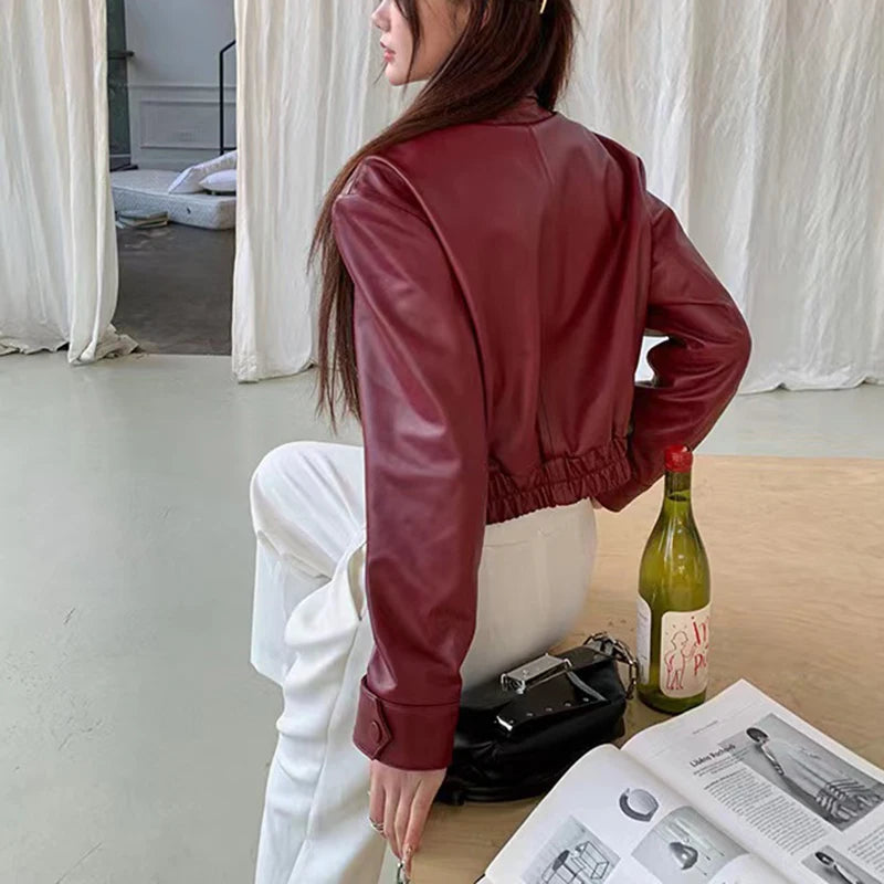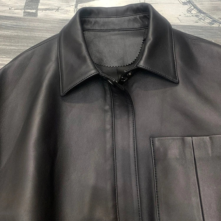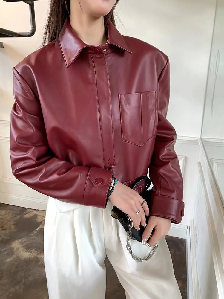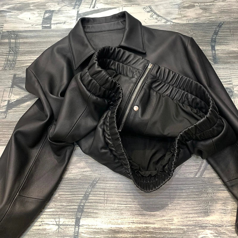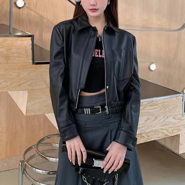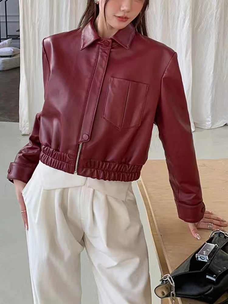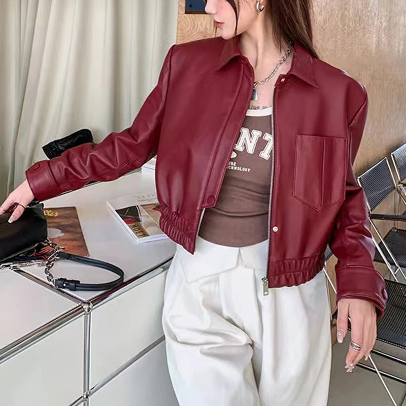 Women's Spring Real Sheepskin Street Style Lapel Zipper Elastic Hem Short Jacket