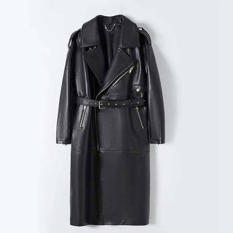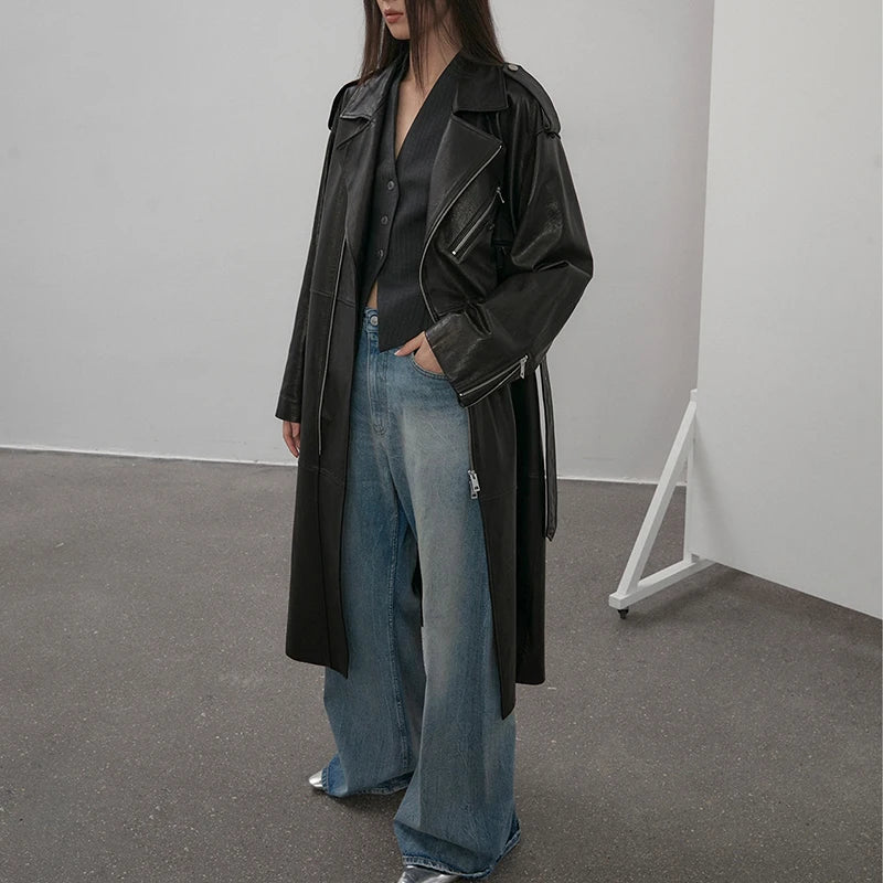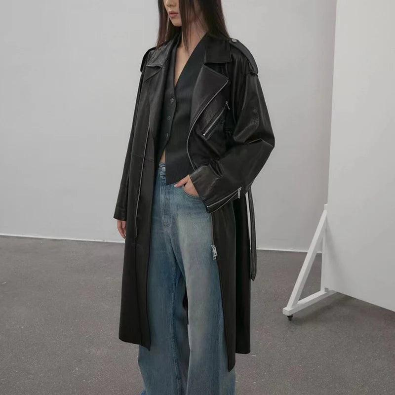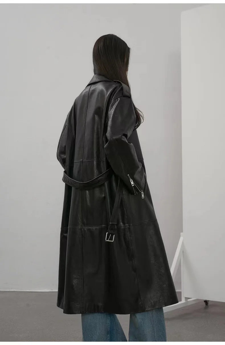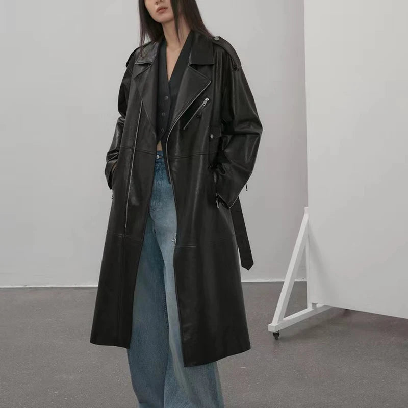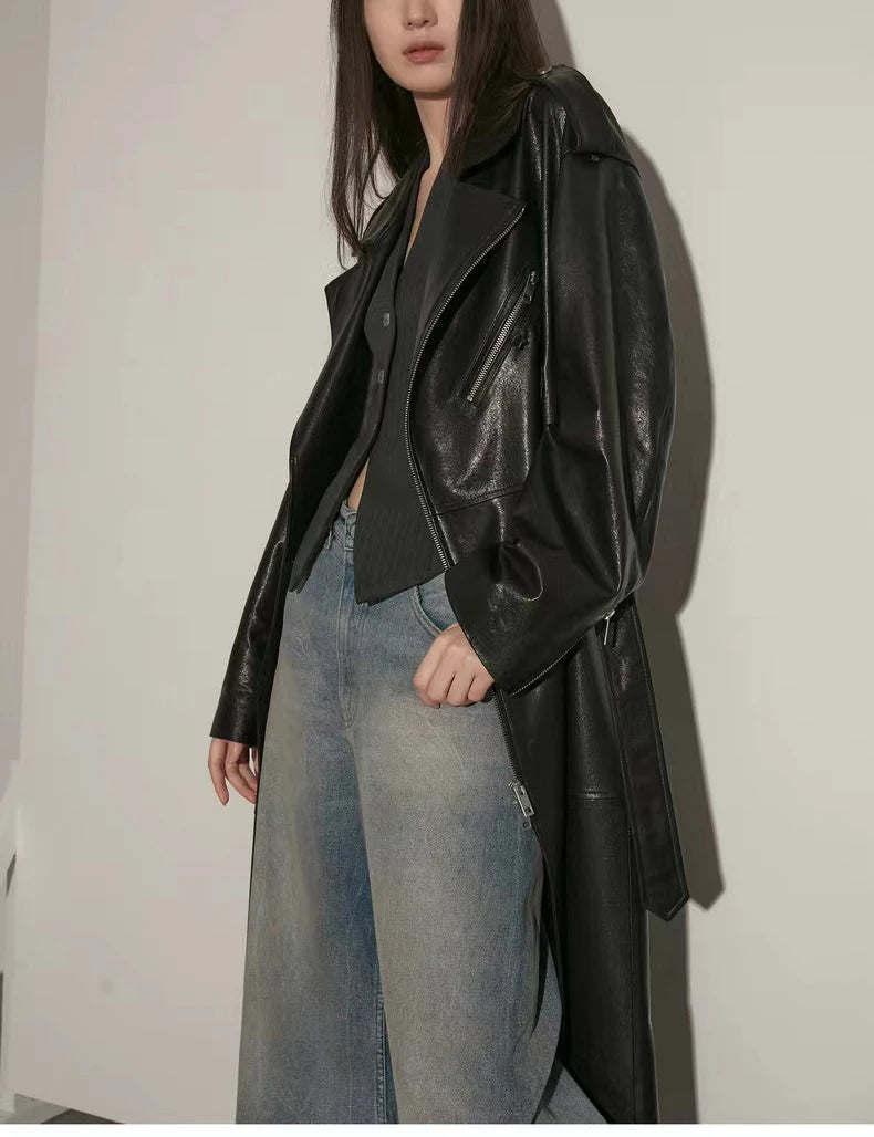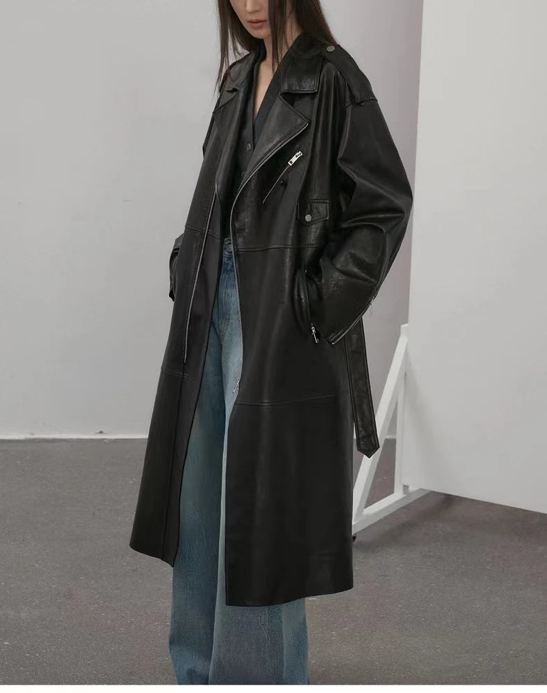 Women's Vegetable Tanned Sheepskin Loose Zipper Locomotive Long Trench Coat