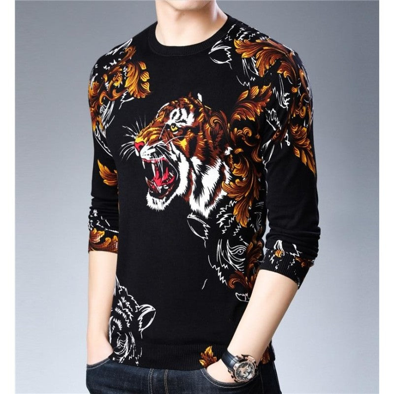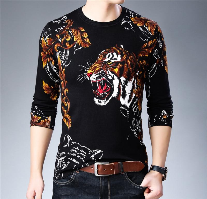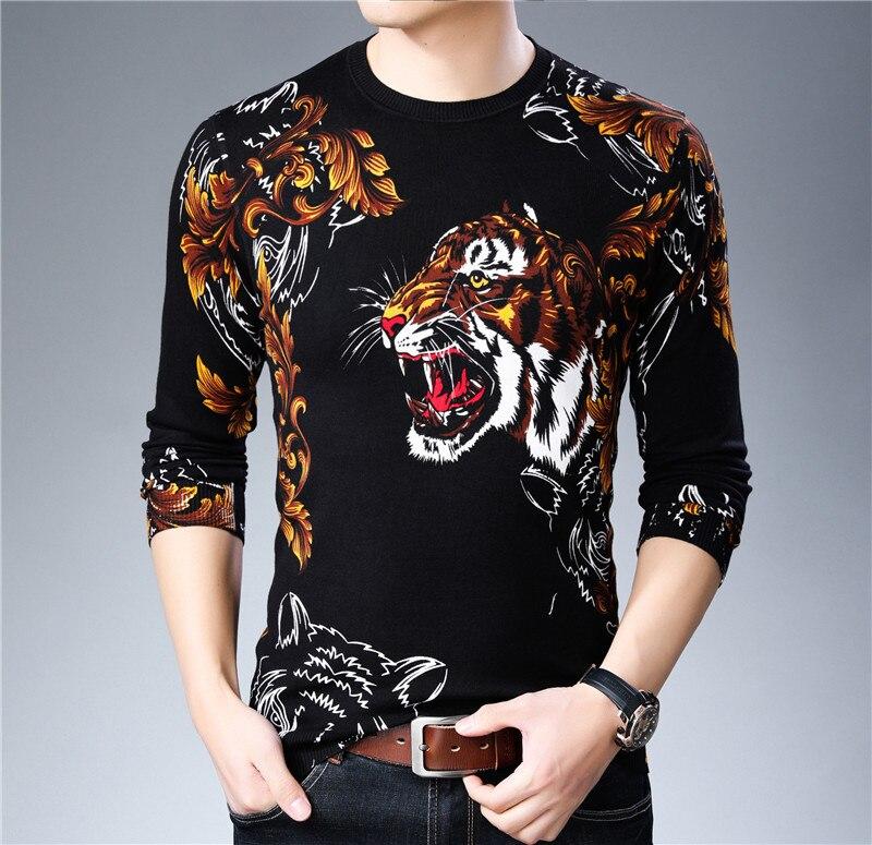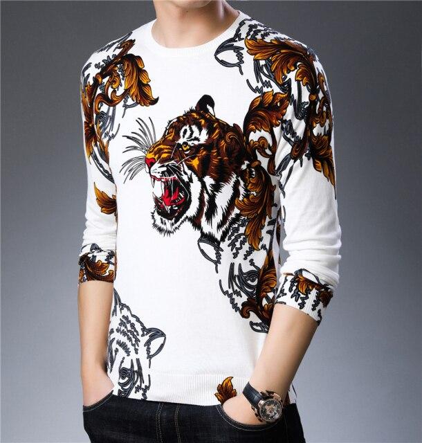 Spring England Style Men's Tiger Head Patterns Print O-neck Pullover Sweater