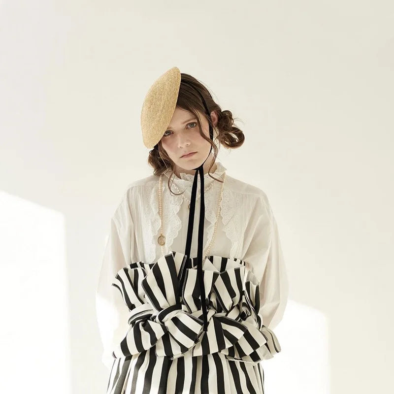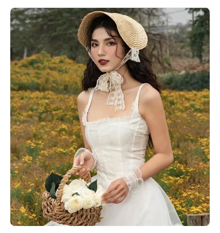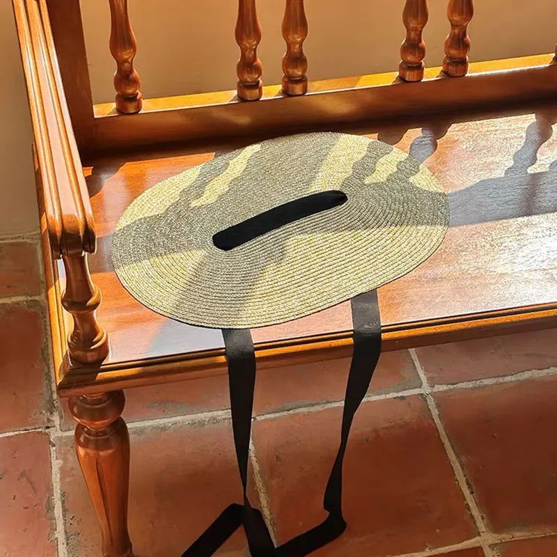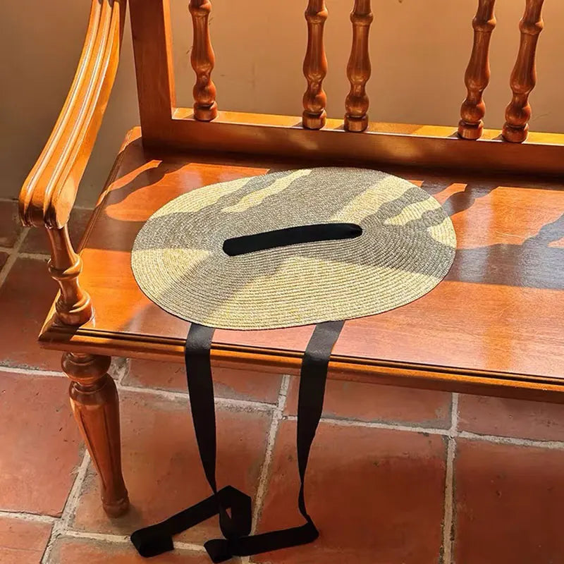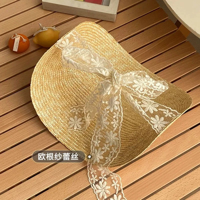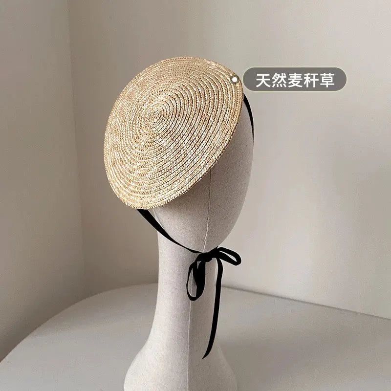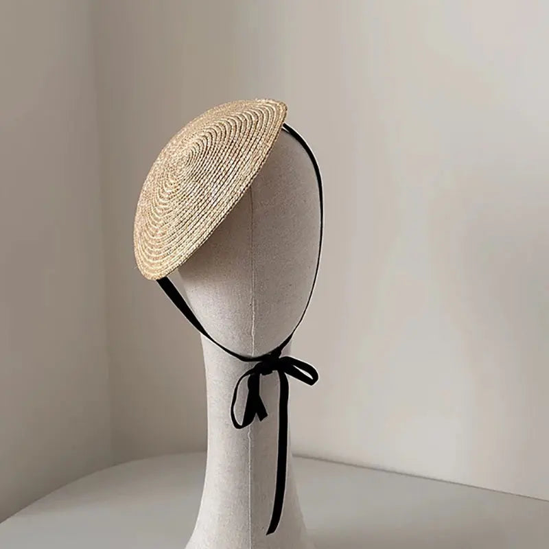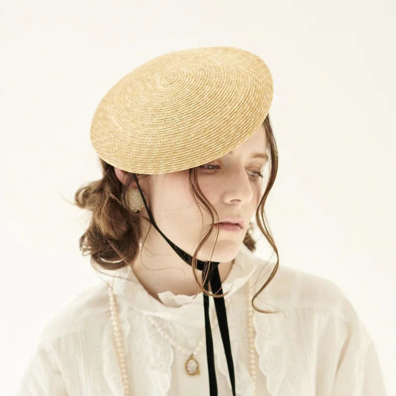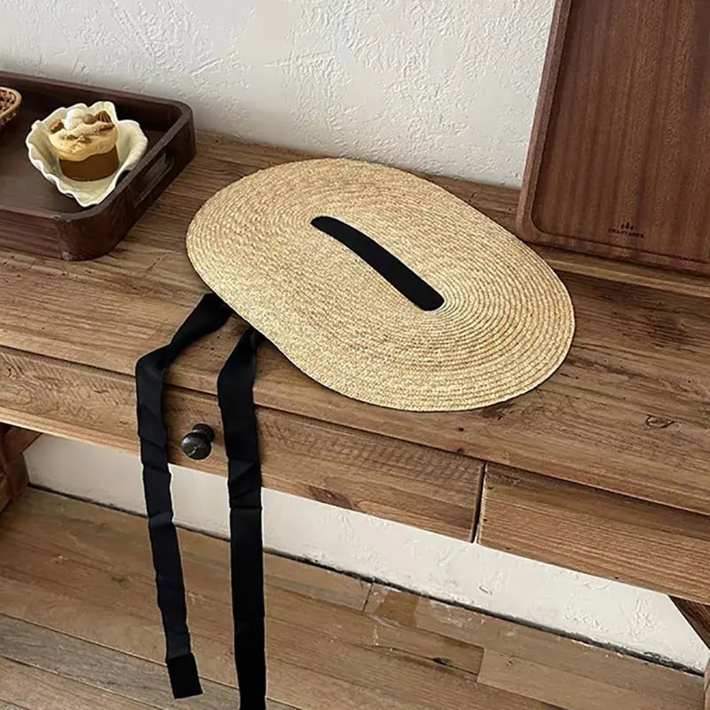 Women's One Piece French Vintage Natural Straw Sun Hat with Black Ribbon