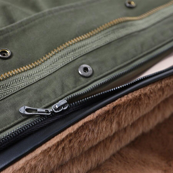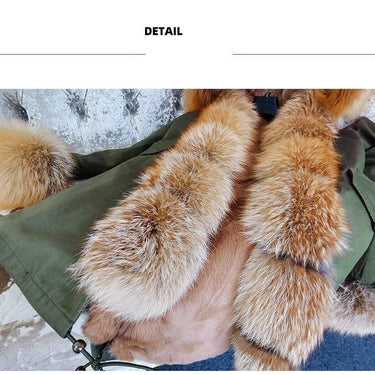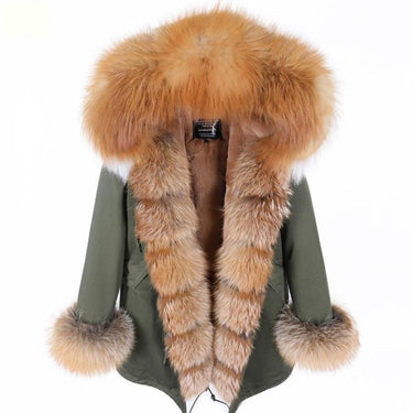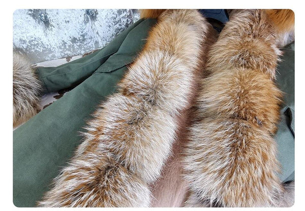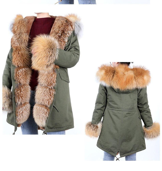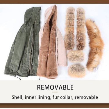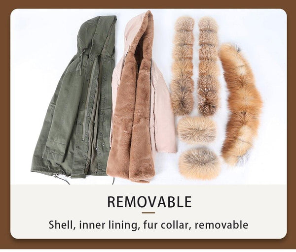 Army Green Women's Fox Fur Leather Hooded Long Detachable Coats & Jackets