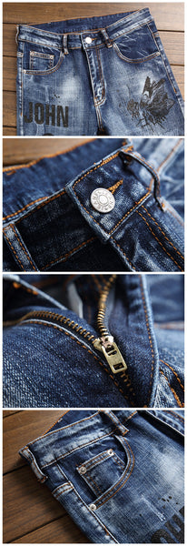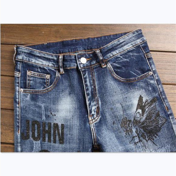 Men's American Letter Printed Slim Fit Elastic Casual Skinny Jeans Pants