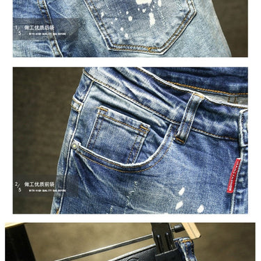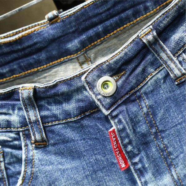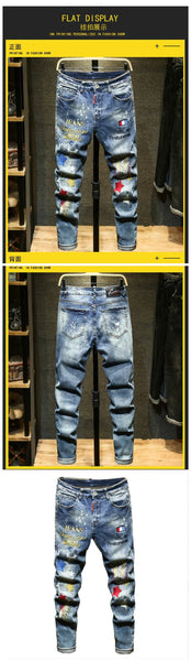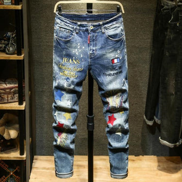 Men's Blue Embroidery Streetwear Stretch Casual Ripped Skinny Jeans Pants