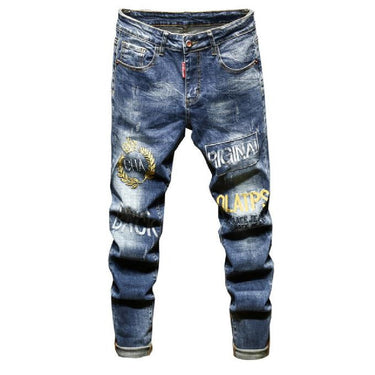 Men's Casual Letter Printing Embroidery Mid Waist Stretch Skinny Jeans Pants