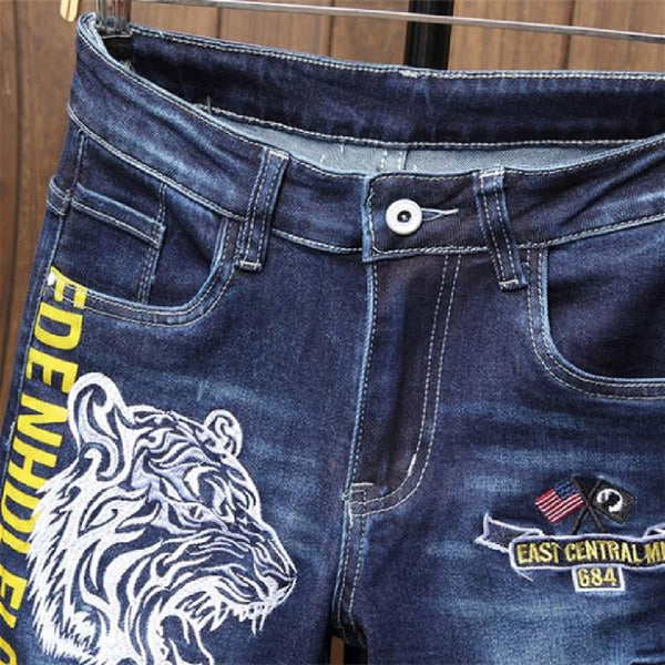 Take your style to the next level with these men's jeans that draw inspiration from the hip-hop culture. The remarkable embroidery design adds a touch of novelty and charm. Made from high-quality tencel material, these jeans offer comfort and durability. With a button fly closure and mid-waist, they combine functionality with style. Make a statement with these fashionable jeans featuring eye-catching embroidery details.