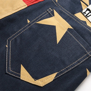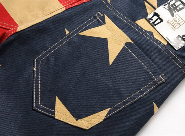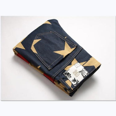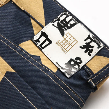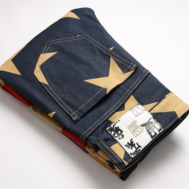 Exude endless style with these alluring men's trousers, featuring a captivating contrast color print pattern work. The convenient zipper feature ensures easy and secure closure. Crafted with the best quality denim, these skinny jeans embody a worldly appeal. The glorious spliced decoration adds an enticing touch, making them a hot-selling choice for fashion-forward individuals.