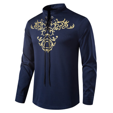 Men's Retro Printed Pullover Closure Lace Up Long Sleeve Casual Shirt