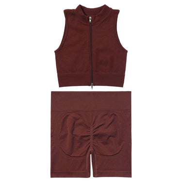 Women's Brown Seamless Double Zipper Top Elastic Waist Shorts Yoga Outfit