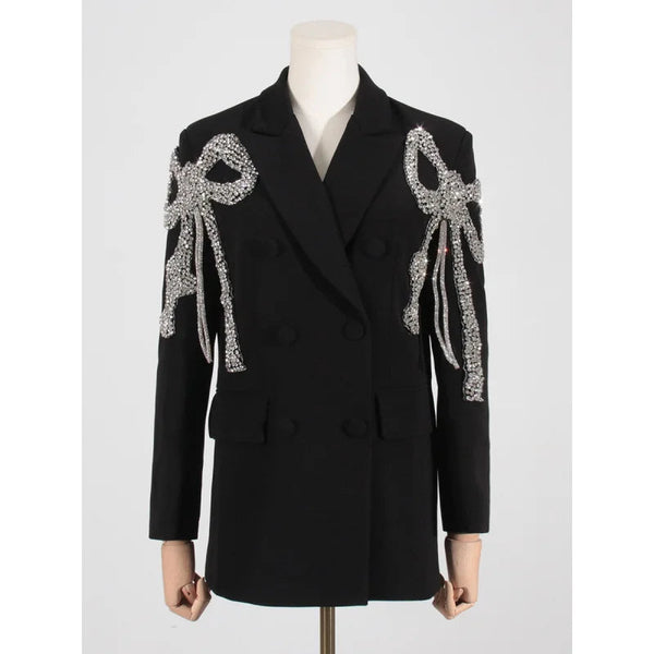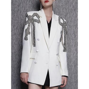 Women's Polyester Notched Collar Long Bow Diamonds Beaded Blazer