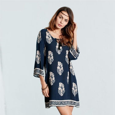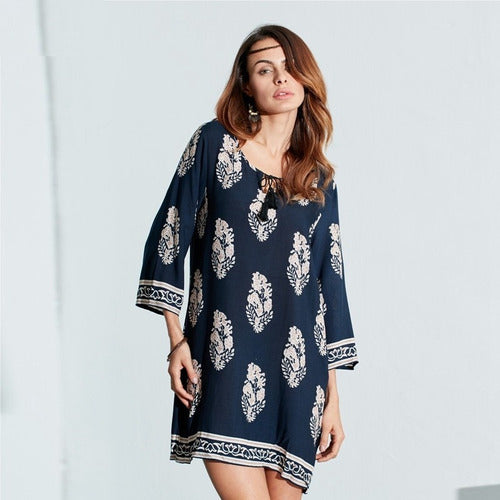 If you want to look sleek and sexy in an attractive mini dress, then this is the one. Grab this bohemian styled women's dress that looks stunning in loose silhouette feature. The three quarter regular styled sleeves have complimented the looks of the dress in the best way. Even the O-neck is worth appreciating along with the natural waistline. Cotton and rayon mixed material will render super comfort.