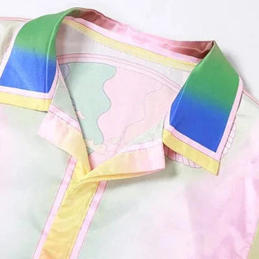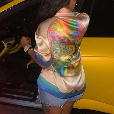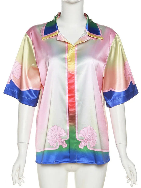 Women's Summer Silky Landscape Printed Loose Short Sleeve Blouse Tops