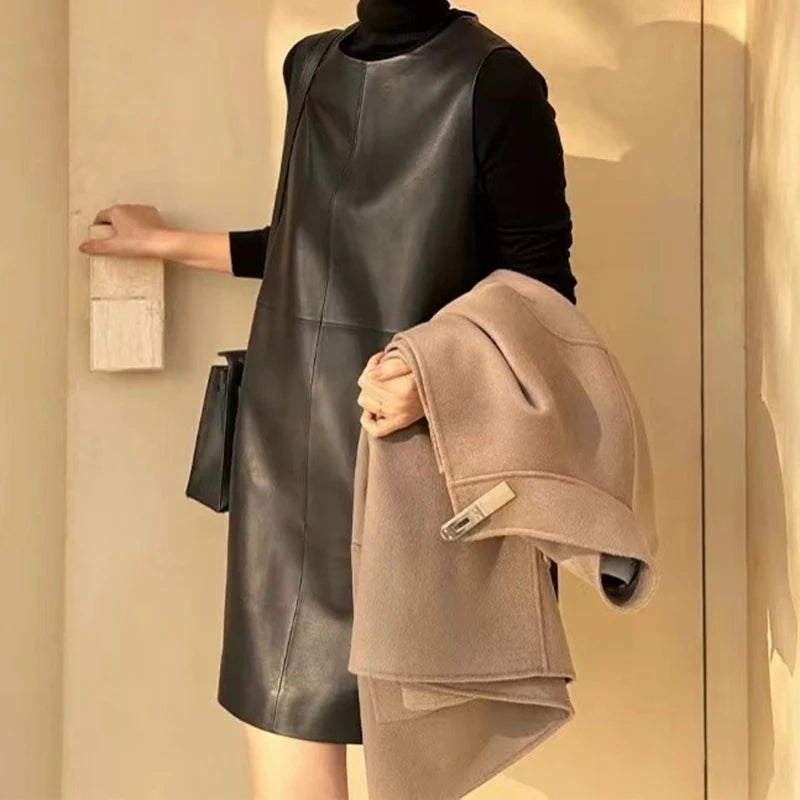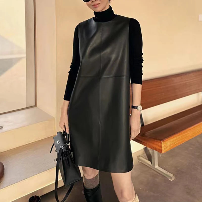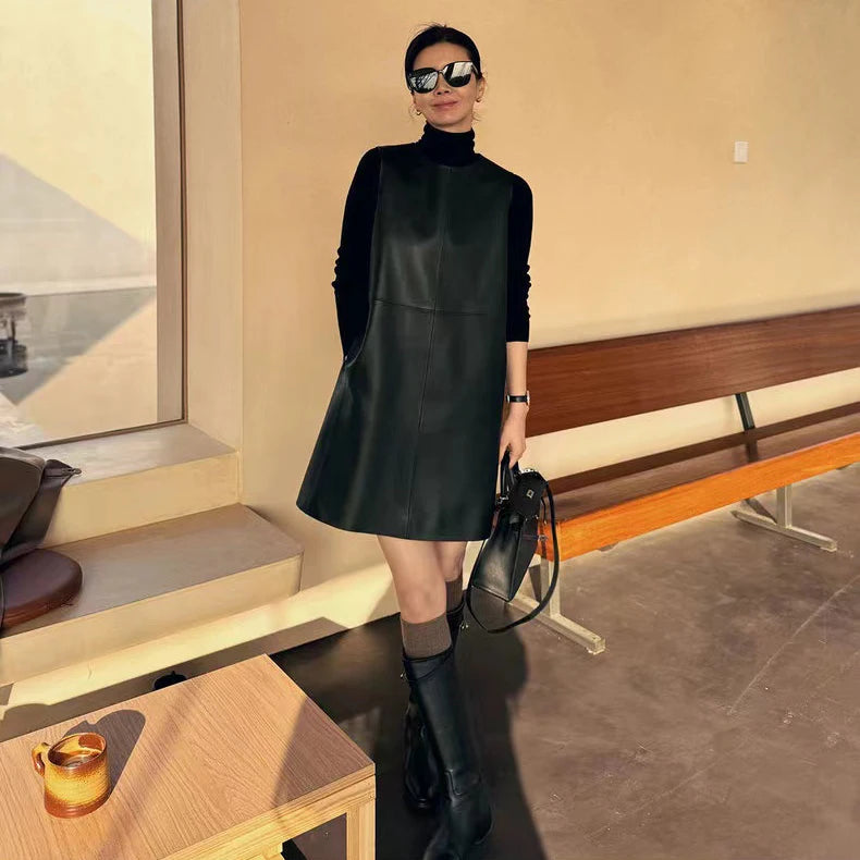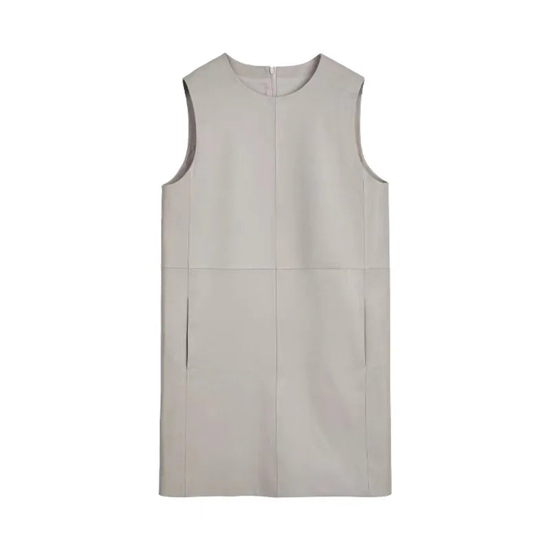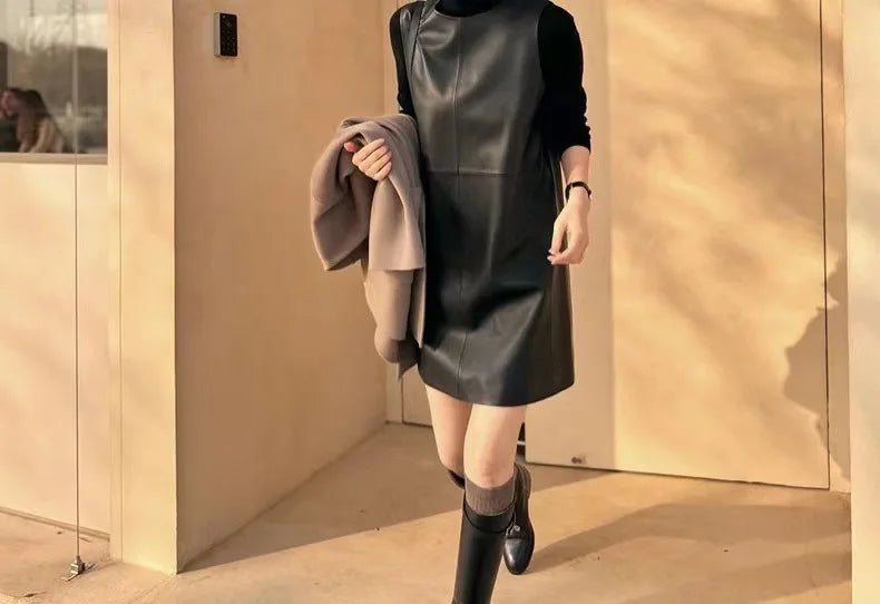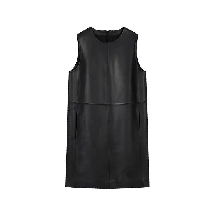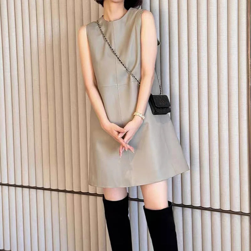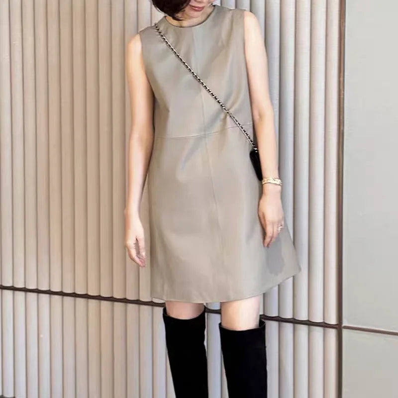 Classic Retro O-Neck Sleeveless Sheepskin Straight Short Dress for Women