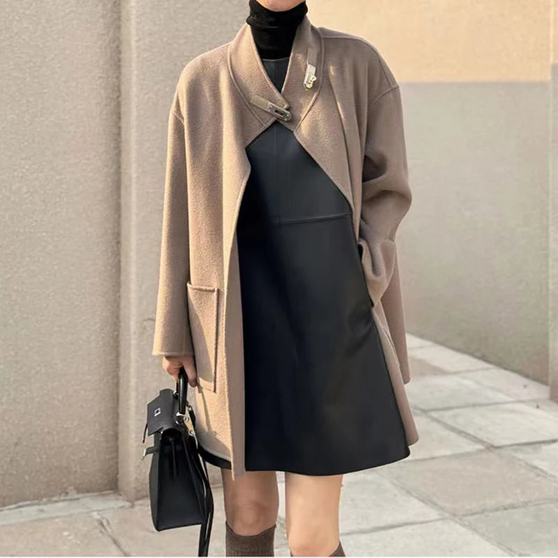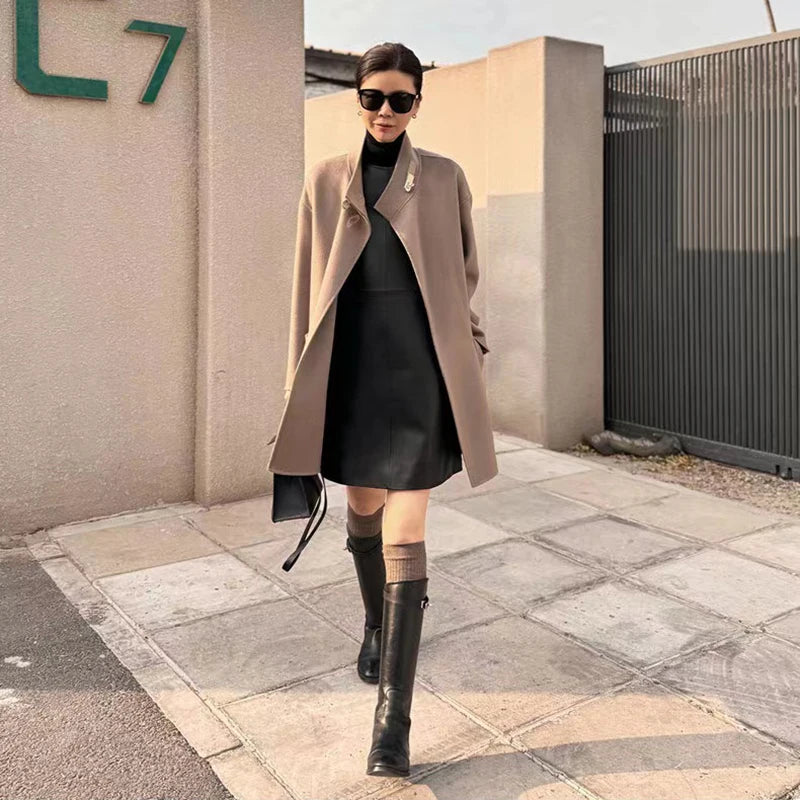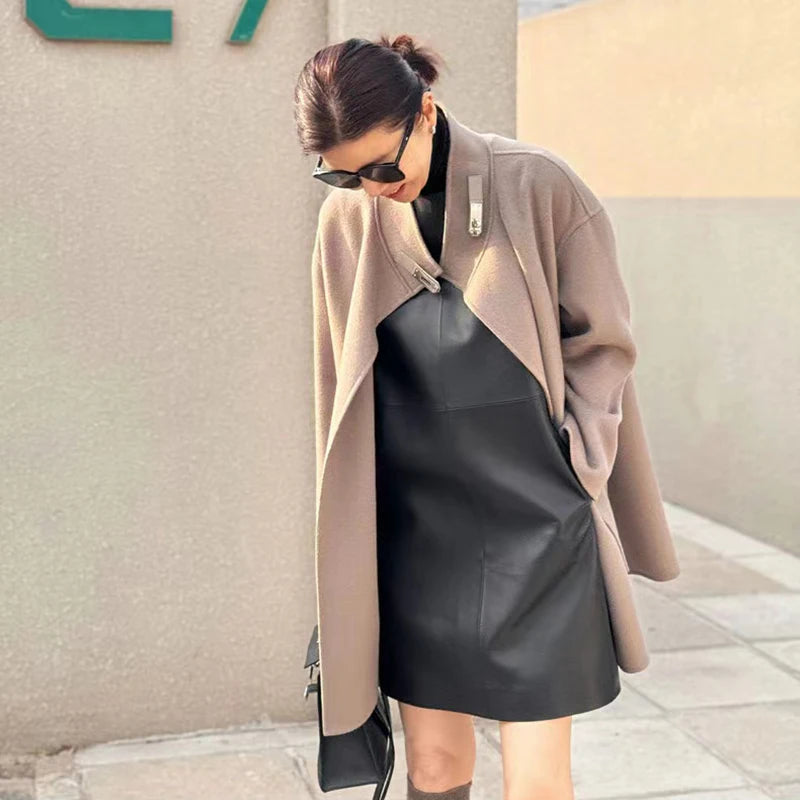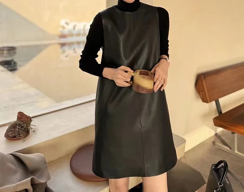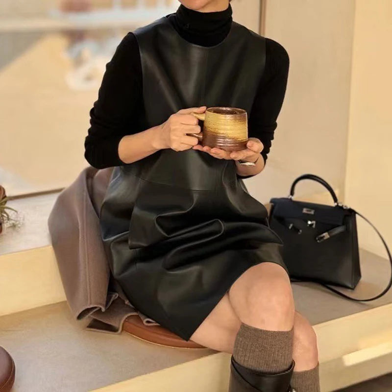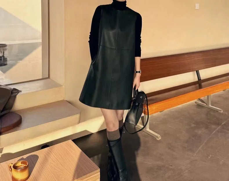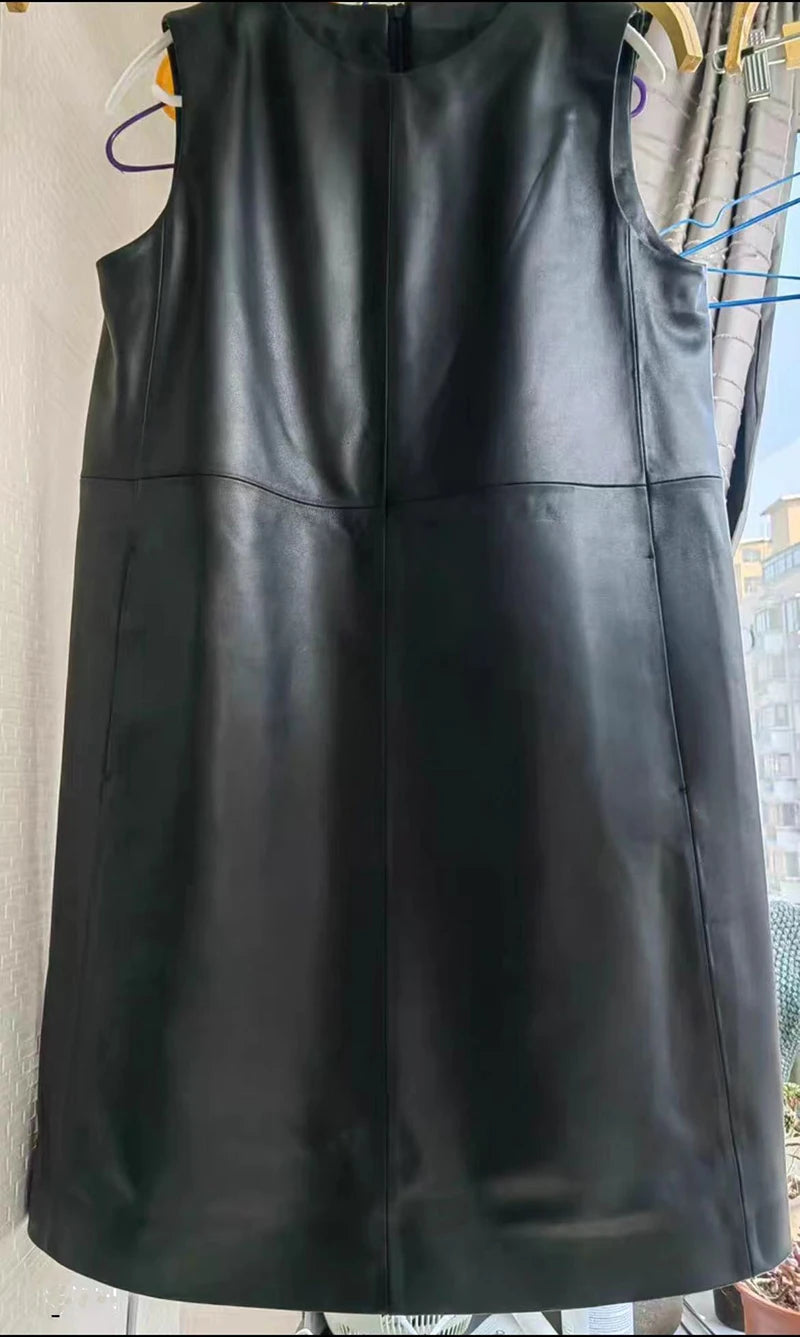 Classic Retro O-Neck Sleeveless Sheepskin Straight Short Dress for Women